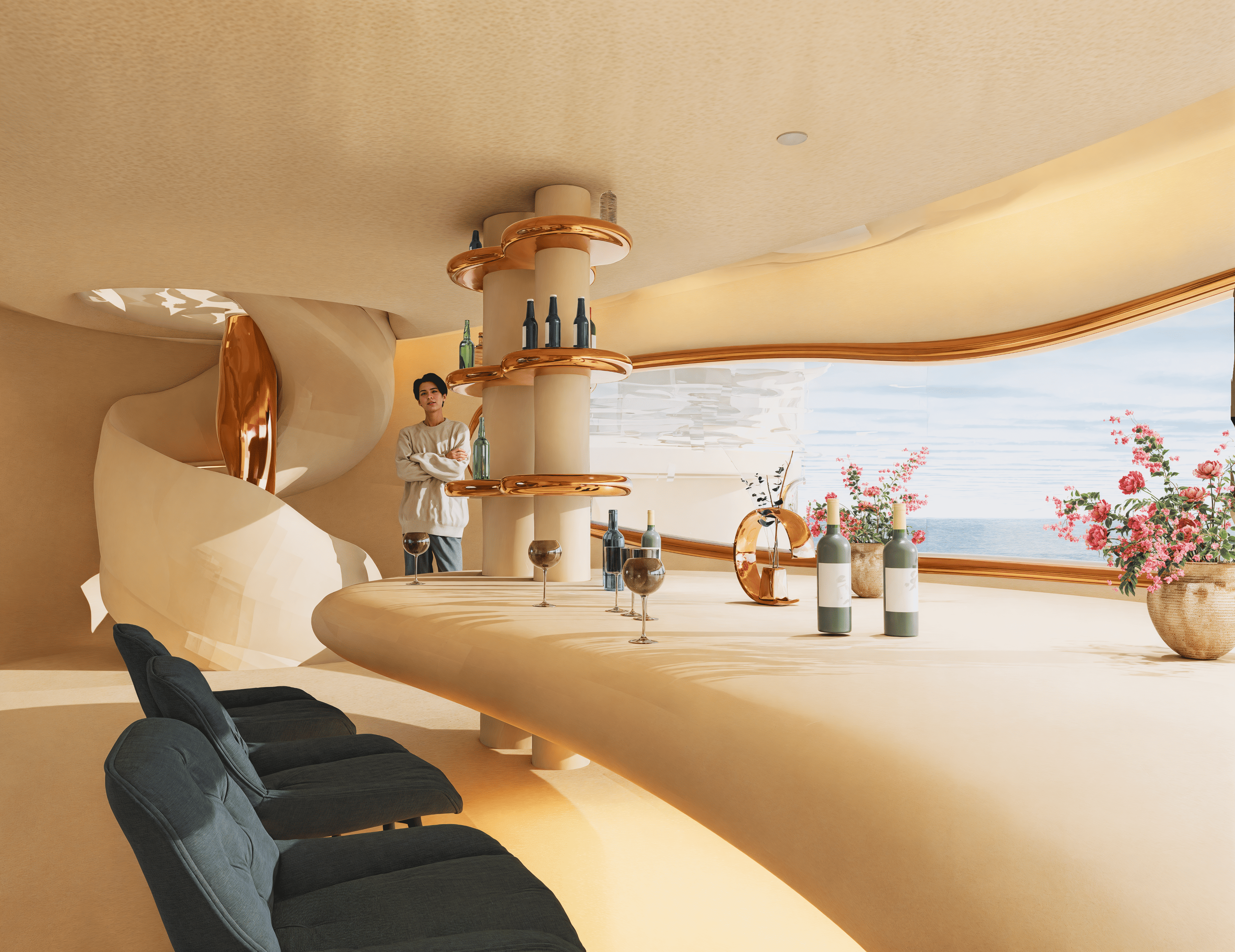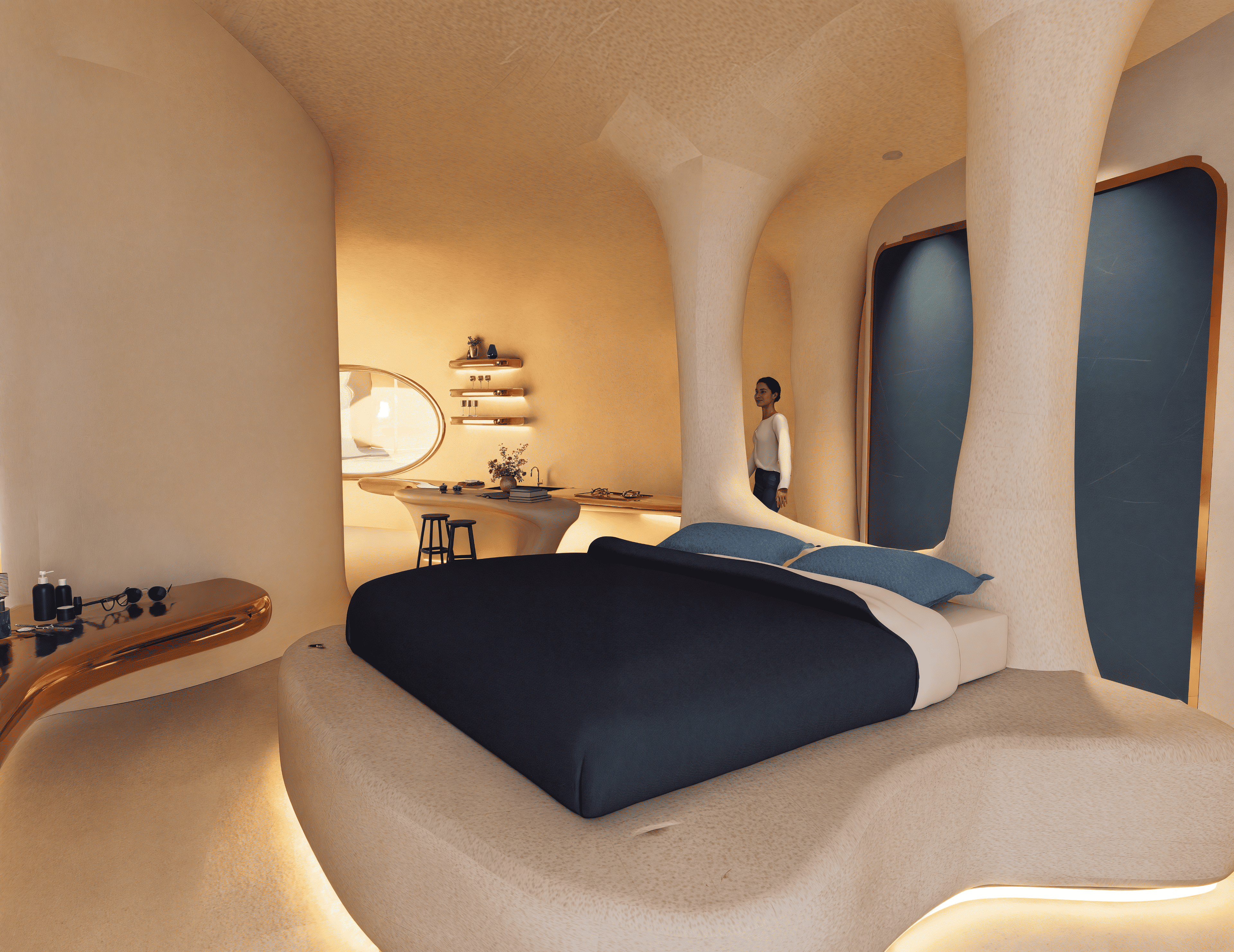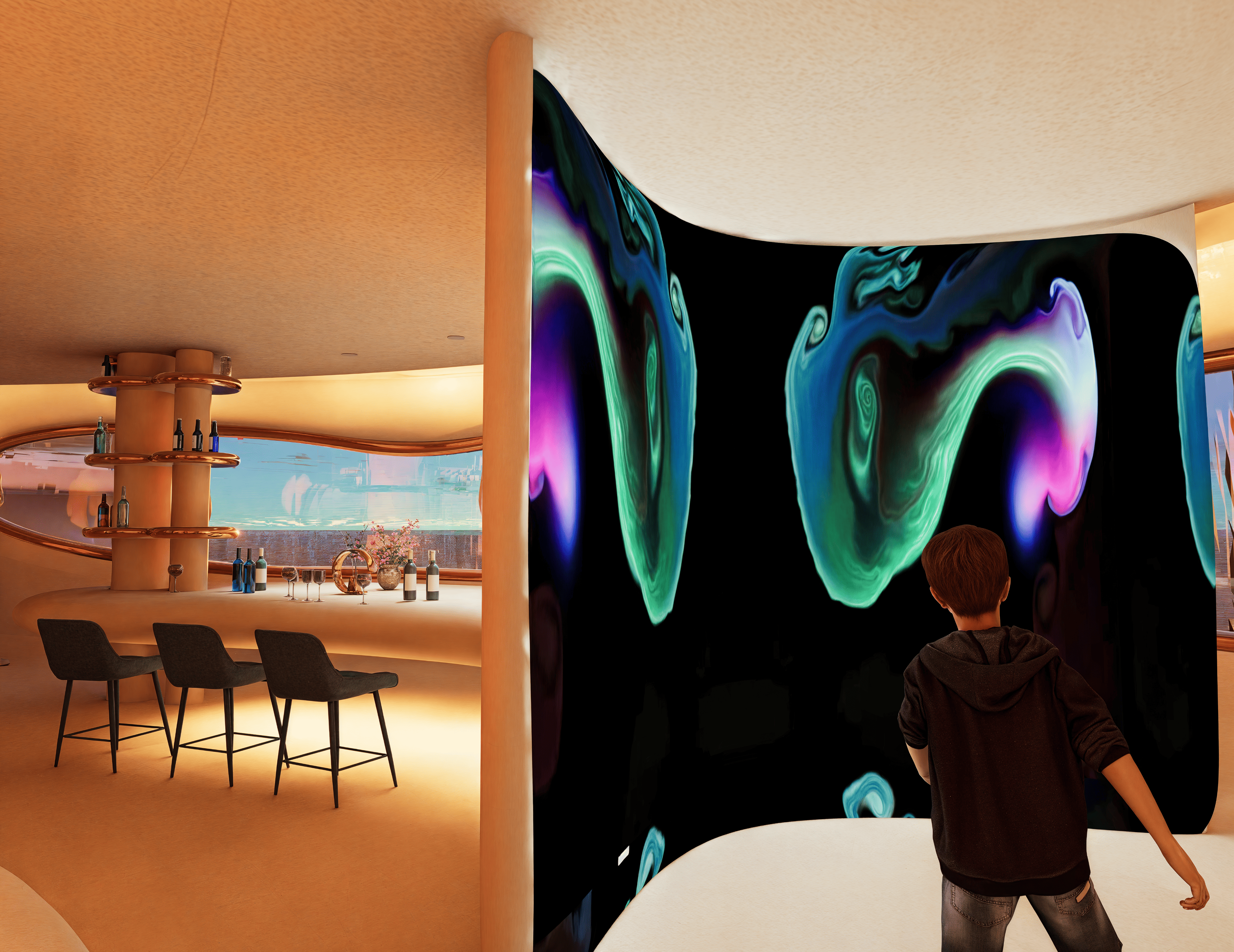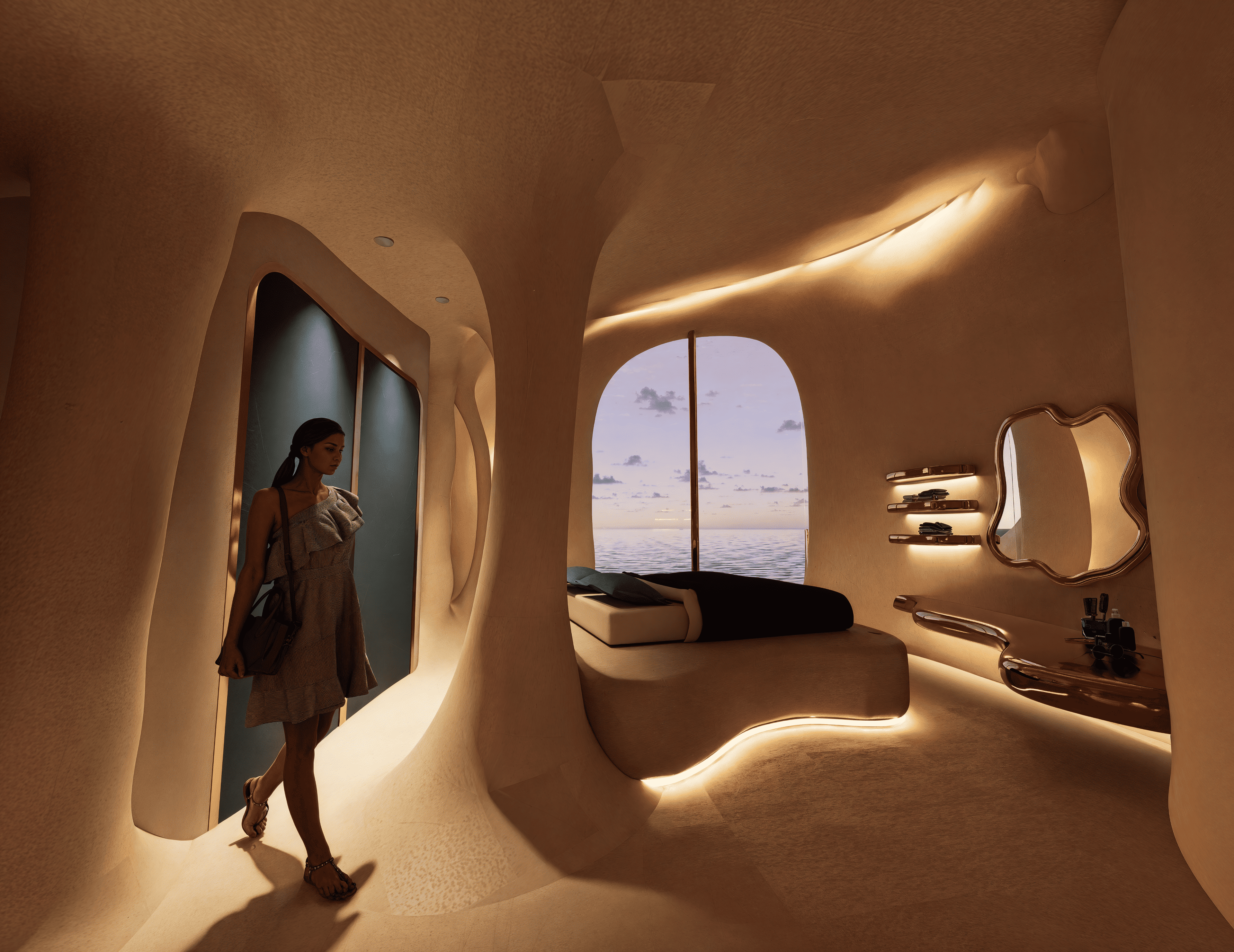 No two souls are alike—so why should two spaces be? “Eterna” is a redefinition of hospitality at sea, where every curve is carved not by hand, but by metaphor. Inspired by the timeless force of water, the design mimics how it shapes caves—eroding, sculpting, revealing. Guests descend into a world of intimacy through an underwater tunnel, echoing the path of flowing water. Each room becomes a personal cavern—raw yet refined, immersive yet grounded—offering tailored experiences through spatial rhythm, light play, and material tactility. From sensorial textures to sculptural lighting, the space flows like nature itself—curved, organic, and without corners—mirroring the erosion of time and water that carves every cave uniquely. Here, the suite is not merely a shelter but an extension of the guest’s inner world. Every room is entirely personalized—no two experiences are ever the same—because the architecture doesn’t just host you; it listens, adapts, and becomes you. Eterna invites guests to surrender to silence, fluidity, and the slow luxury of being seen—through a sustainable, soulful design that is timeless in spirit and boldly reimagines the future of immersive hospitality.