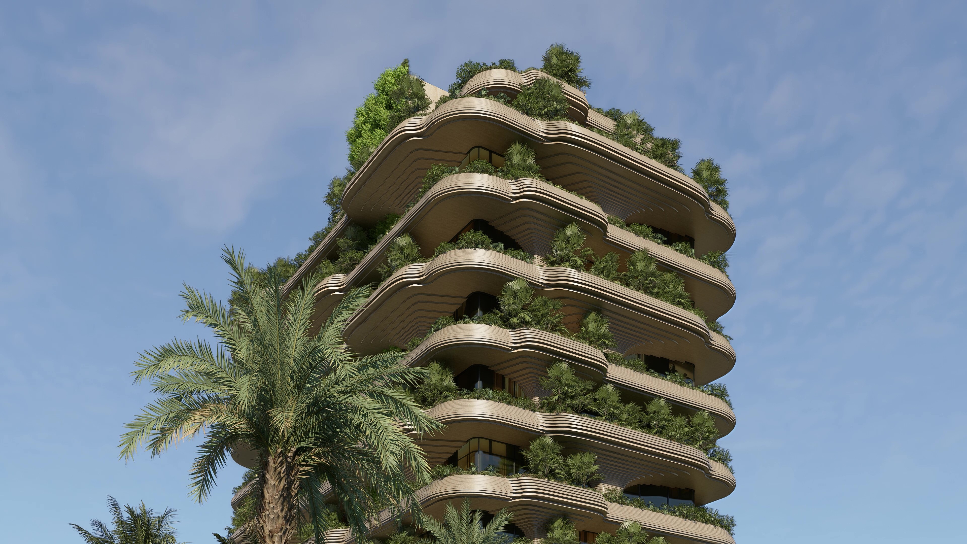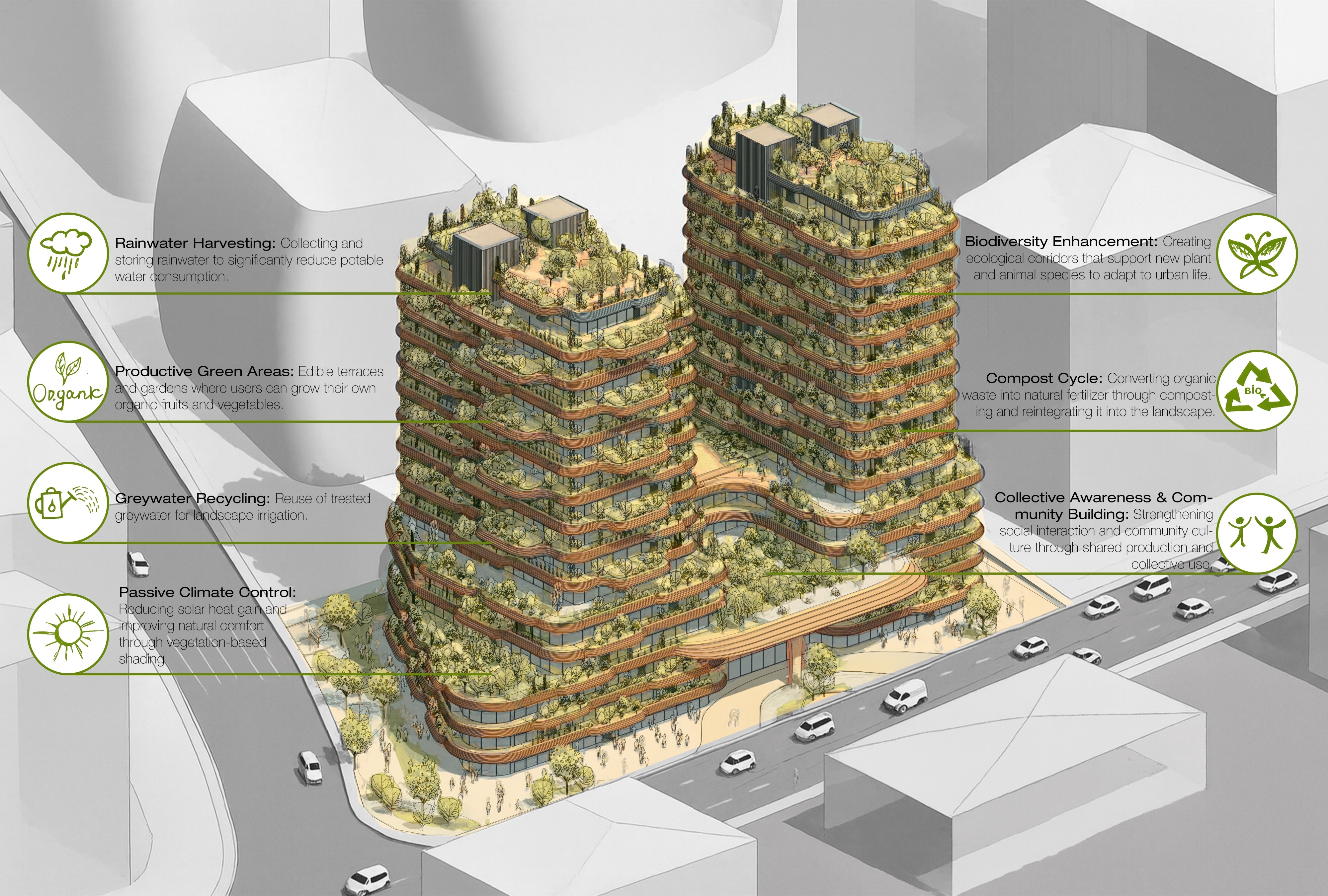 Through productive gardens on every floor, the building forms a self-sustaining micro-ecosystem that supports organic cultivation while acting as an environmental buffer, reducing heat gain and allowing the structure to function like a living organism. Integrated systems such as rainwater harvesting, greywater recycling, and composting embed natural cycles into everyday life.