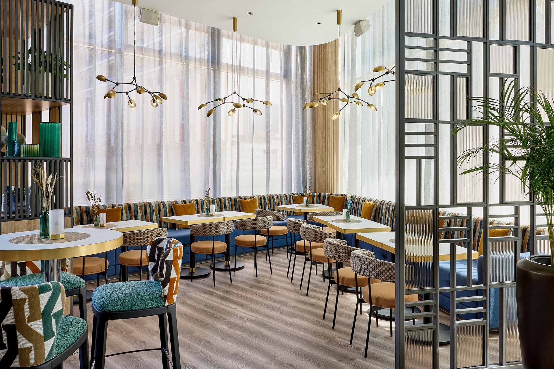 Conceptualized as “A Modern Taste of Berlin,” the space captures the city’s transformation—from its historic past to its current role as a global creative hub—through a thoughtful mix of tactile materials, curated lighting, and locally inspired details. The design emphasizes flexibility and atmosphere, offering intimate banquet seating, open-plan dining, and a vibrant bar lounge and terrace. Carefully selected finishes—such as brass accents, acoustic panels, fluted glass, and textured faux leathers—enhance both visual richness and acoustic comfort. Pops of color, artistic lighting, and custom furnishings create a warm, inviting ambiance that evolves from day to night.