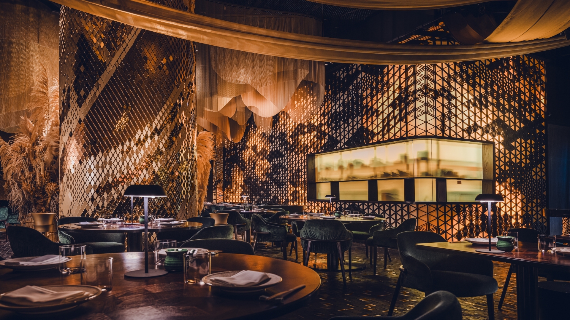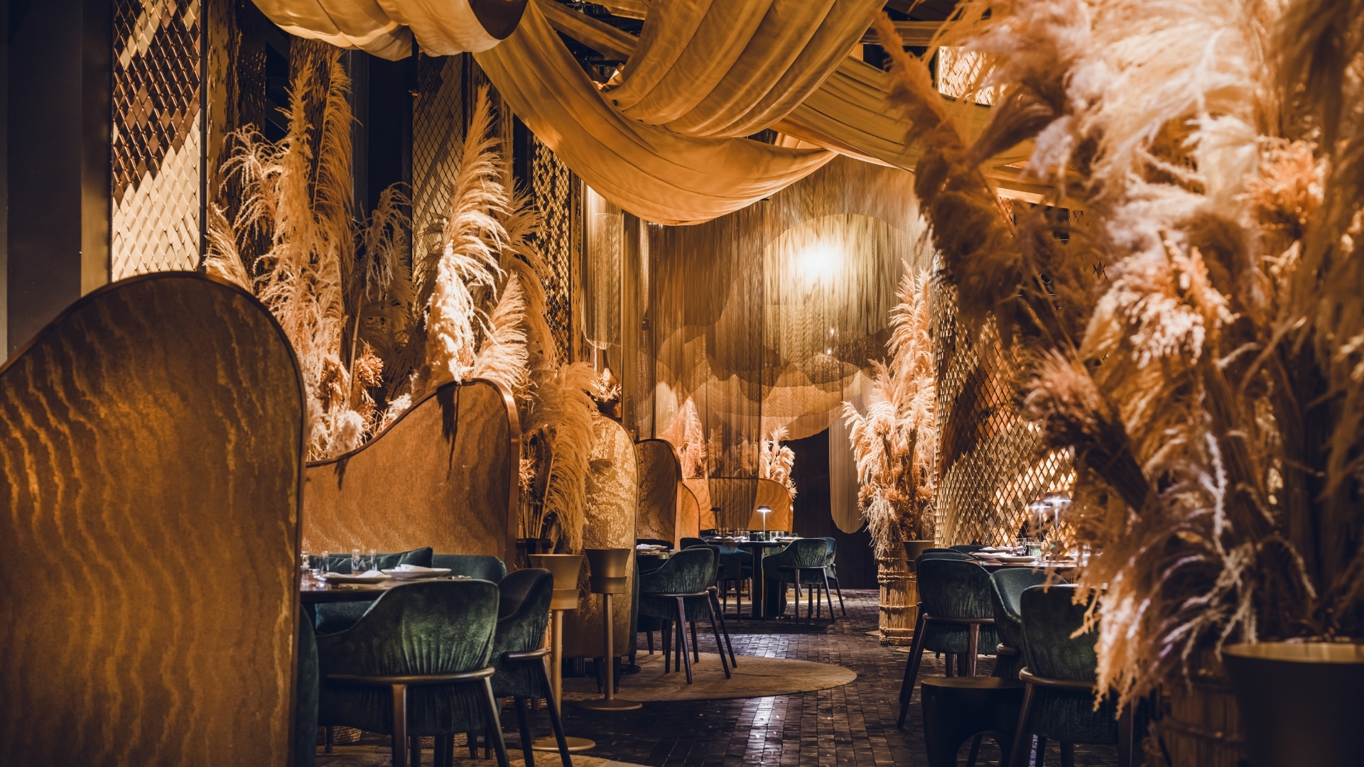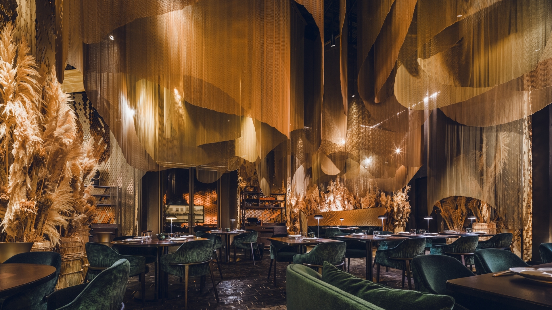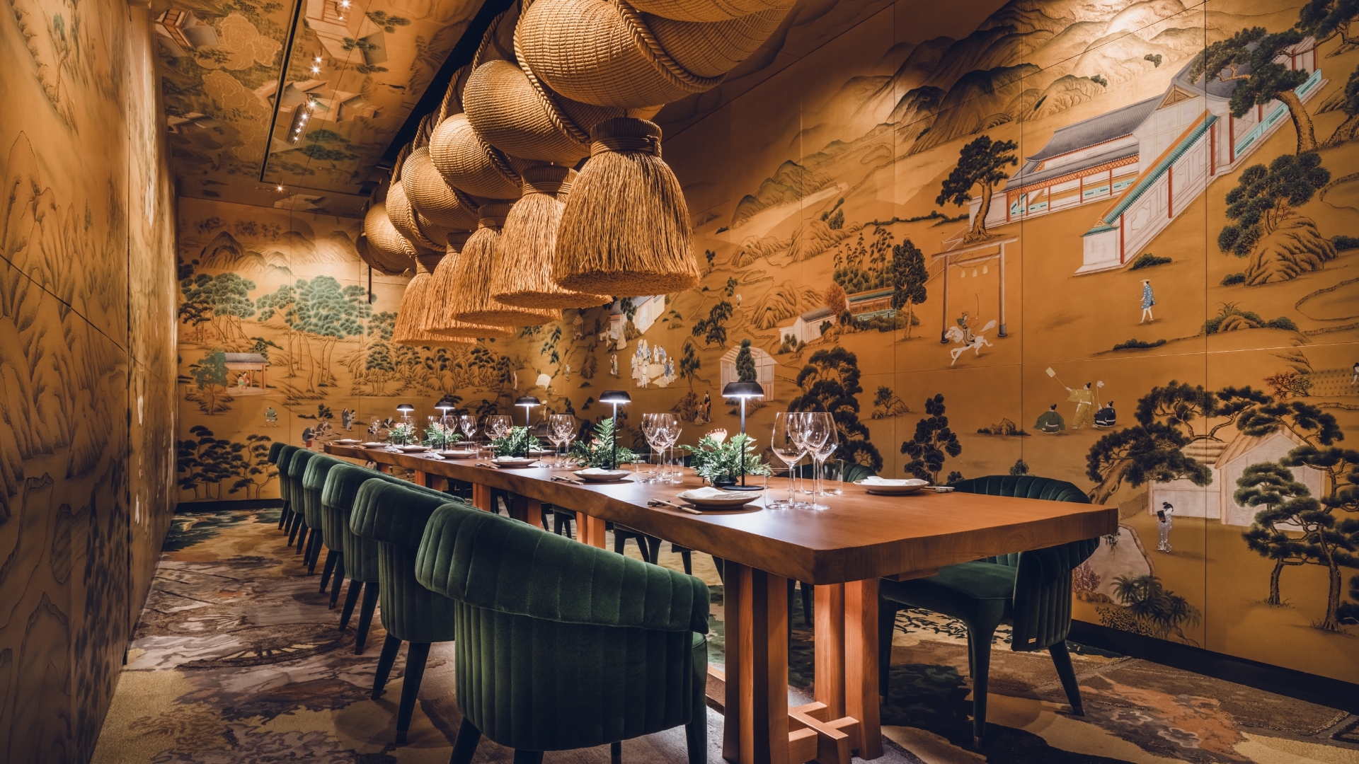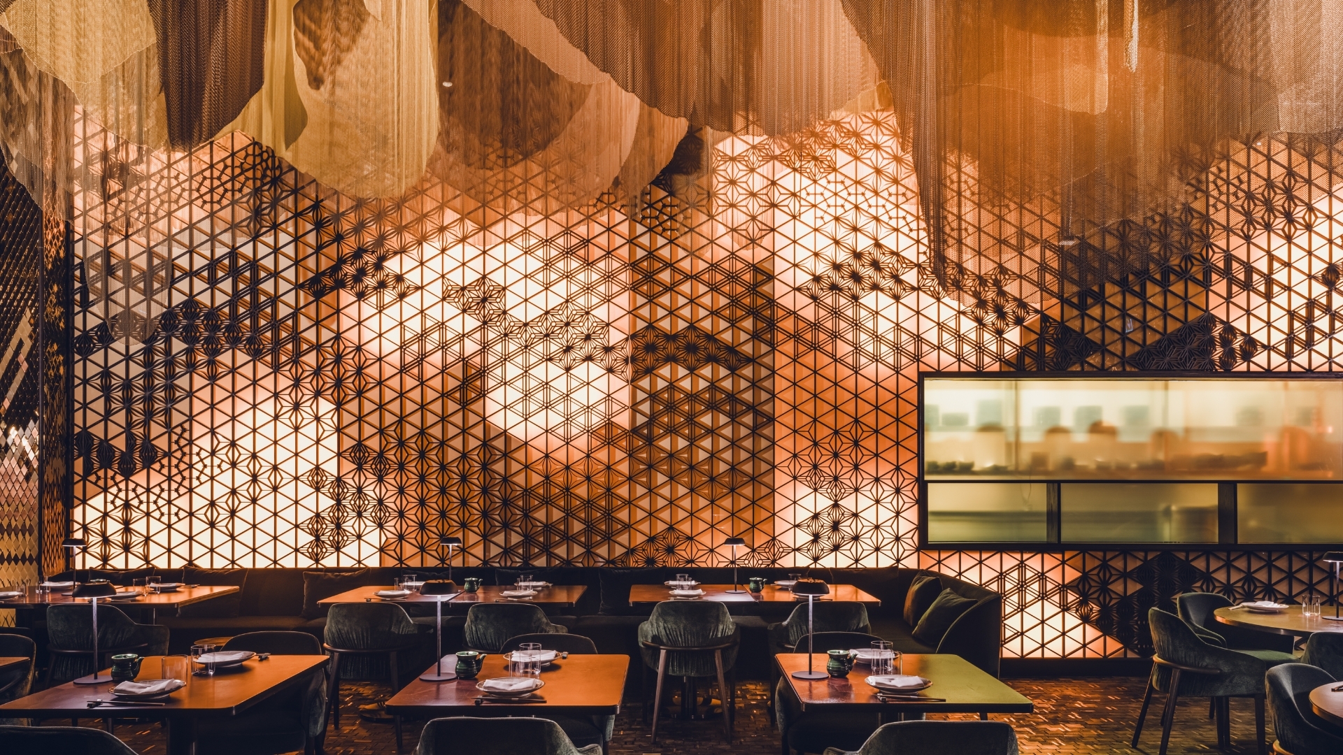 In the Grill Room, a butcher’s block, DJ station, and rice straw bins lead to a Warayaki grill beneath a hand-beaten brass hood. Gold and timber tiles reflect light, while jade tiles and lit shelves display curated artefacts. A layered silk canopy draws attention to an illuminated void, with sculpted tile columns complementing a Kumiko screen. The Kumiko Room showcases traditional joinery and shadowplay, with velvet emerald seating, straw bales, and gold moiré panels.