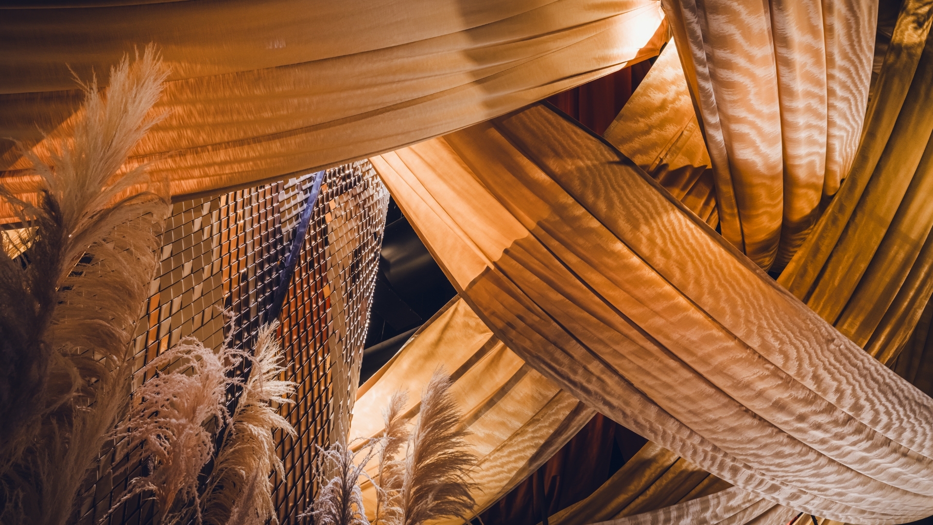 The Gold Lounge Bar features illuminated bamboo, suspended rods, and communal seating around a glowing globe symbolizing the harvest sun. Straw bales are wrapped in powder-coated rods, framed by hand-printed gold silk panels depicting rice straw.