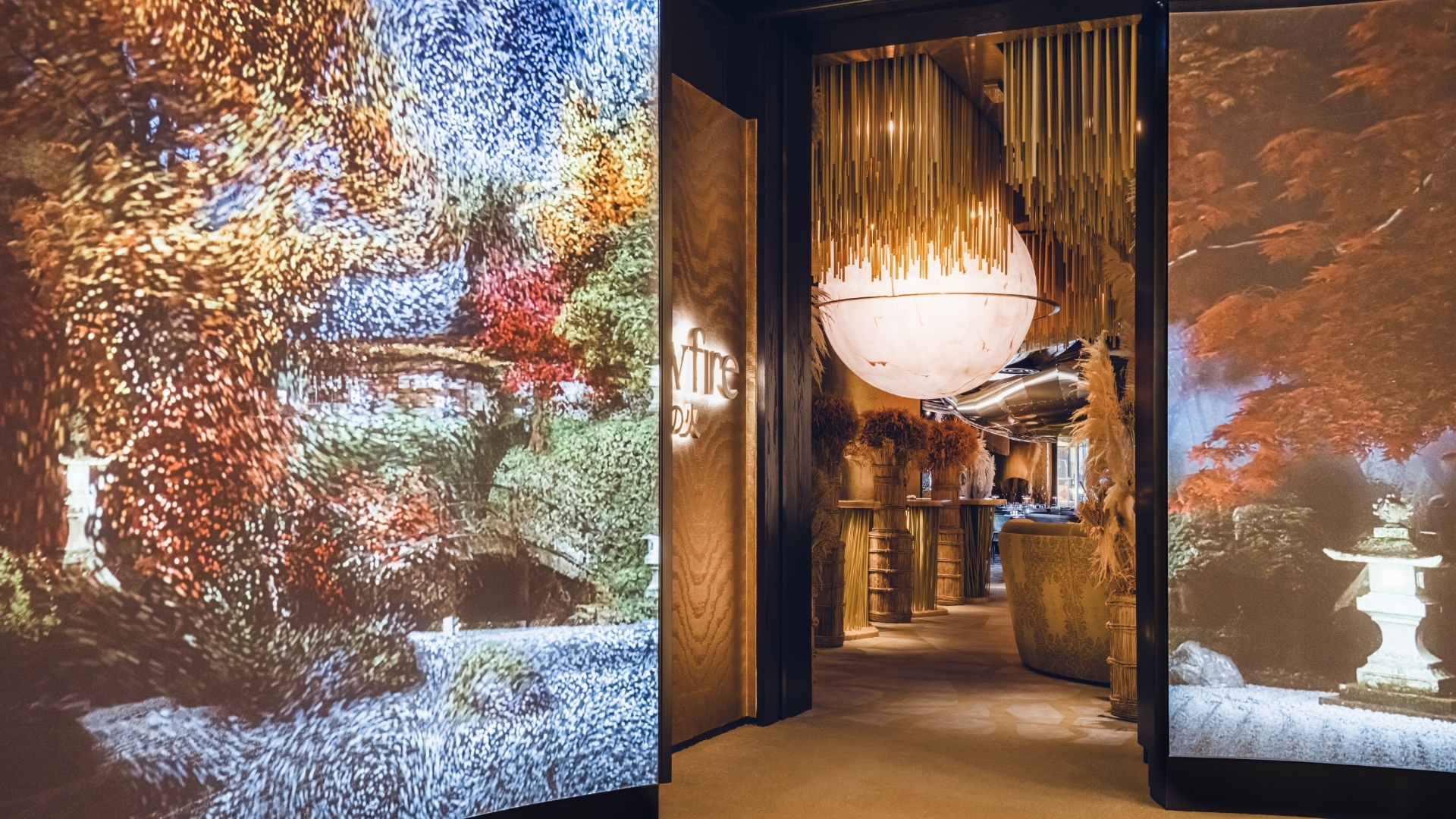 Strawfire draws inspiration from Japanese rural traditions, celebrating rice straw craftsmanship, communal gathering, and cultural rituals. The entrance offers a dynamic experience, with a curved interactive screen displaying motion-responsive video, transforming the arrival into a spectacle.