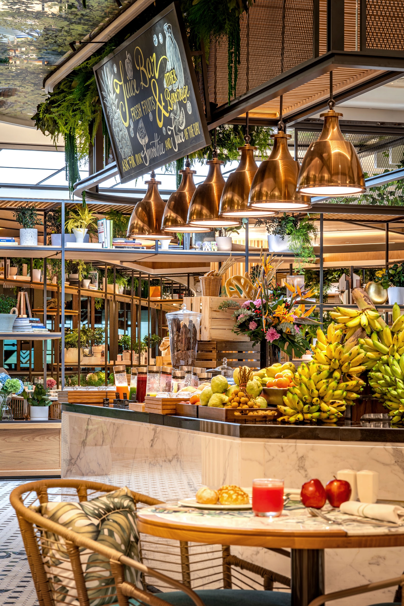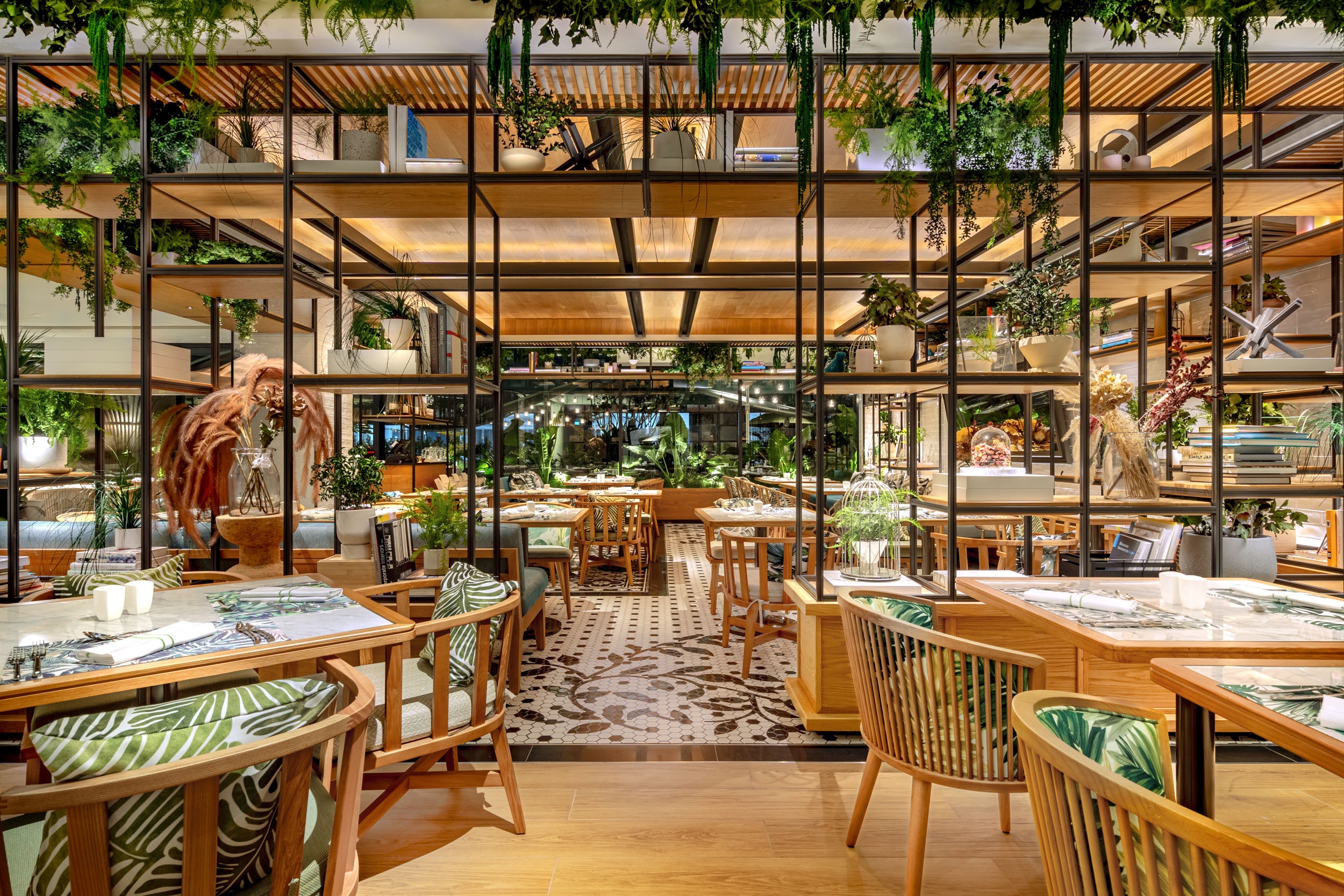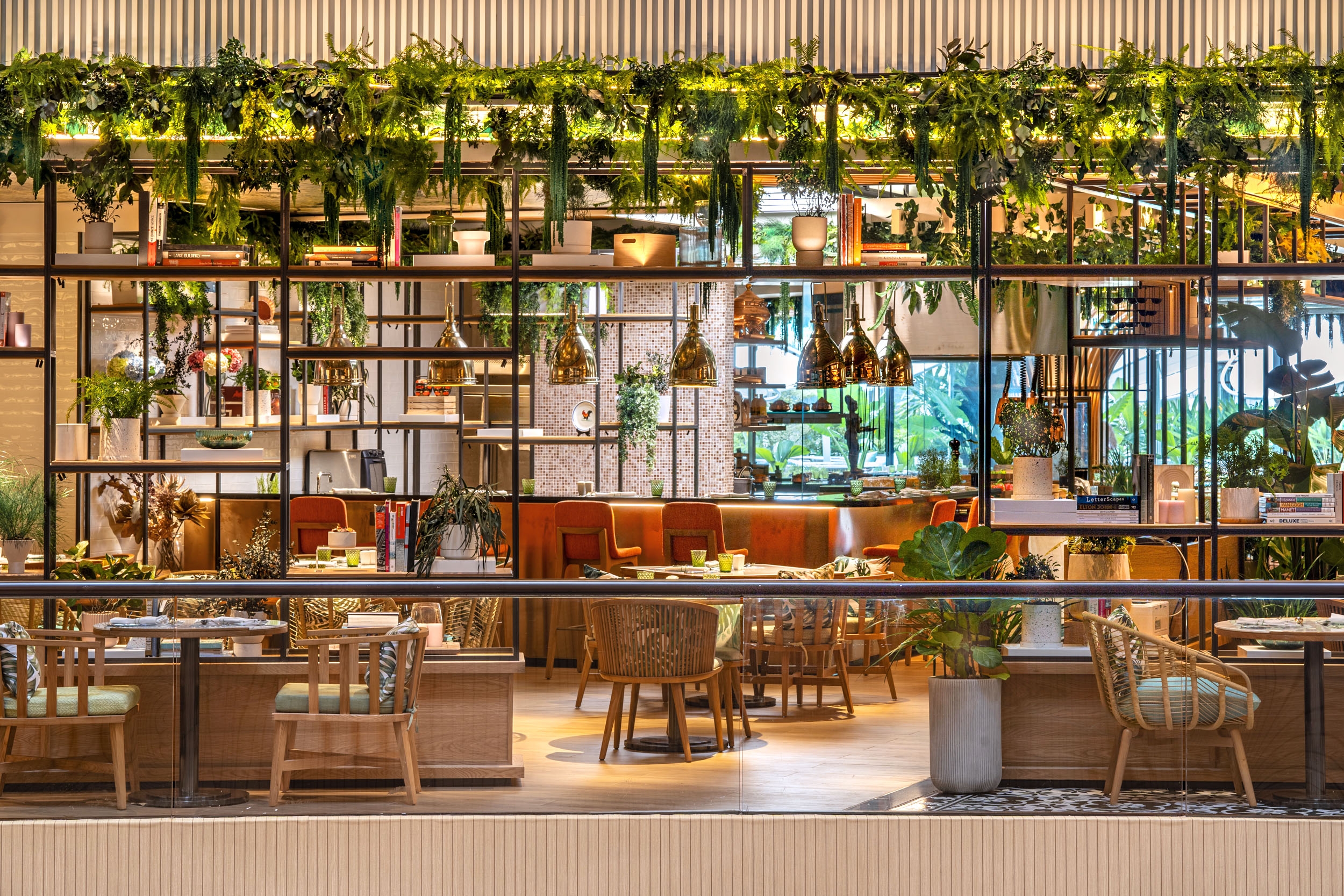 The renovation transformed the space, opening the façade to the atrium, adding an additional 50 seats at the rear of the extended outlet where we connect the interiors with the exterior landscaped gardens, also designed by us.
