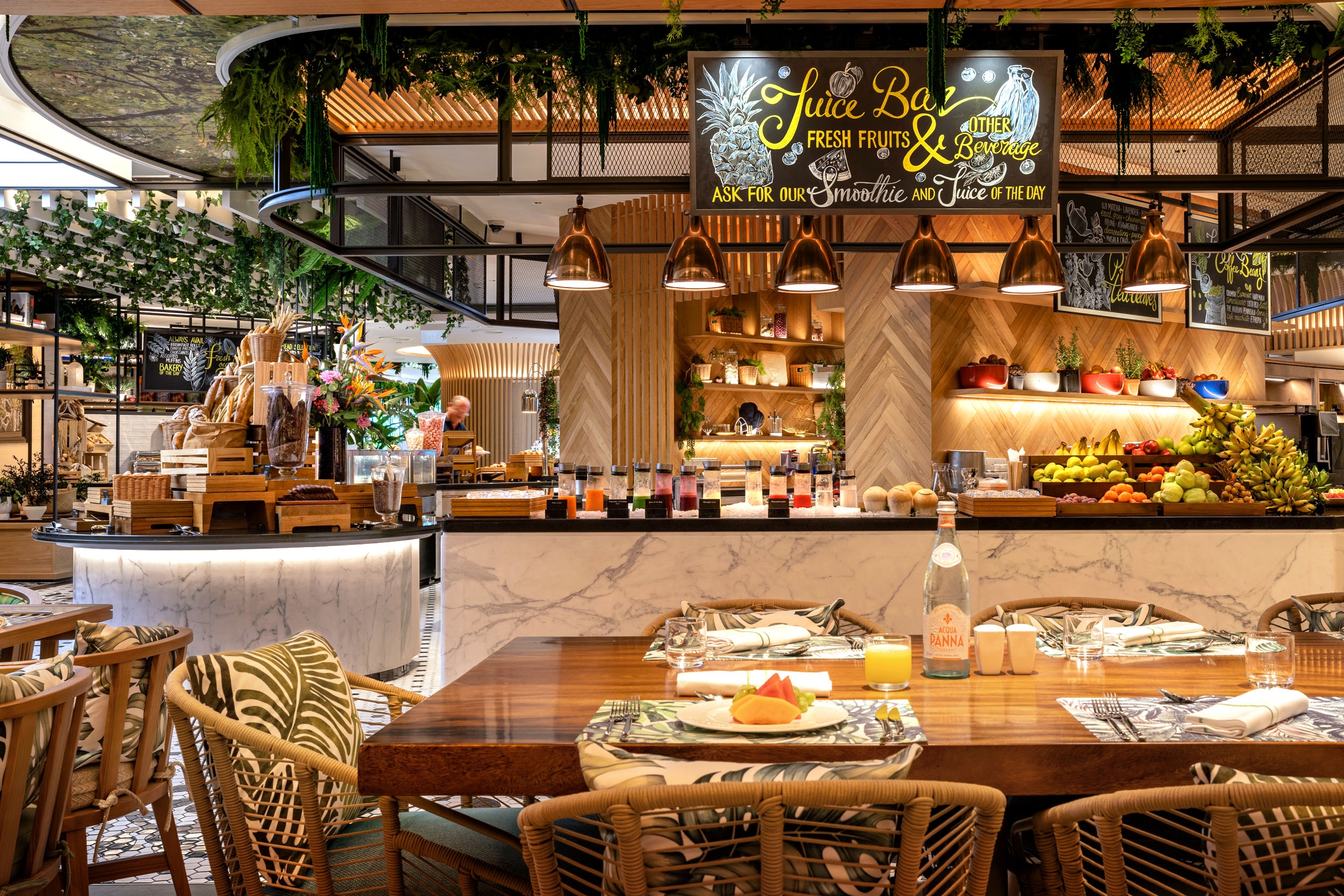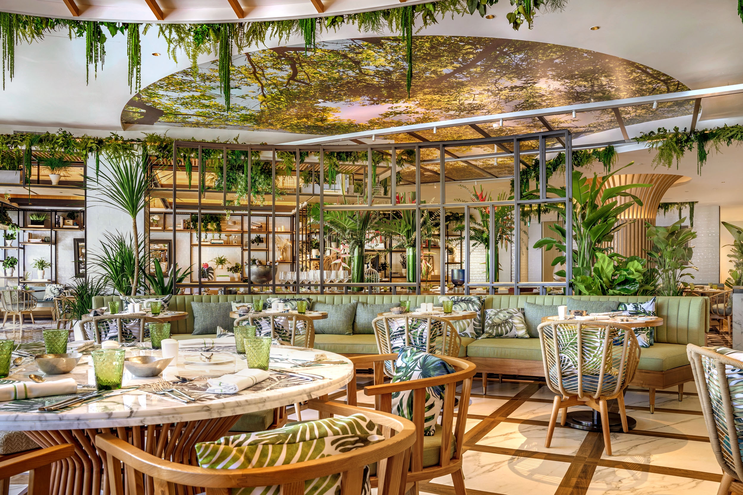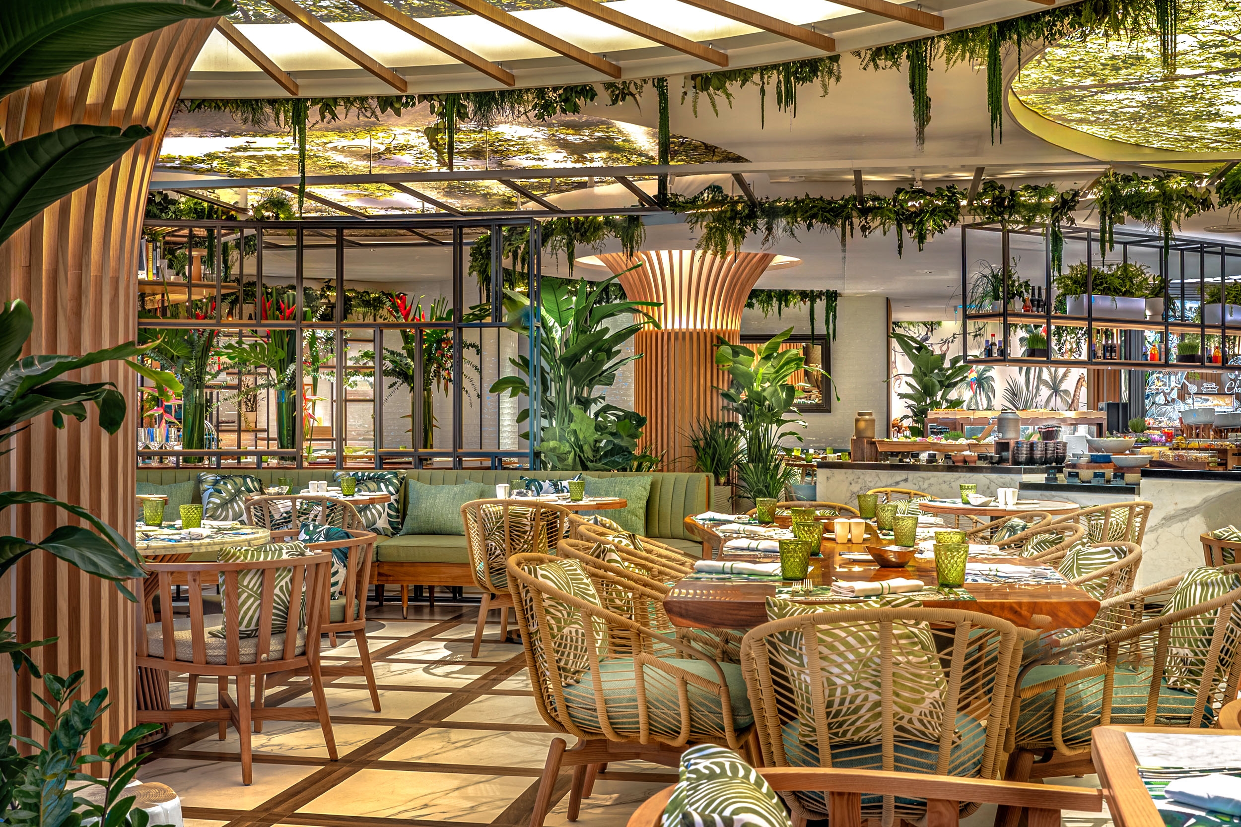 The renovation transformed the space, opening the façade to the atrium, adding an additional 50 seats at the rear of the extended outlet where we connect the interiors with the exterior landscaped gardens, also designed by us.