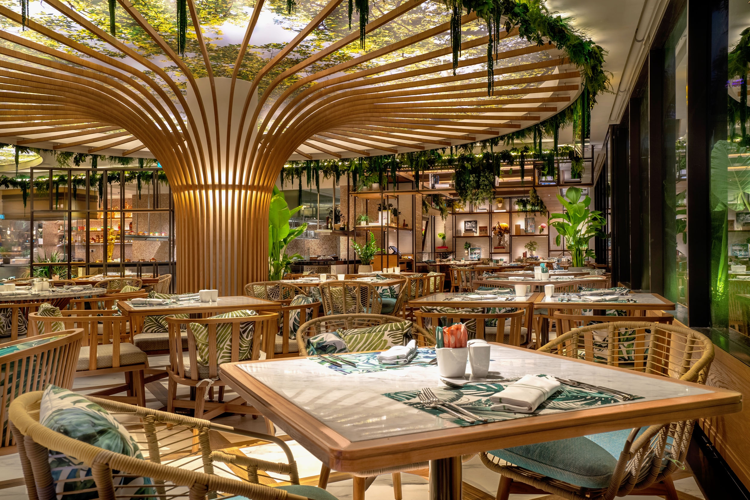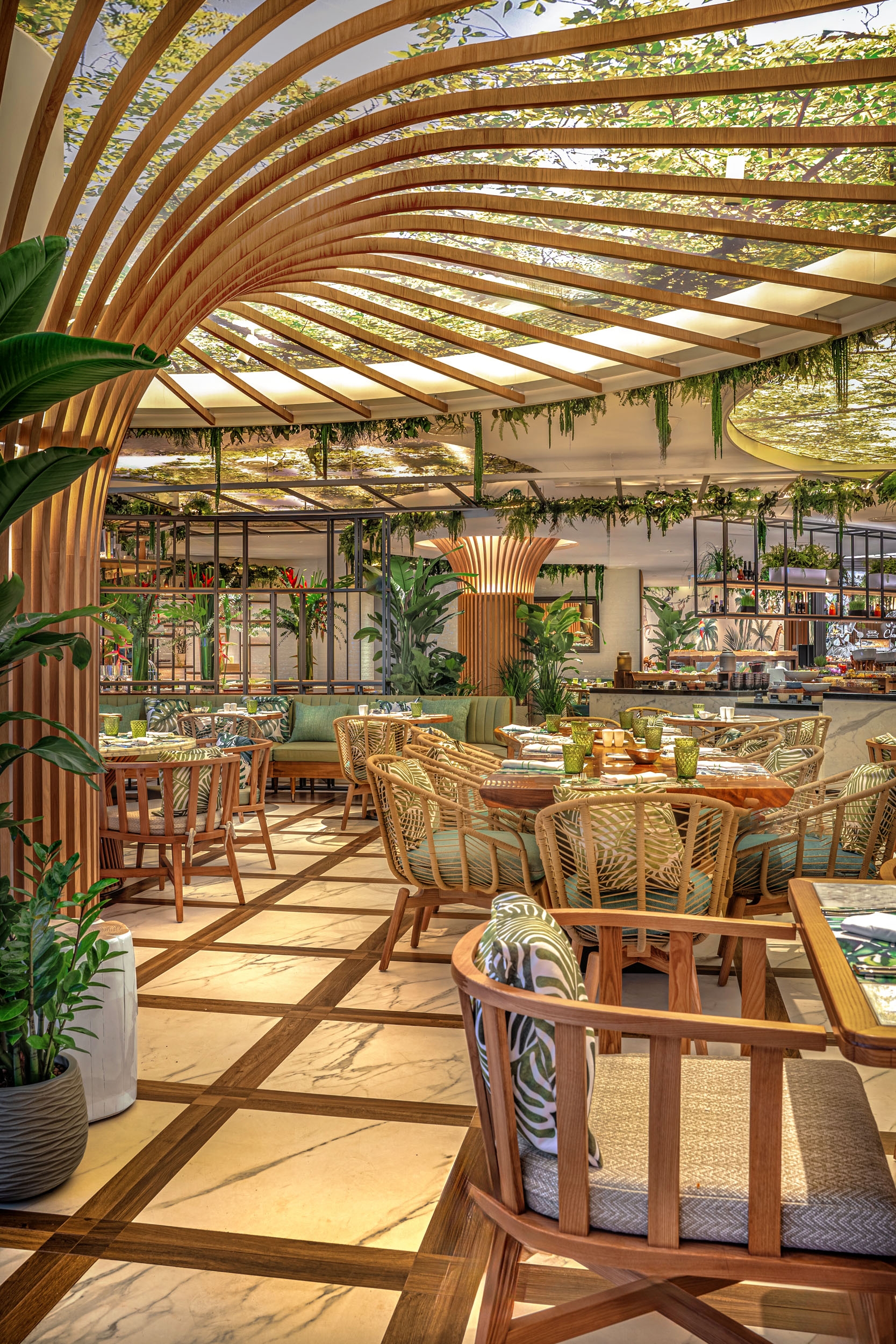 With 11 culinary stations, (including an outdoor oven), that all nestle under the interior canopies formed from curved louvred timber and back lit barrisol ceilings that have custom printed artwork depicting the leafy patterns from under the Tembusu tree.