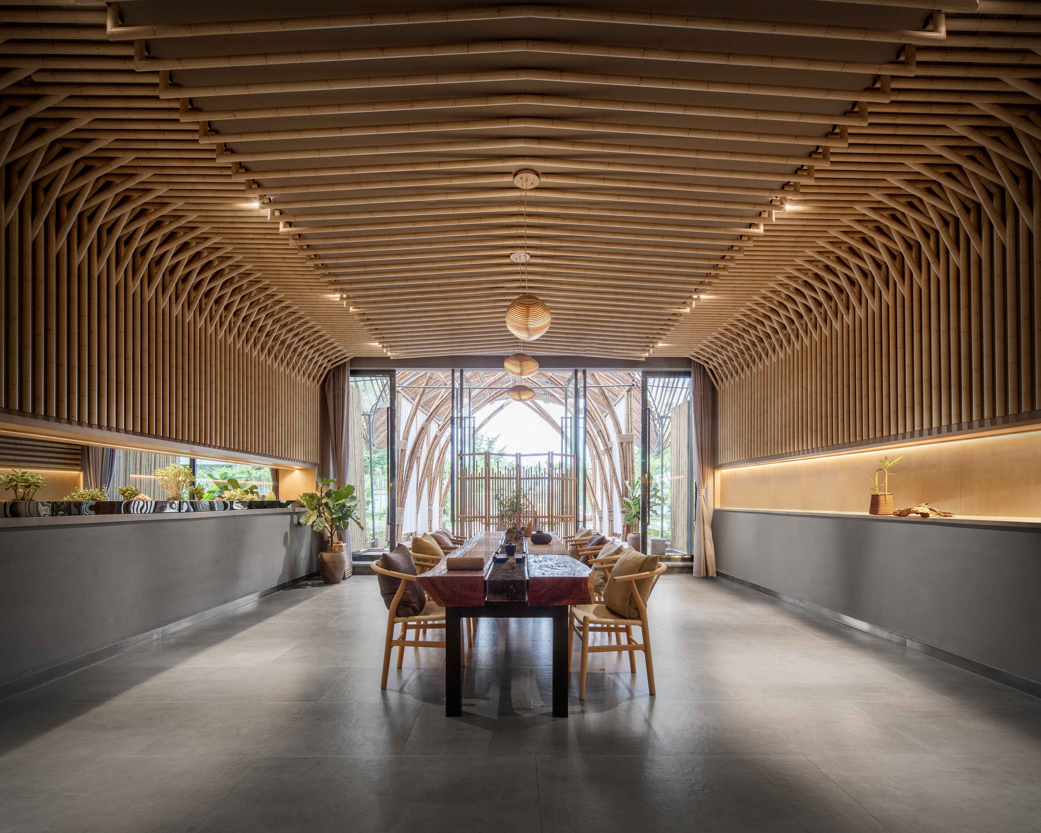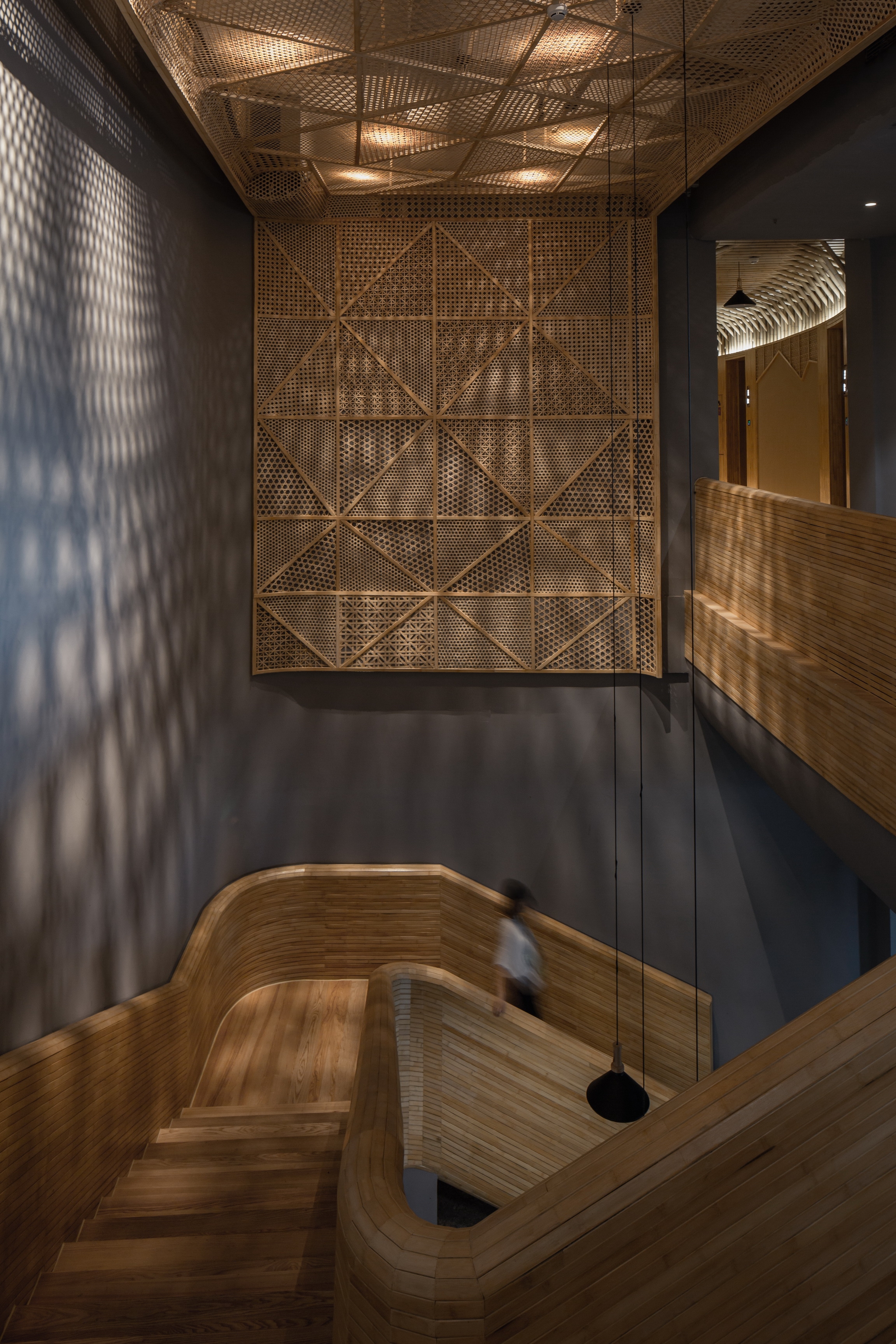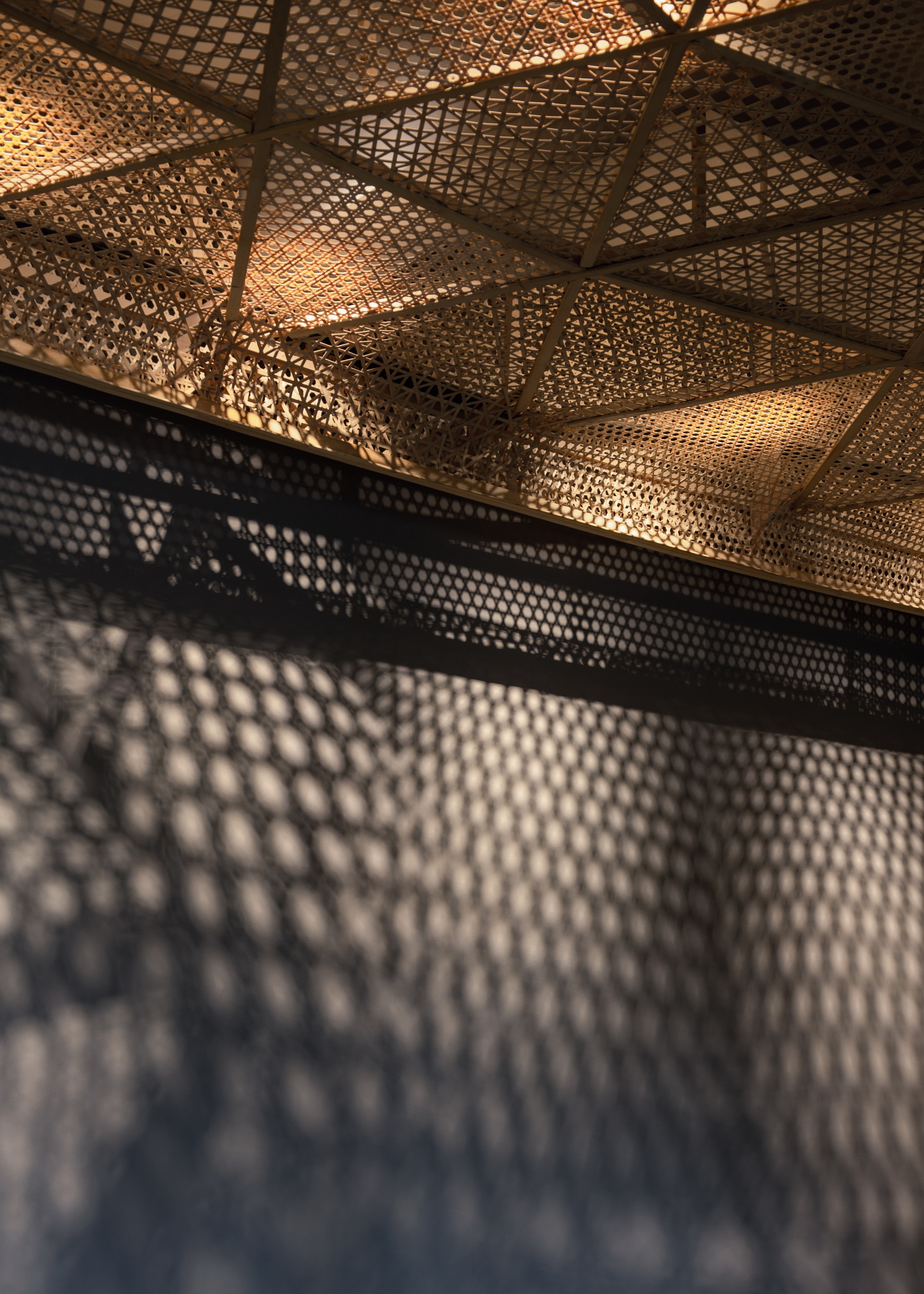 I plan to express space only through the different texture of bamboo. The interior of the room is made of bamboo strips, and bamboo skins, like building blocks, bamboo weaving is arched,forming the unique skin of each space. The top of the corridor is constructed with original bamboo, which is like shuttling through the time tunnel of bamboo forest. Bamboo weaving modeling of hall stairs and the the shadow of bamboo cast on the wall with the help of light forming a picture like the sunlight through the bamboo leaves in the bamboo forest.