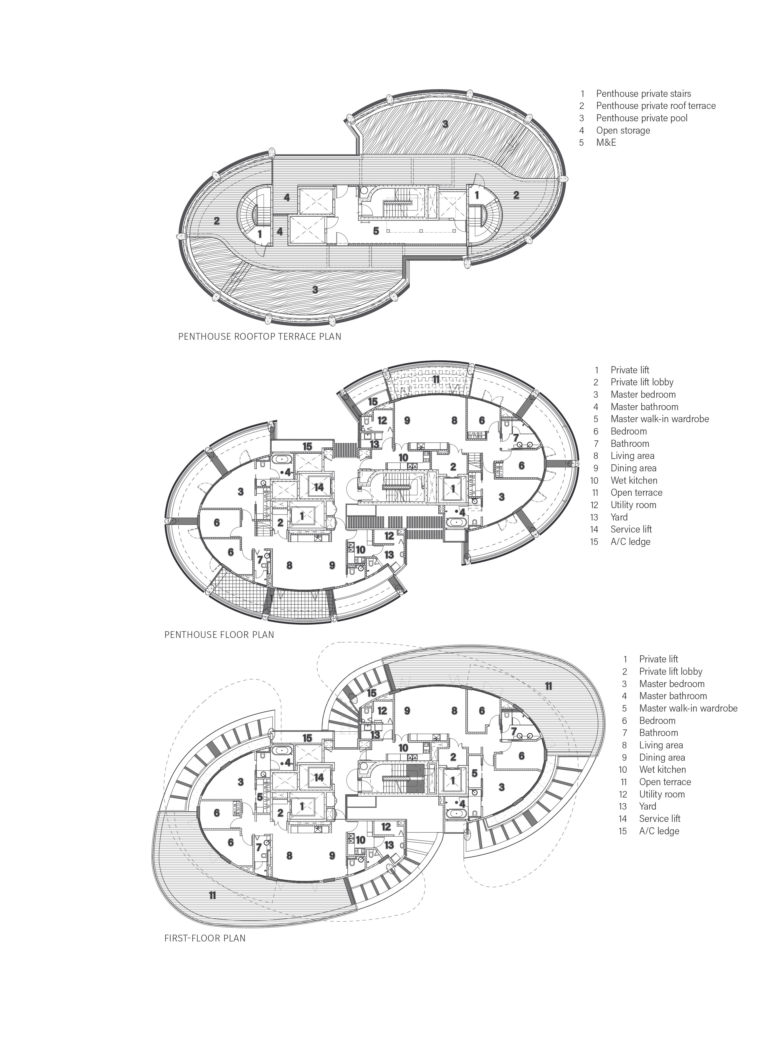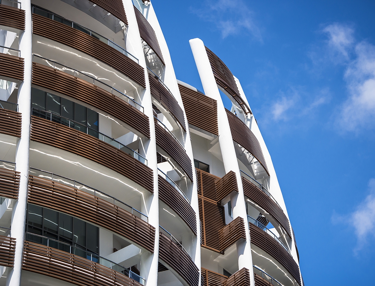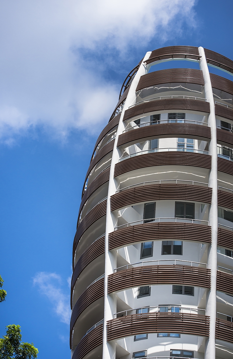The curvilinear feature, enhanced by horizontal and vertical elements, generates variety and texture, giving the complex a powerful sculptural presence. Its voluptuous image, accentuated by curved ribs, leads the eye upwards to the gently folding conclusion above the roofline. In counterpoint with these vertiginous ribs is a horizontal lattice of brown louvers providing privacy and sun screening and accentuating the distinctive nature of the building by creating a sense of unity to the facade.