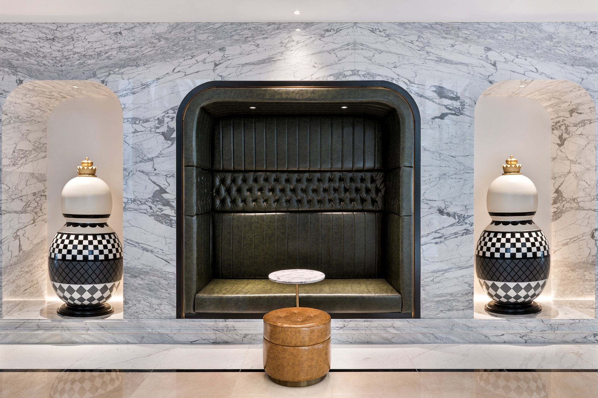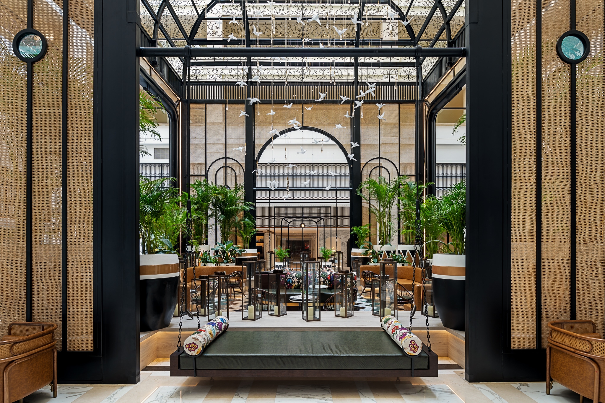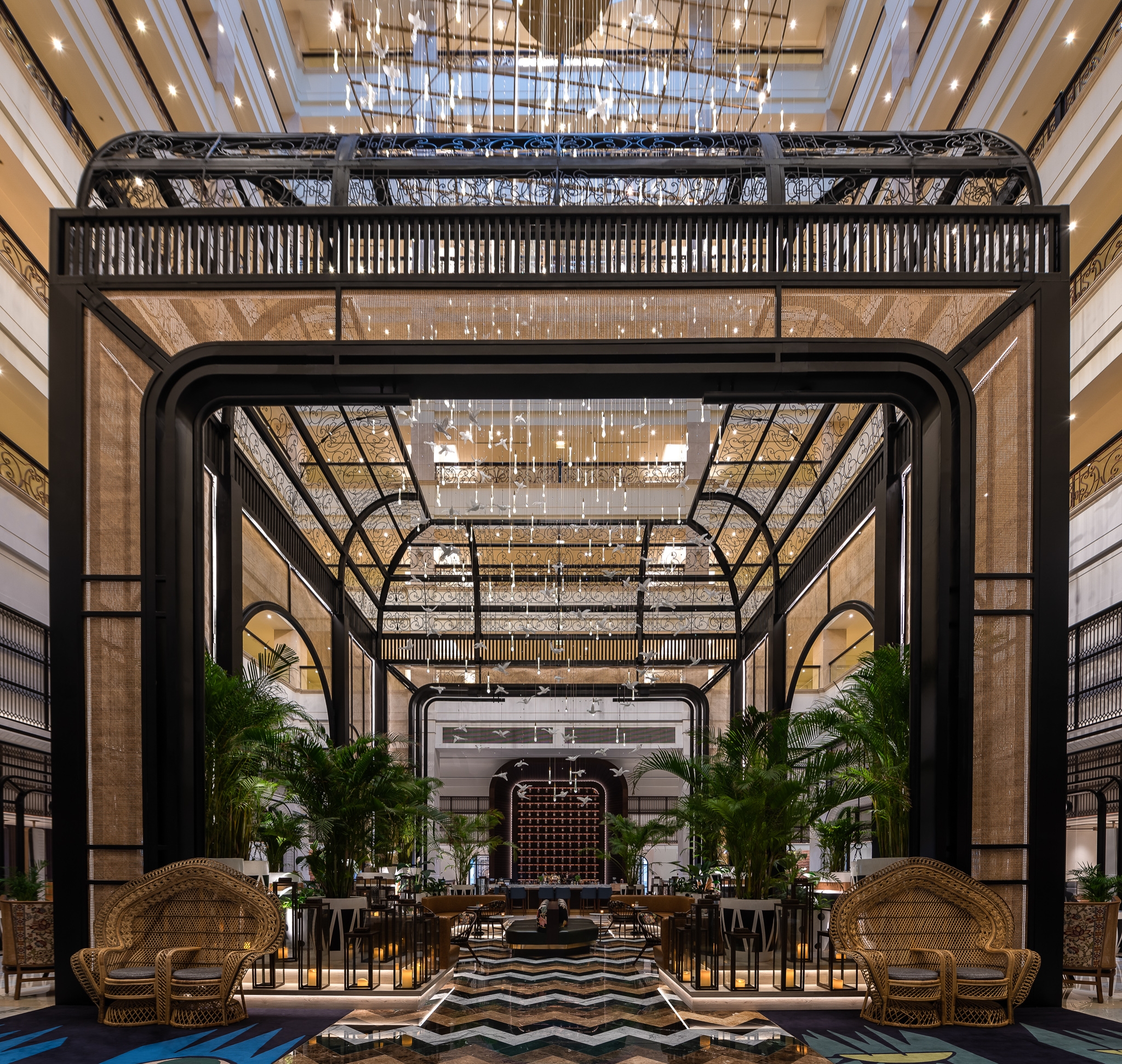 Acting as the gateway to traveling back to a more effortlessly glamorous time, the lobby features a striking monochromatic palette with distinctive architectural framework and attention to detail. Similar to a mansion, the space is sectioned off into a foyer, a conservatory, a living room and a games room. Full height display cabinets, art deco screens and elegant archways lead the way, creating a sense of exploration where the guests feel as though they are walking through someone’s home, moving from room to room, eager to see what is yet to come. The central lounge is surrounded by rich greenery, intricate wrought iron work and flooded with natural light, forming the conservatory of the mansion. Delicate bird sculptures hang within the gazebo and fly out into the open void only to be met with the light rain shower extending from 9 stories above. A strong central axis provides the guest with direct views of the attic featuring an impressive 6m high tea display and the brass adorned bar fascia.