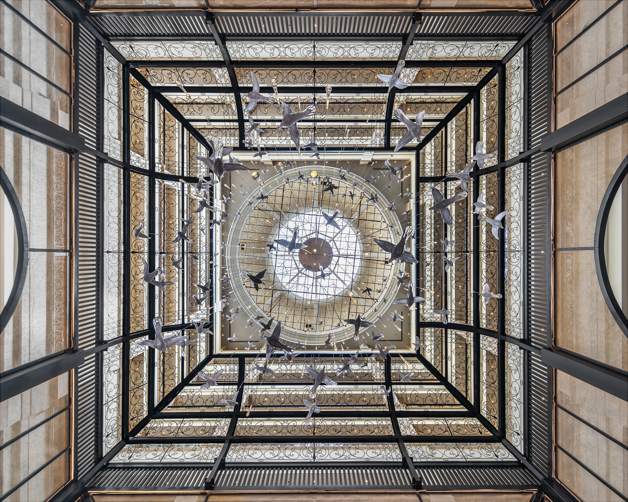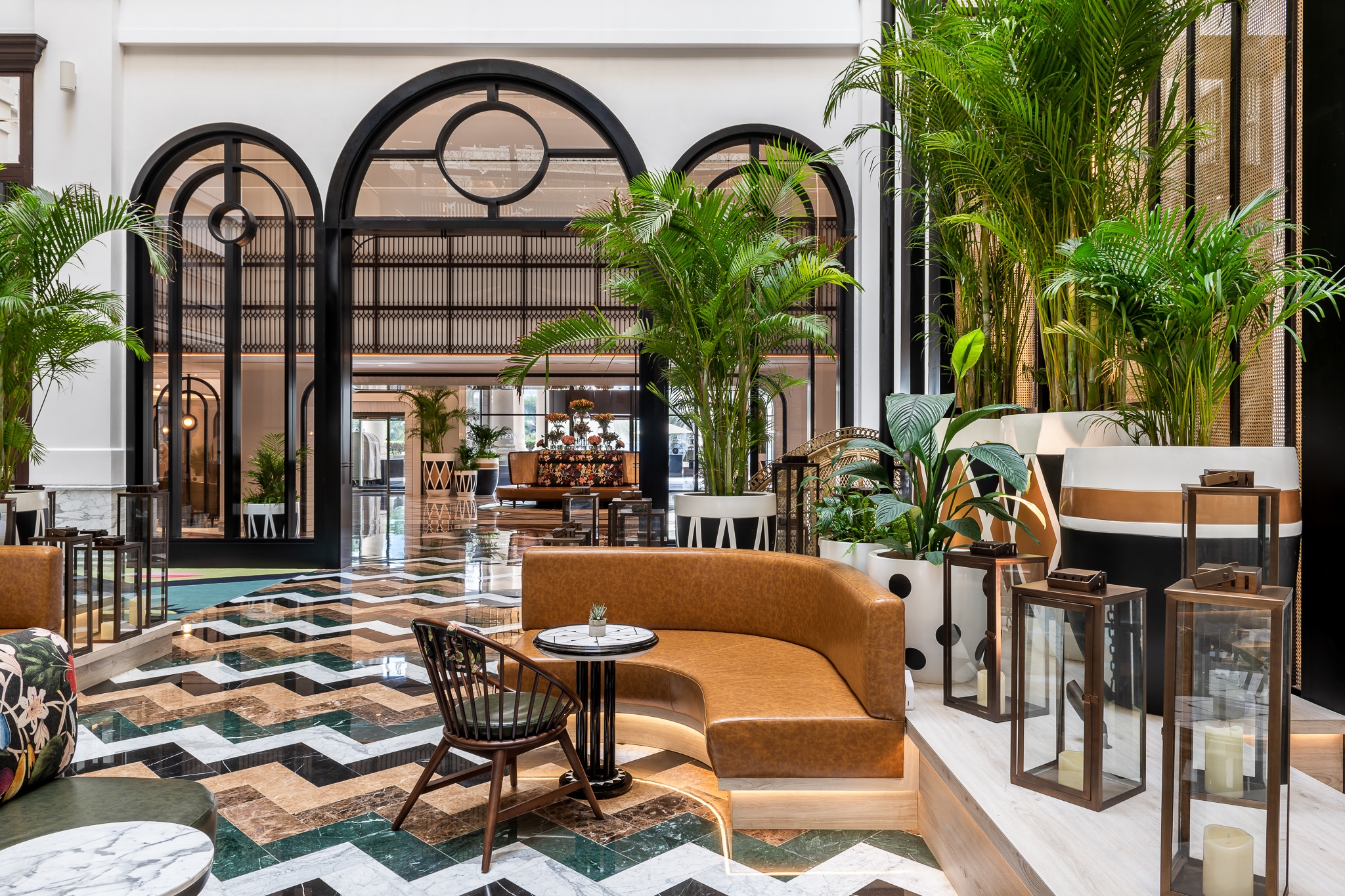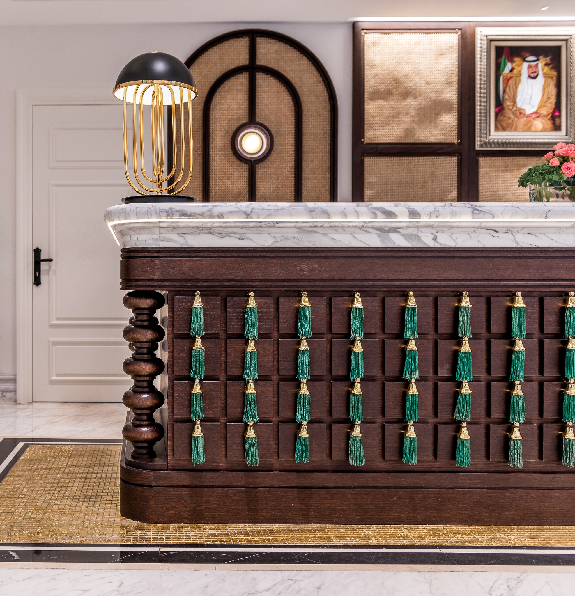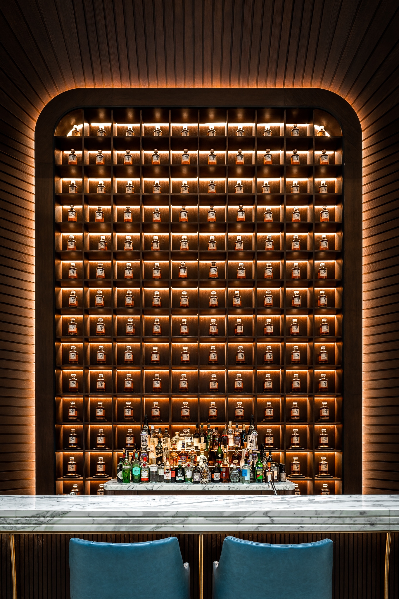 Acting as the gateway to traveling back to a more effortlessly glamorous time, the lobby features a striking monochromatic palette with distinctive architectural framework and attention to detail. Similar to a mansion, the space is sectioned off into a foyer, a conservatory, a living room and a games room. Full height display cabinets, art deco screens and elegant archways lead the way, creating a sense of exploration where the guests feel as though they are walking through someone’s home, moving from room to room, eager to see what is yet to come. The central lounge is surrounded by rich greenery, intricate wrought iron work and flooded with natural light, forming the conservatory of the mansion. Delicate bird sculptures hang within the gazebo and fly out into the open void only to be met with the light rain shower extending from 9 stories above. A strong central axis provides the guest with direct views of the attic featuring an impressive 6m high tea display and the brass adorned bar fascia.
