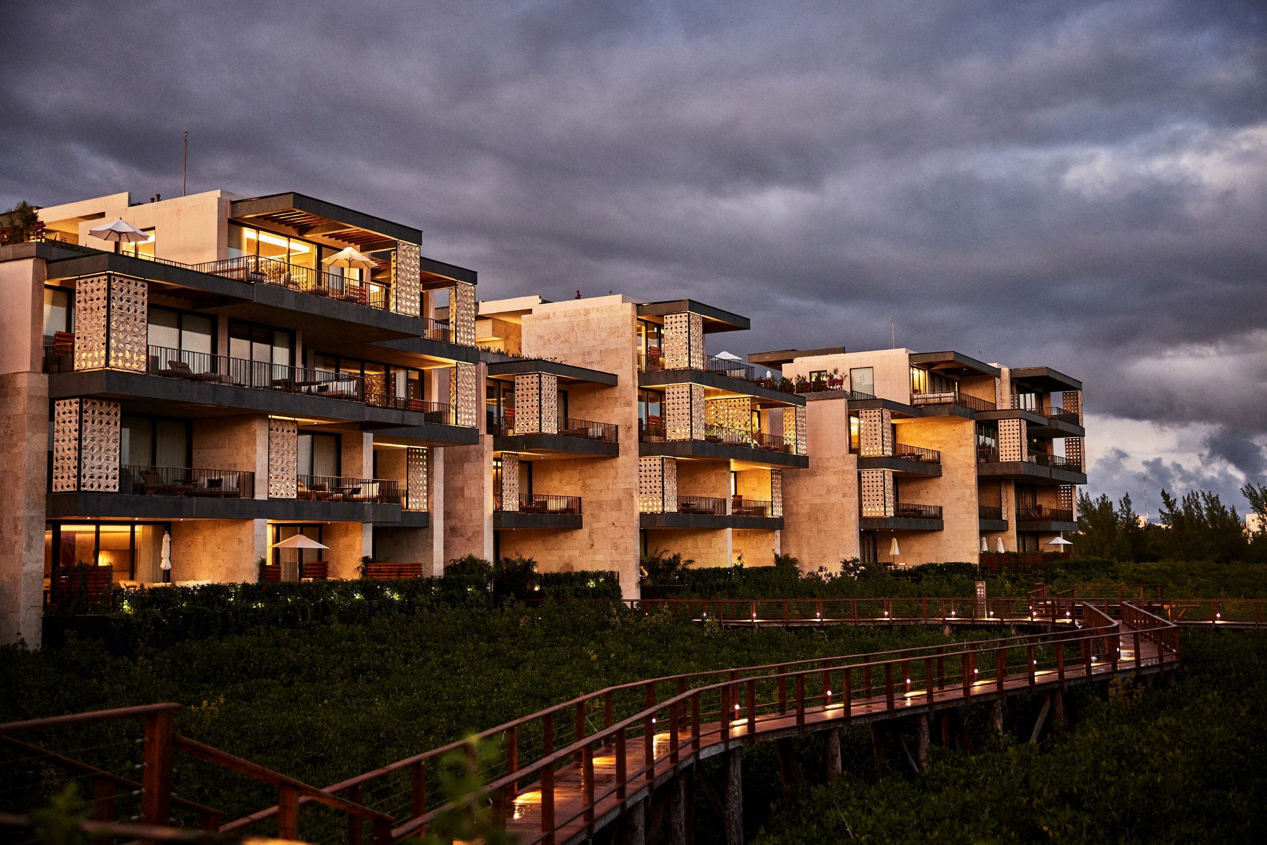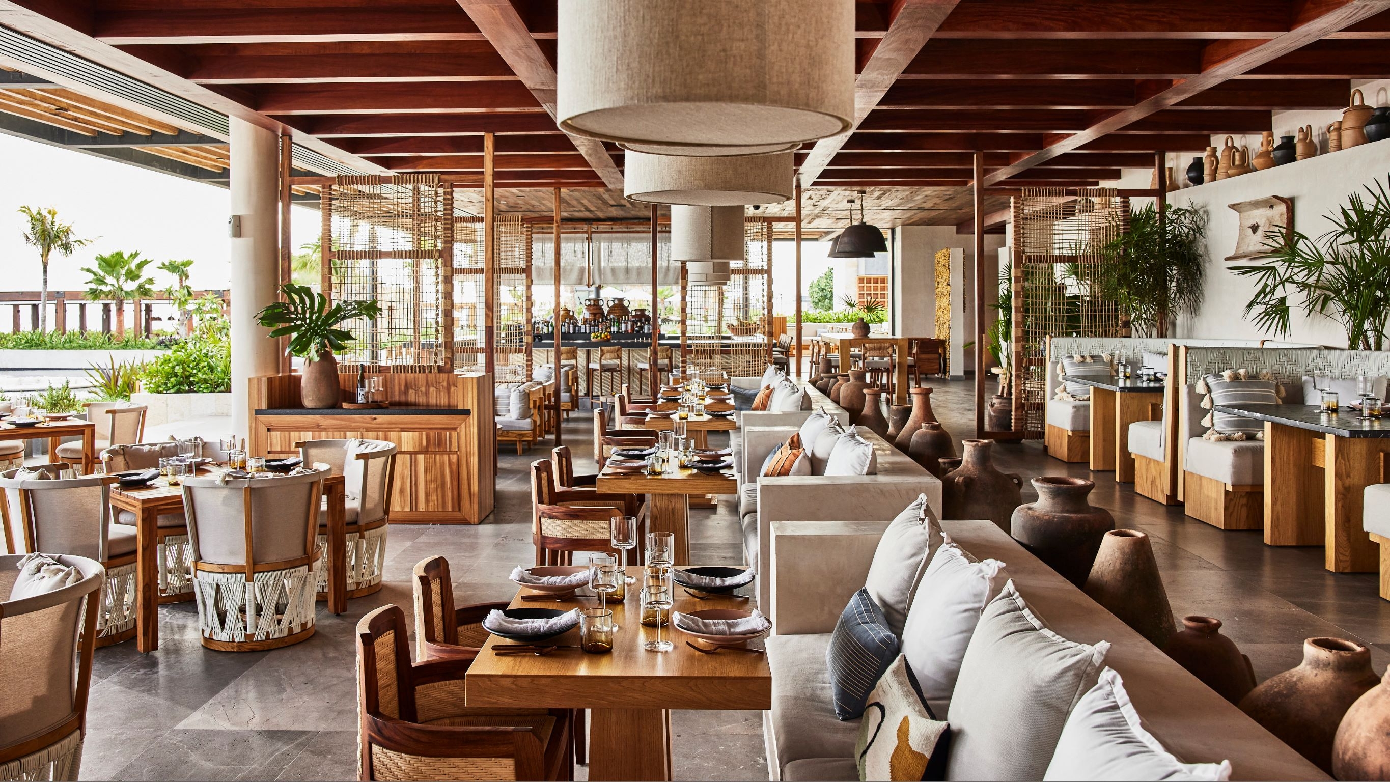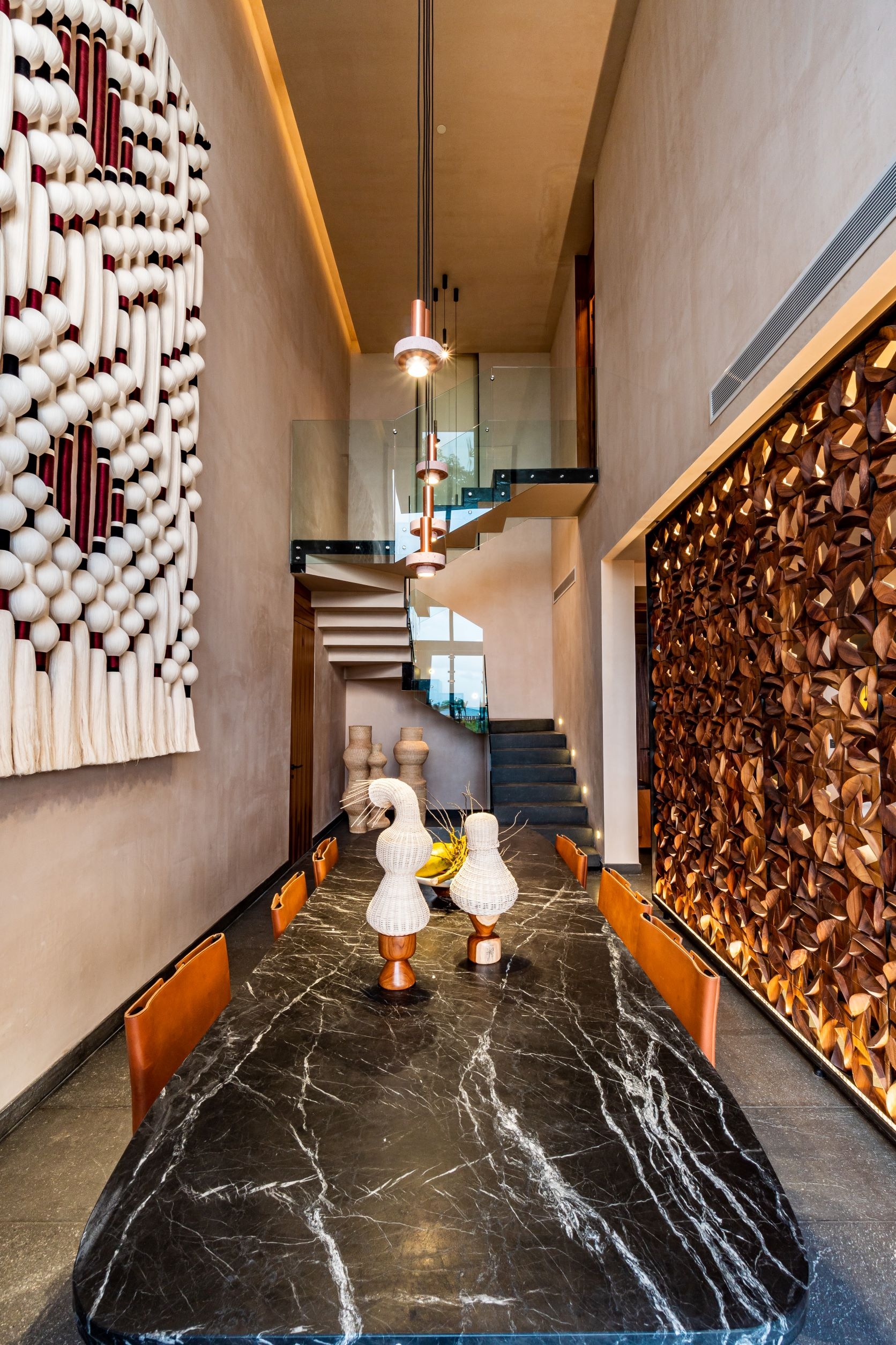 Guests are greeted by an artful living room and invited to explore public areas of fitness, meeting, pre-function, and ballroom on sculpture dotted pathways surrounding a central pool, complimenting plunge pools in each guestroom. The main pool offers a variety of daybeds, hammocks & private cabanas, flanked by a laid back cevichería, with walls wrapped in a colorful mural. In addition to traditional amenities, Etereo offers an intimate Reading Room, lined with shelves of books about Mexico and decorated with local artifacts. The spa at Etereo is similarly unique in its vision, featuring carved millwork and bespoke furnishings paired with comfortable seating and quiet lighting — the spa feels like an escape. Through delicate & impactful design, contemporary art, and a smooth & gradual transition from the property’s elegant arrival to toes in sand at the beach, guests can comfortably unwind