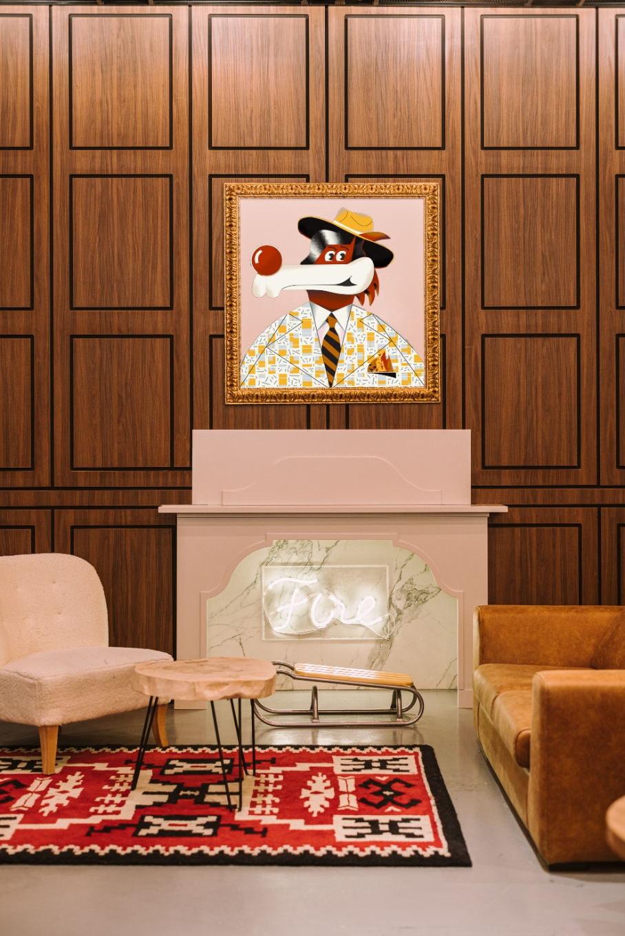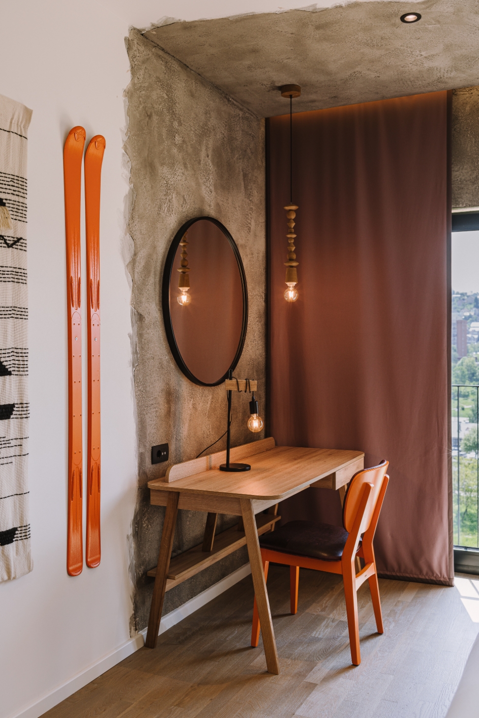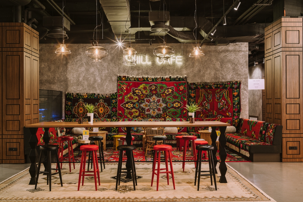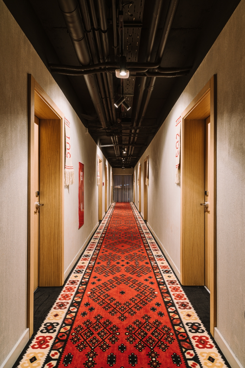 A large amount of exposed installations and raw concrete walls were combined with wooden paneling and locally woven wool carpets. The central lobby point - shisha bar Chill Cafe – is all lined with carpets and furnished by Bosnian craftsmen. Local handicrafts appear in many details: the room numbers are hand-woven kilims, and the restaurant is decorated with hand-forged metal trays.