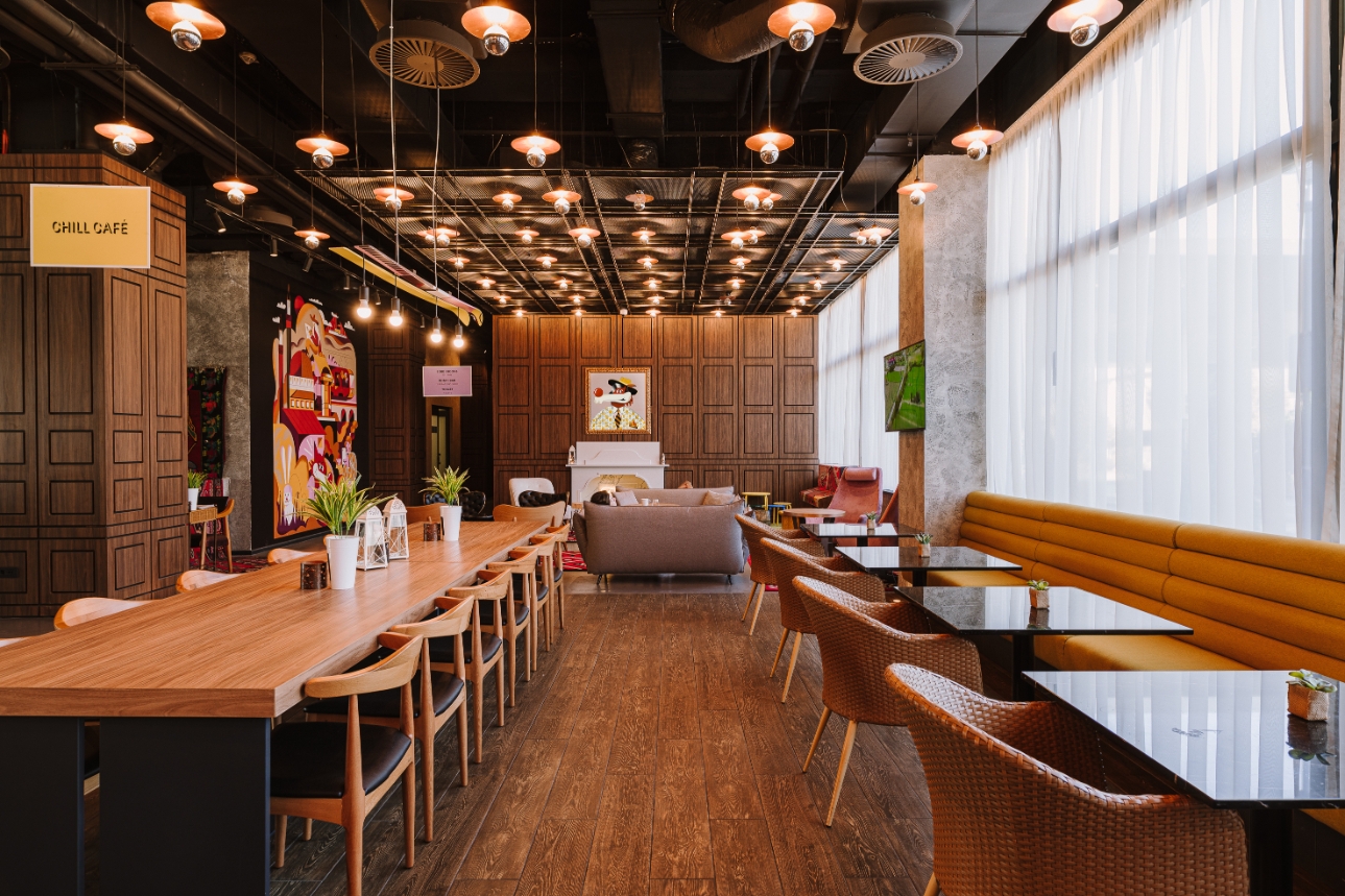 On the ground floor, the main space is a lobby with reception and restaurant and a lounge bar. Part of the hotel is also a la carte restaurant. The restaurant connects with the bar and lounge. On the 15th floor, there is a sky bar with panoramic windows - Ingman Bar.