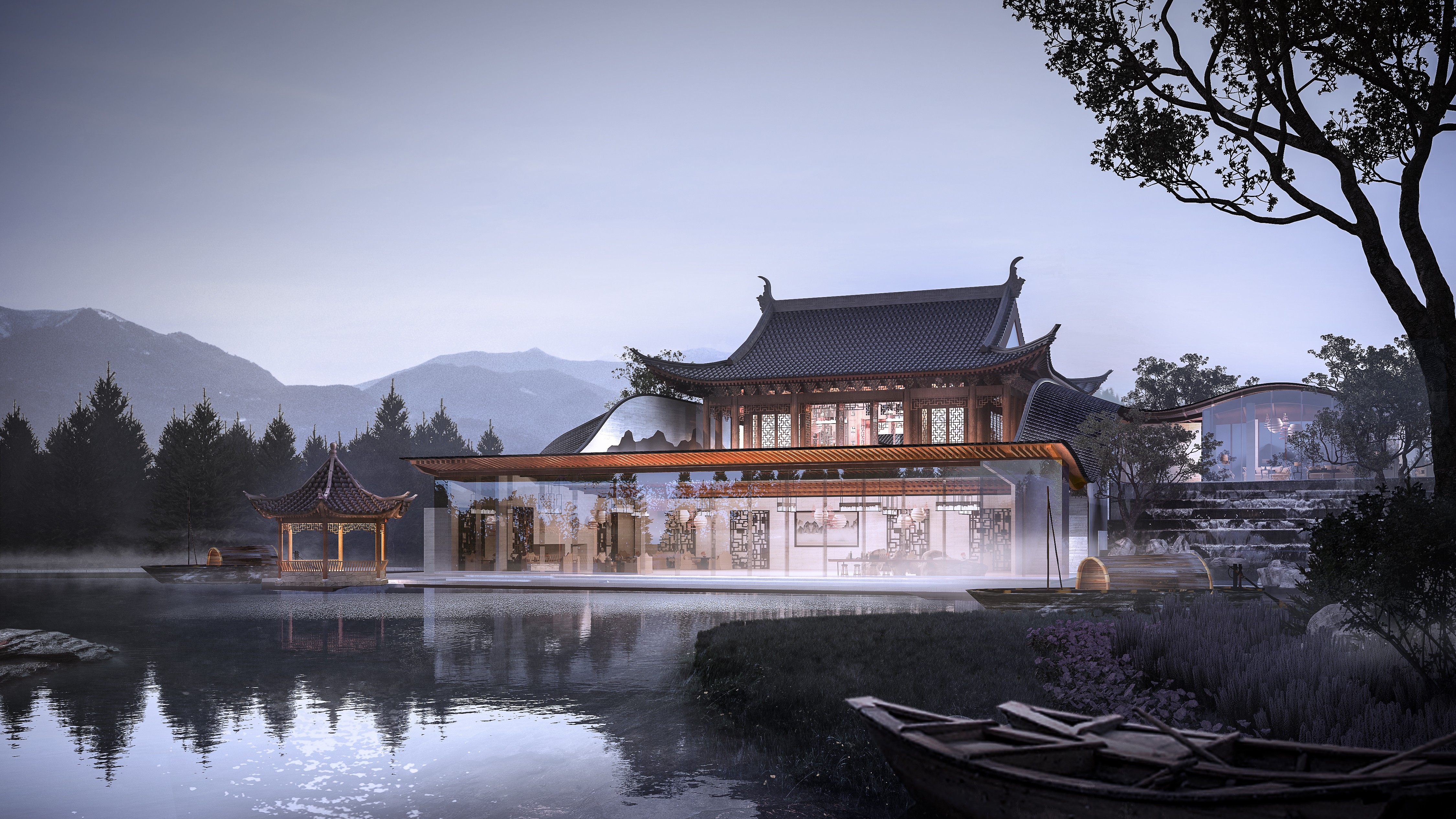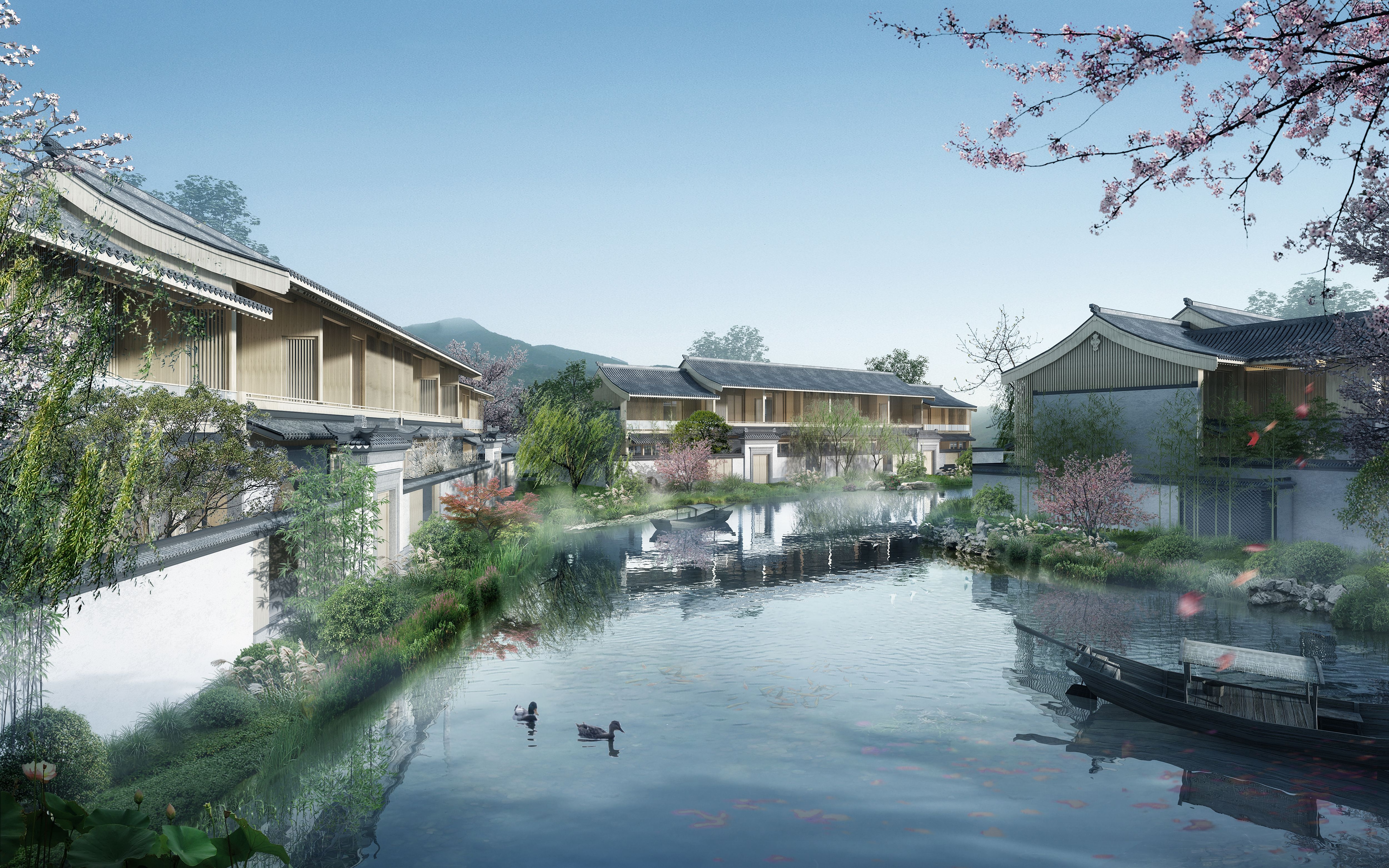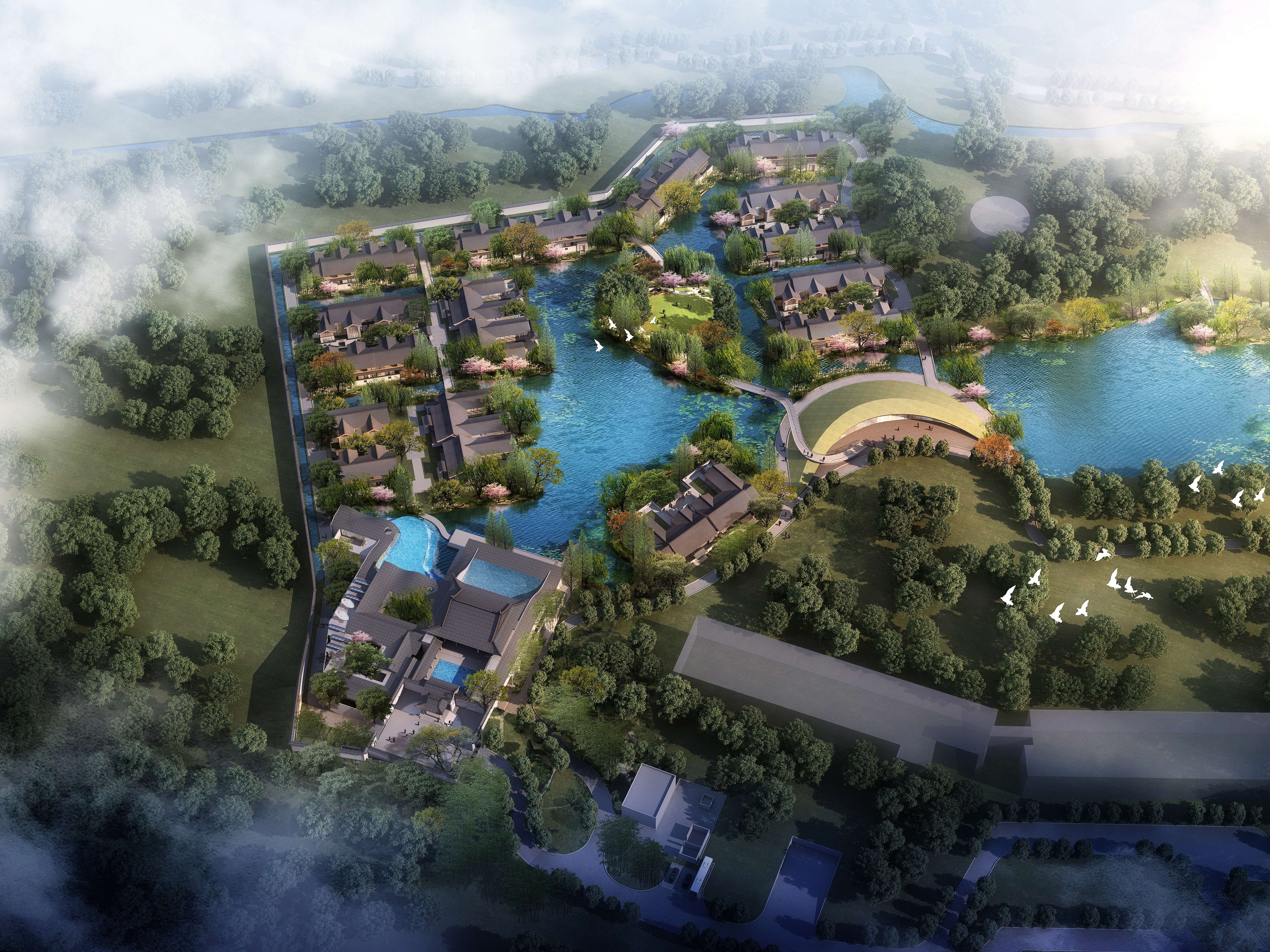 The project is located in Songjiang, a historical and cultural area known as “the root of Shanghai”. The hotel creates an appealing space of jiangnan connotation and constructs a picture of the secular life of literati with both elegance and common taste, so that the guests become part of the narrative picture, both the viewer and the sitter. Due to the existence of water system, the whole building is arranged in the texture of “river-house-street-house-river” and “river-house-street” and other traditional blocks in the South of the Yangtze River.The hotel lobby refers to the Ming Dynasty building, using seven purlin small architectural form, gable and hip roof, surrounded by a circle of corridors, is a typical jiangnan garden hall practice. White walls with black roof-tiles, small bridges over flowing waters,and rooms with black, white, gray and wood colors constitute the overall color, concise mountain form in the landscape painting is used to construct curved roof.