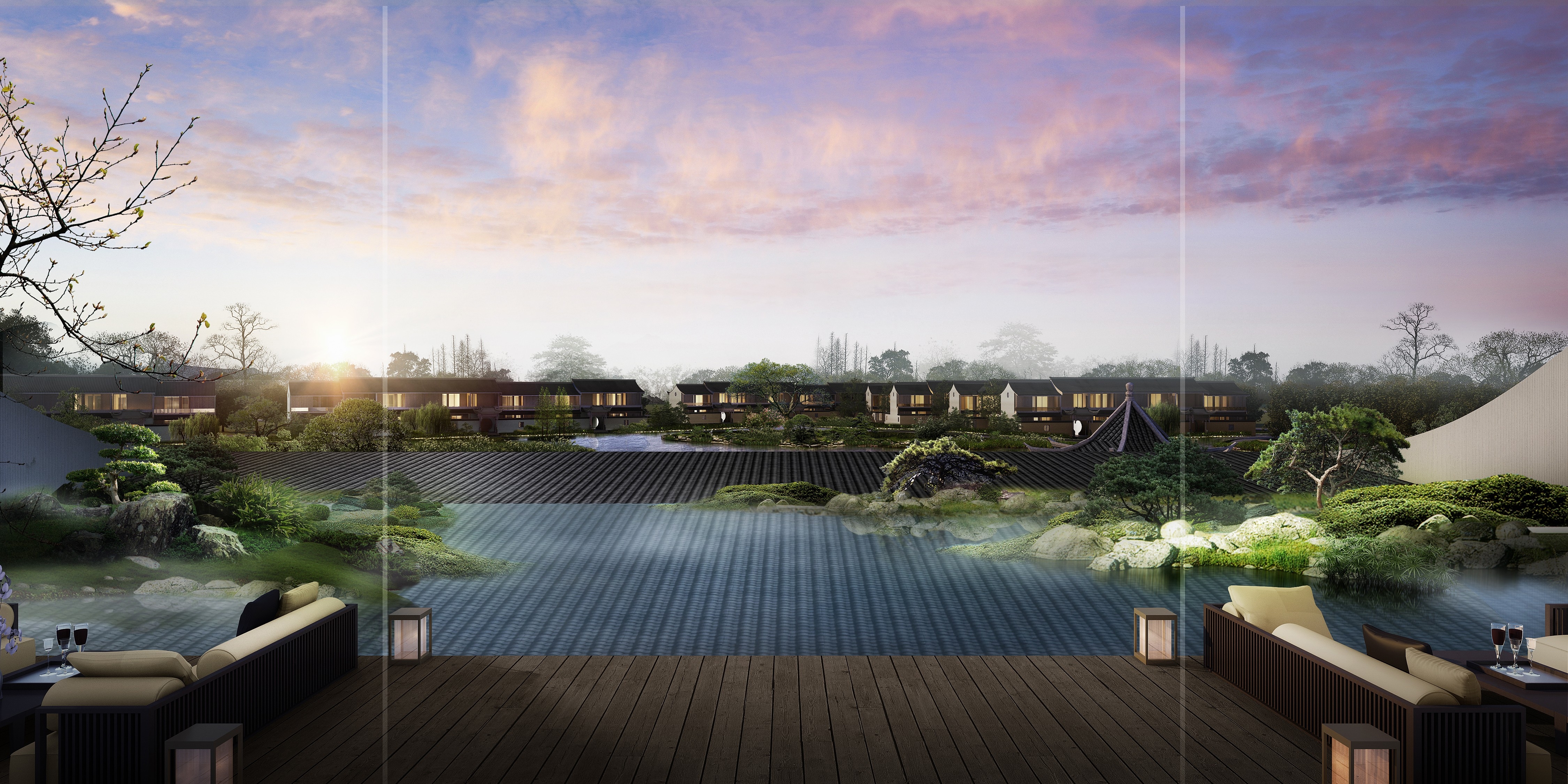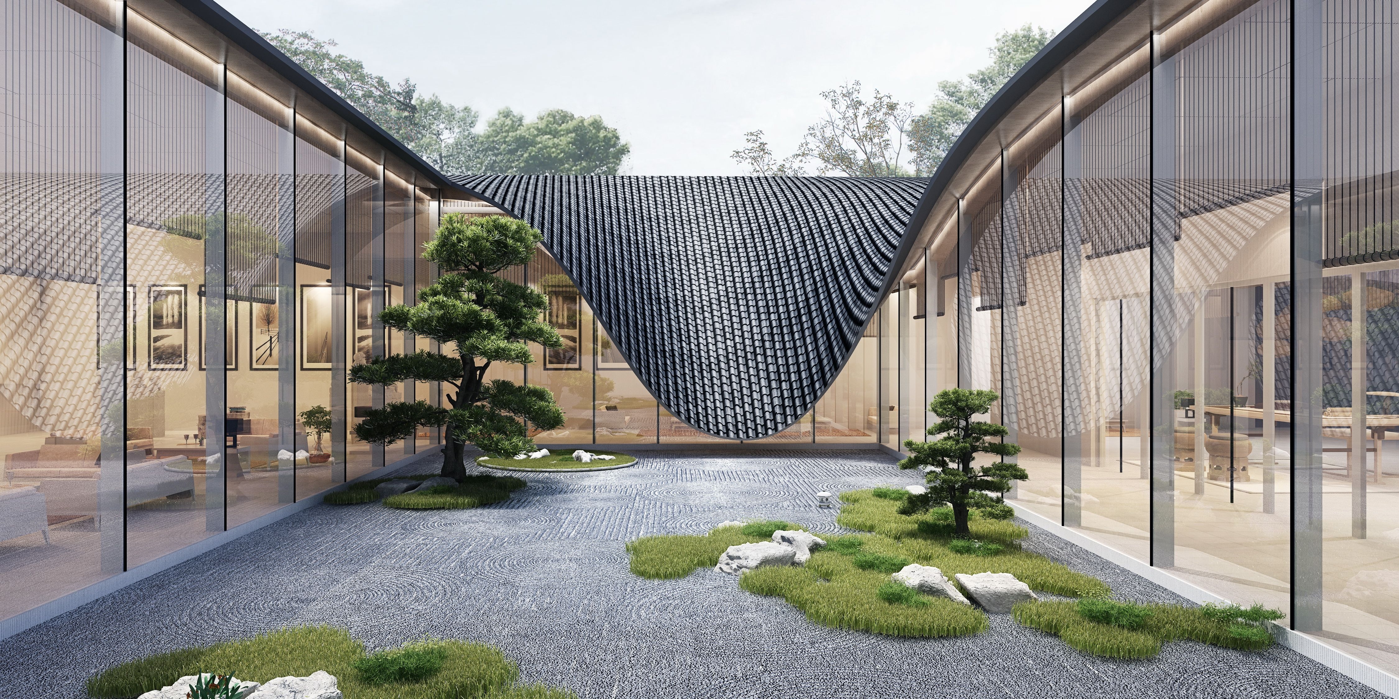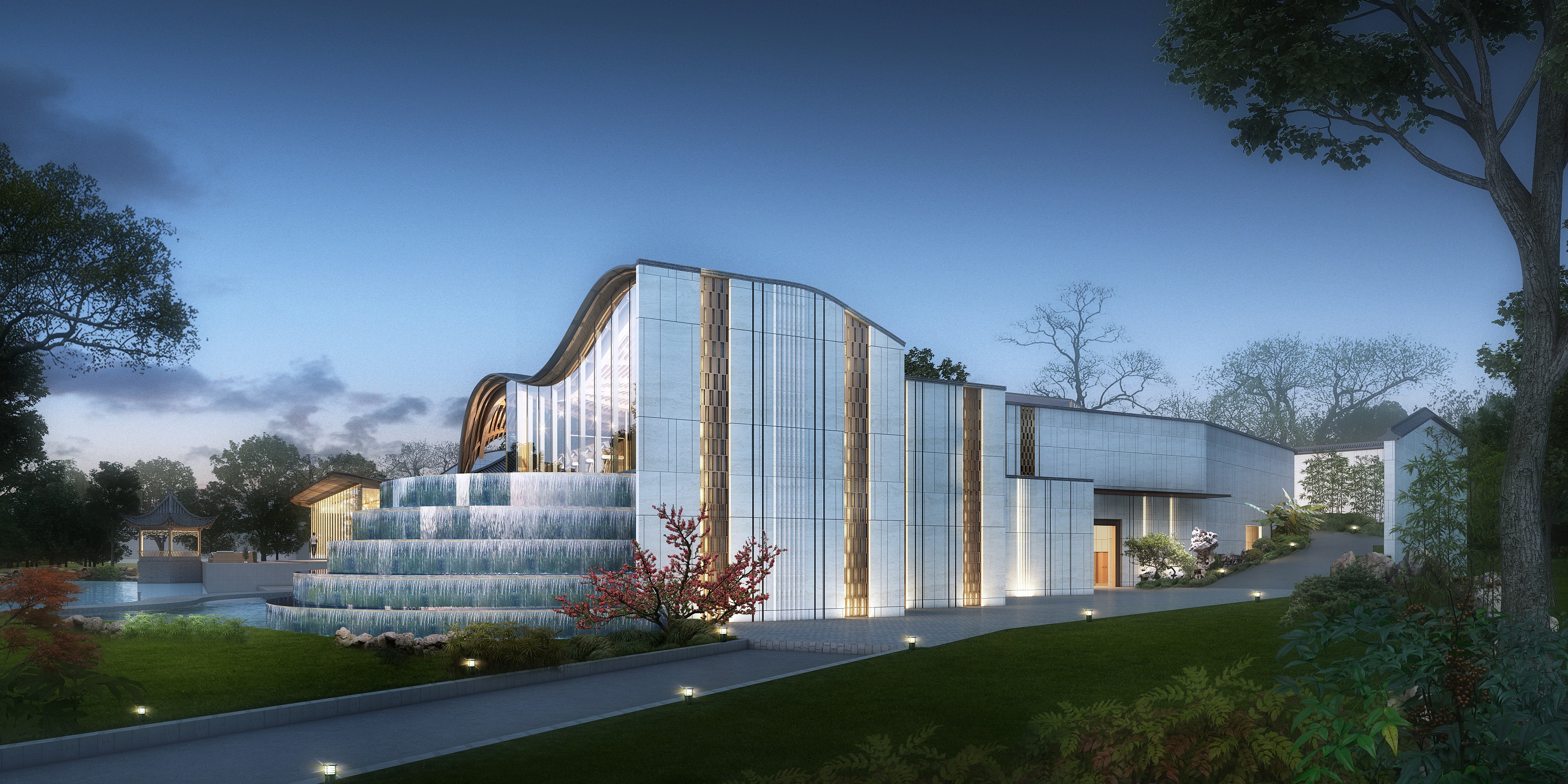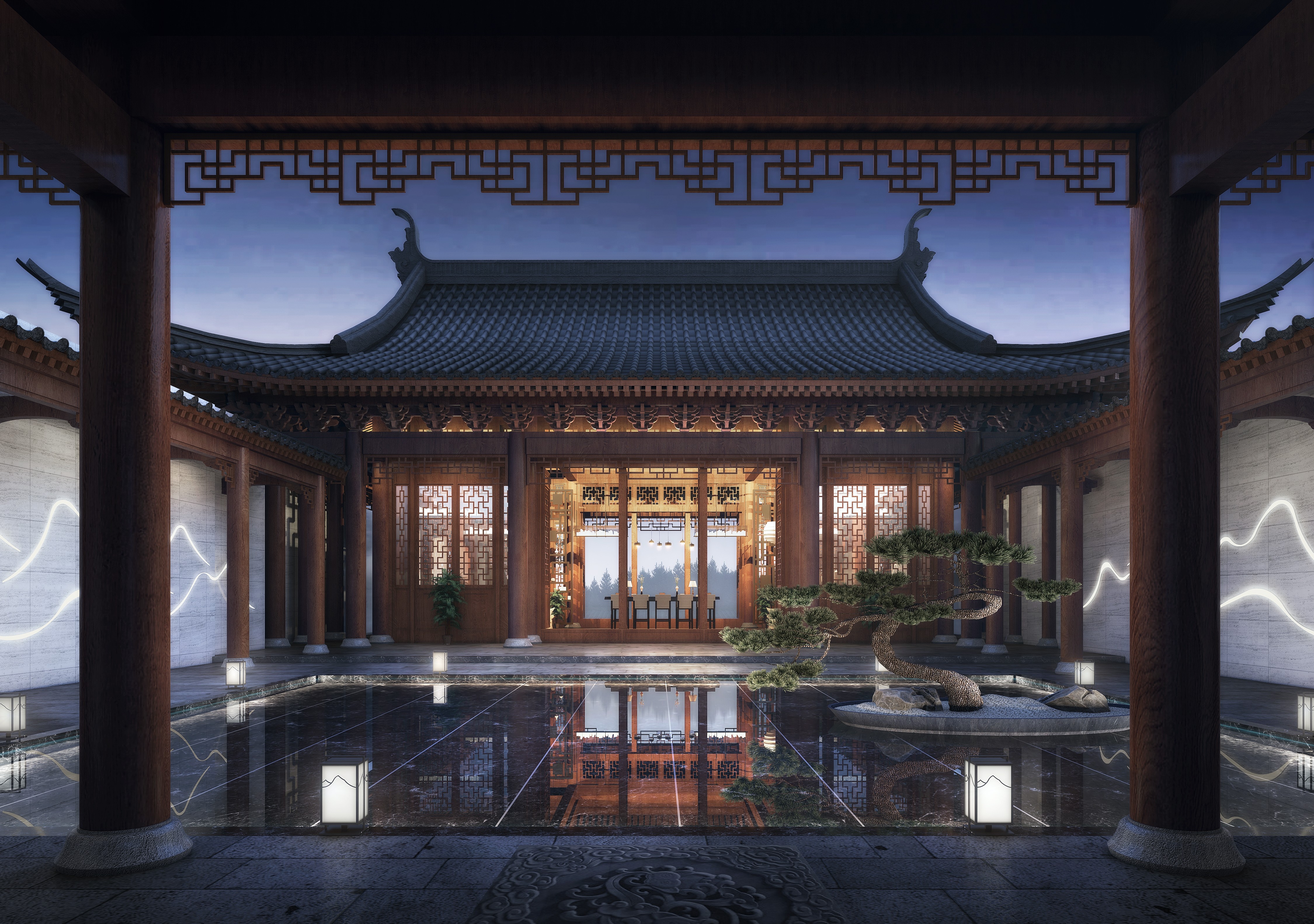 The project is located in Songjiang, a historical and cultural area known as “the root of Shanghai”. The hotel creates an appealing space of jiangnan connotation and constructs a picture of the secular life of literati with both elegance and common taste, so that the guests become part of the narrative picture, both the viewer and the sitter. Due to the existence of water system, the whole building is arranged in the texture of “river-house-street-house-river” and “river-house-street” and other traditional blocks in the South of the Yangtze River.The hotel lobby refers to the Ming Dynasty building, using seven purlin small architectural form, gable and hip roof, surrounded by a circle of corridors, is a typical jiangnan garden hall practice. White walls with black roof-tiles, small bridges over flowing waters,and rooms with black, white, gray and wood colors constitute the overall color, concise mountain form in the landscape painting is used to construct curved roof.