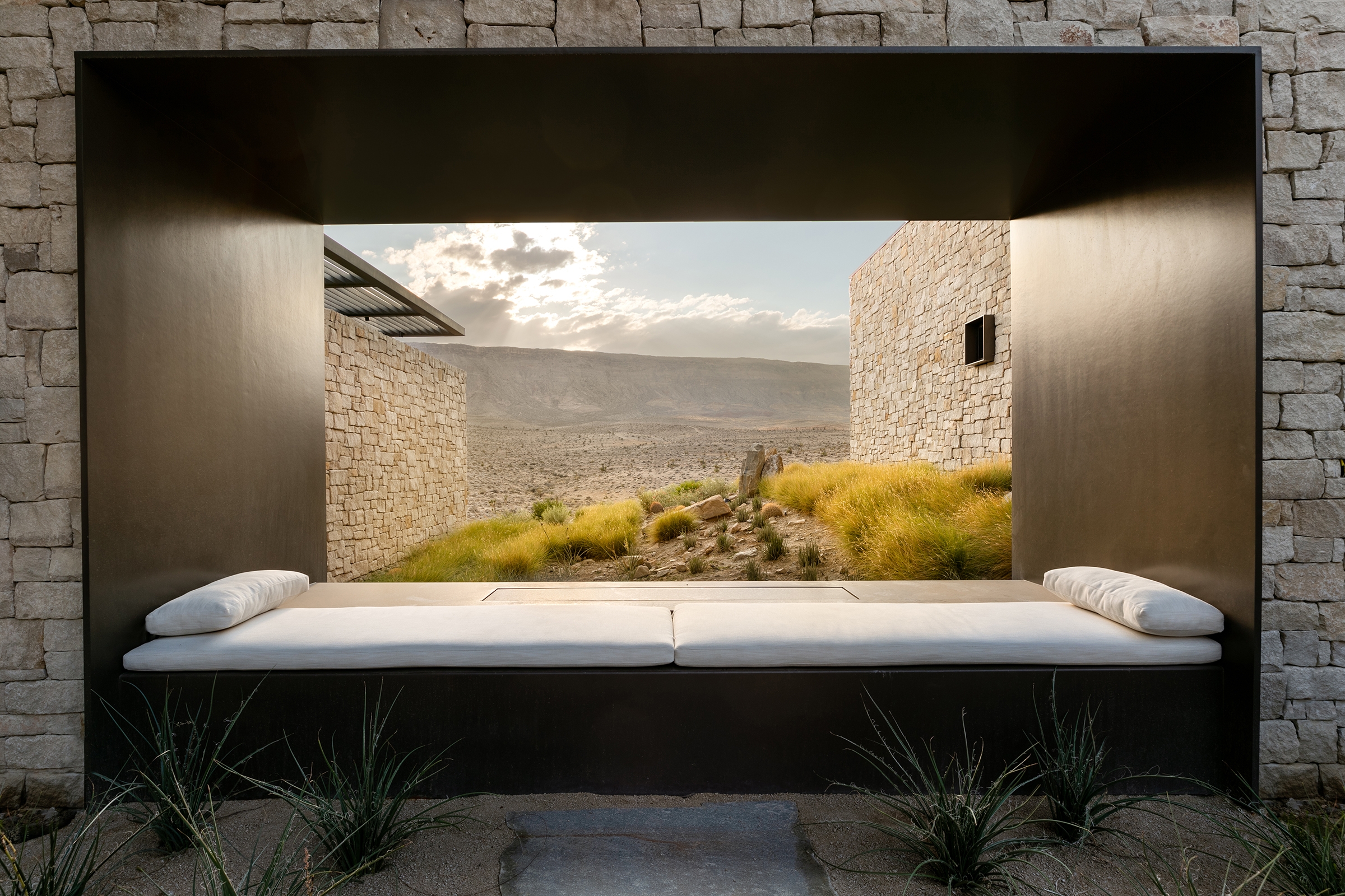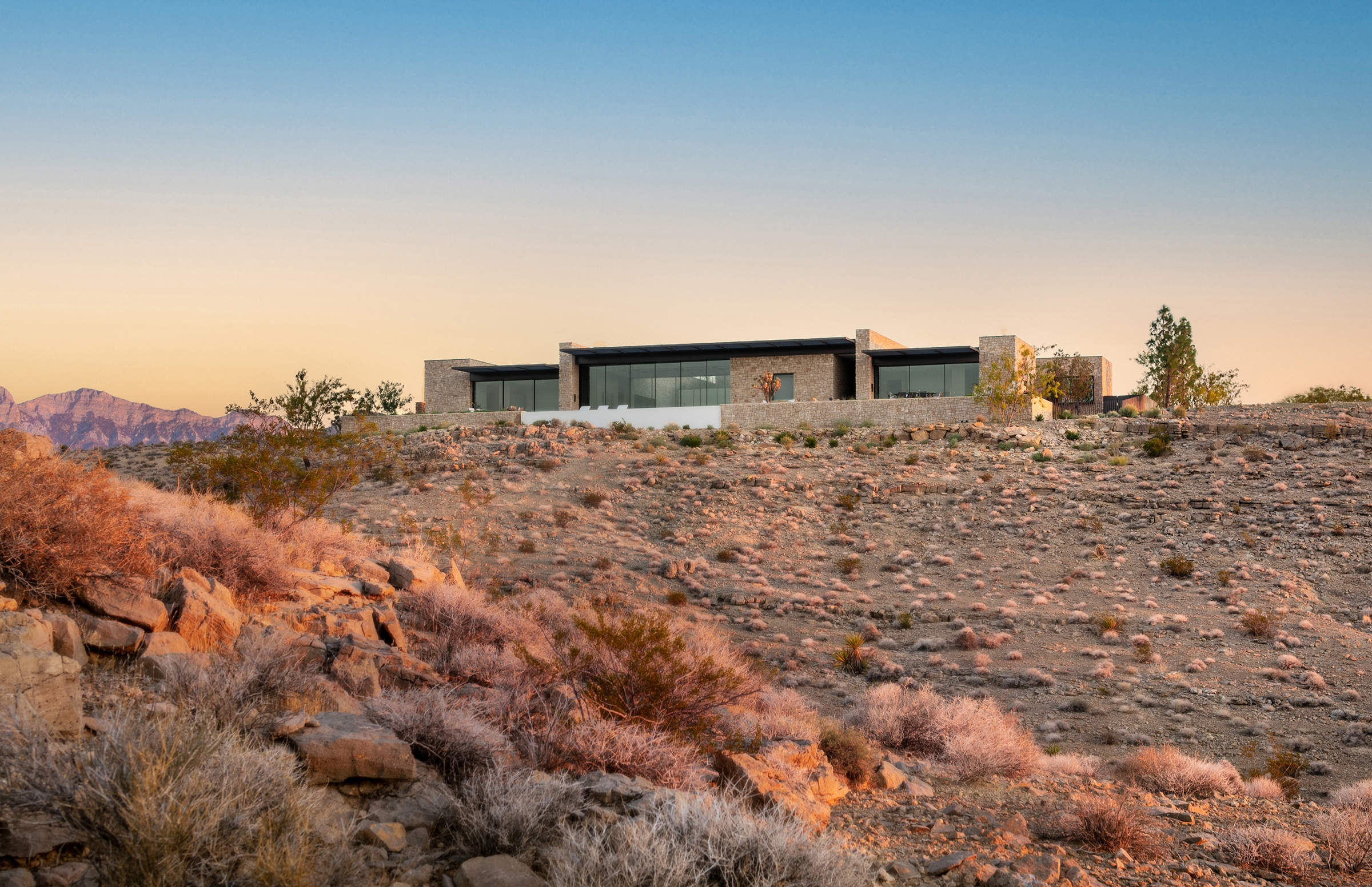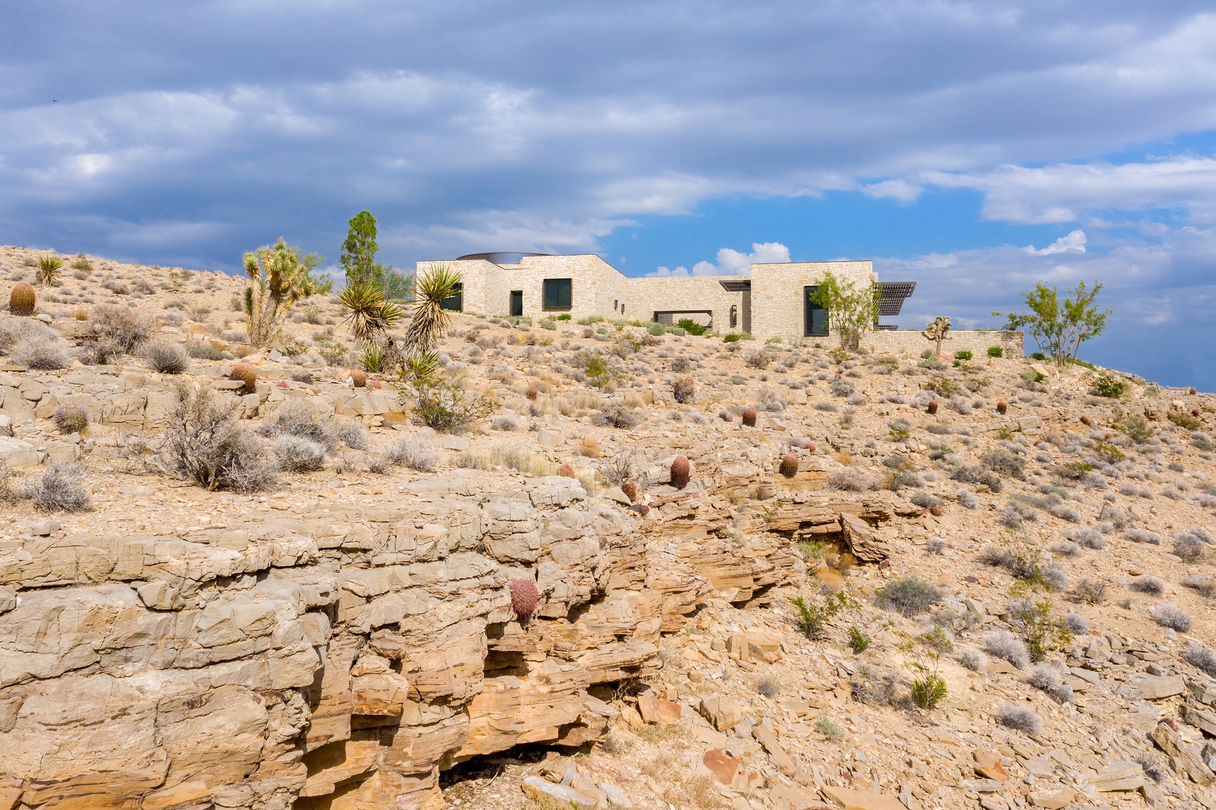 Located in Nevada along the western most point of the Las Vegas Valley with unobstructed views of the Red Rock Canyon Conservation Area to its northwest and Spring Mountain along the southwest, Fort 137 is an environmentally conscious home comprised of a series of connected rock masses emerging from the earth.