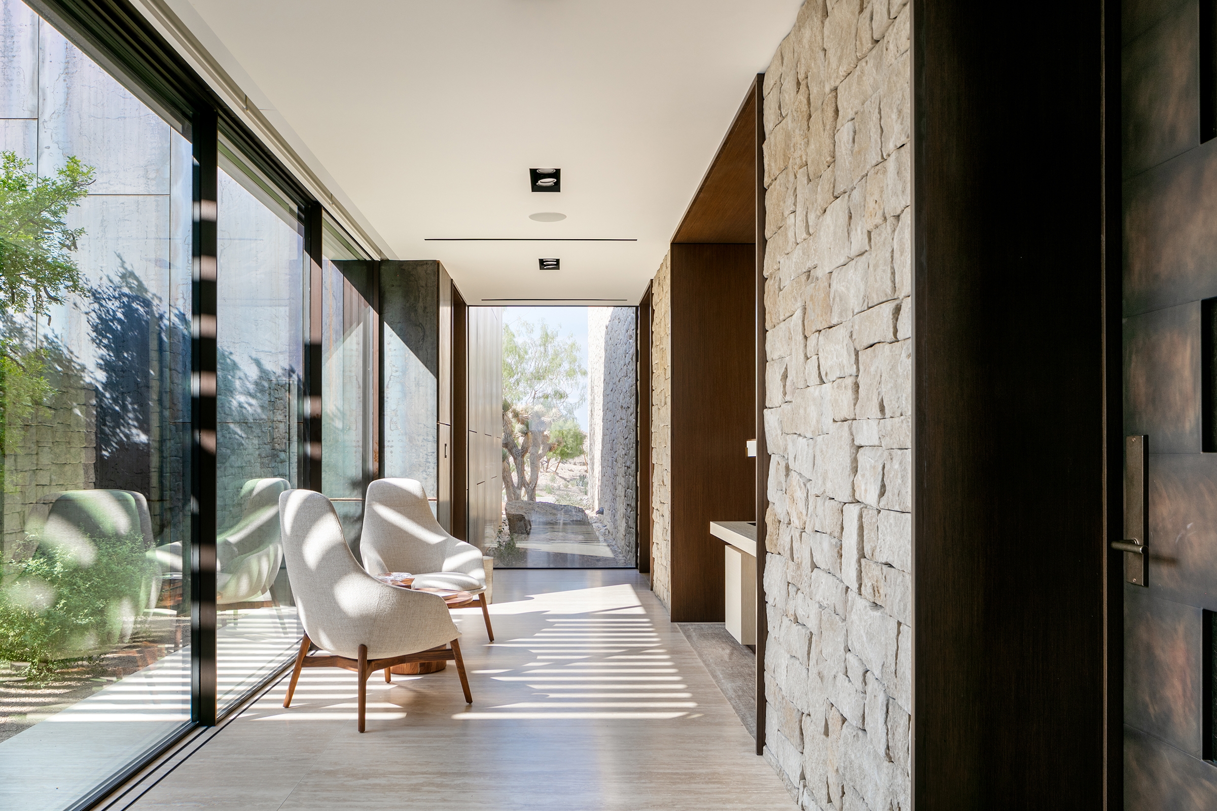 The residence is largely comprised of carefully chosen native and regionally sourced materials that will compliment and evolve with the site as they age and patina over time. The carefully curated architectural material palette includes weathered steel, reconstituted oak, and limestone.