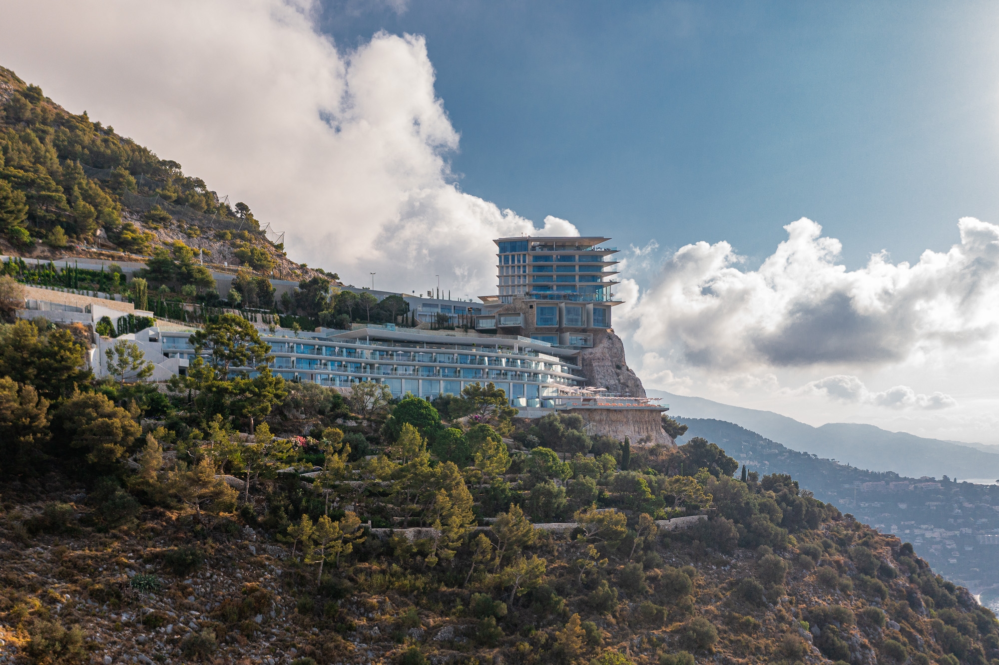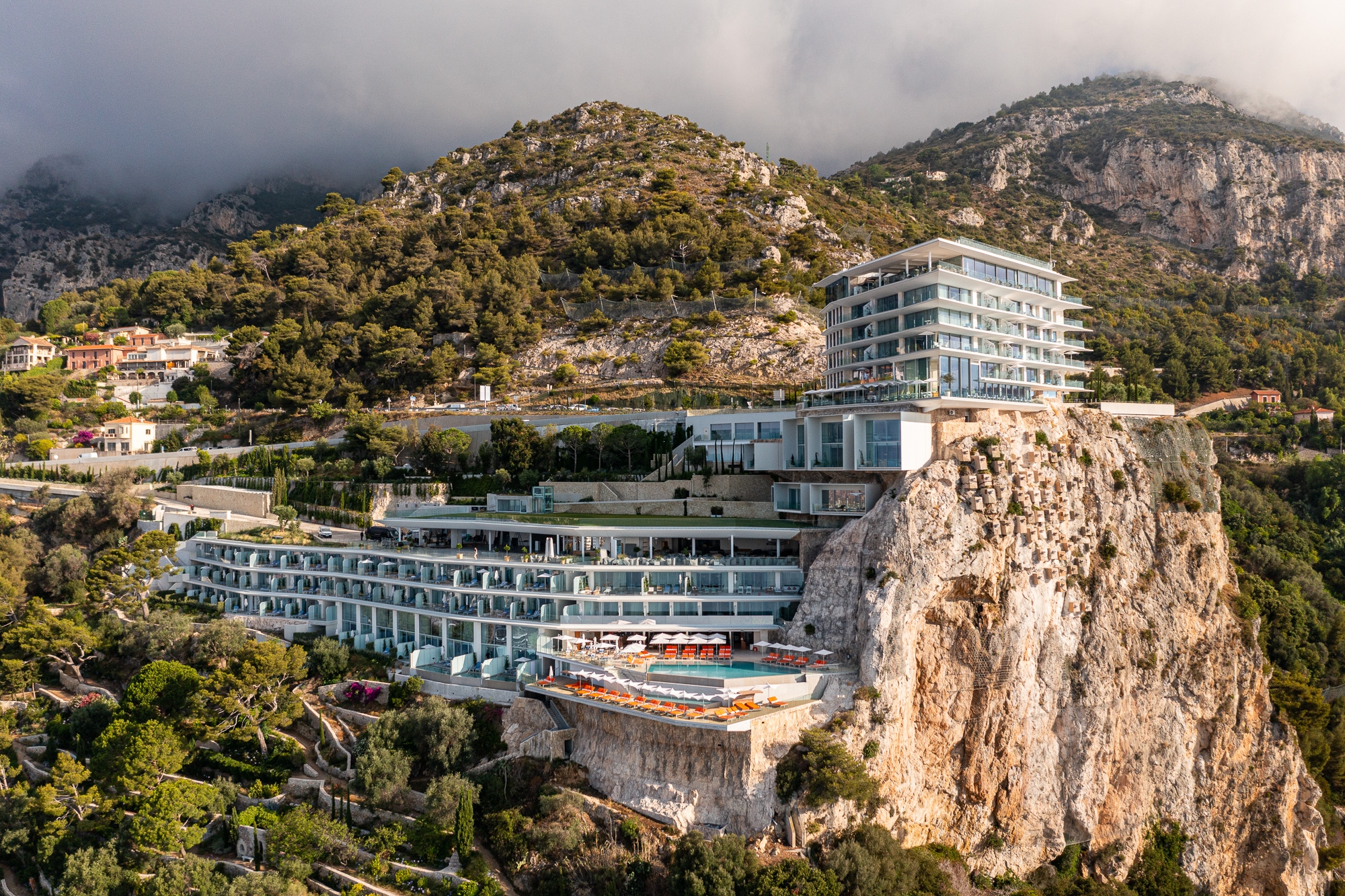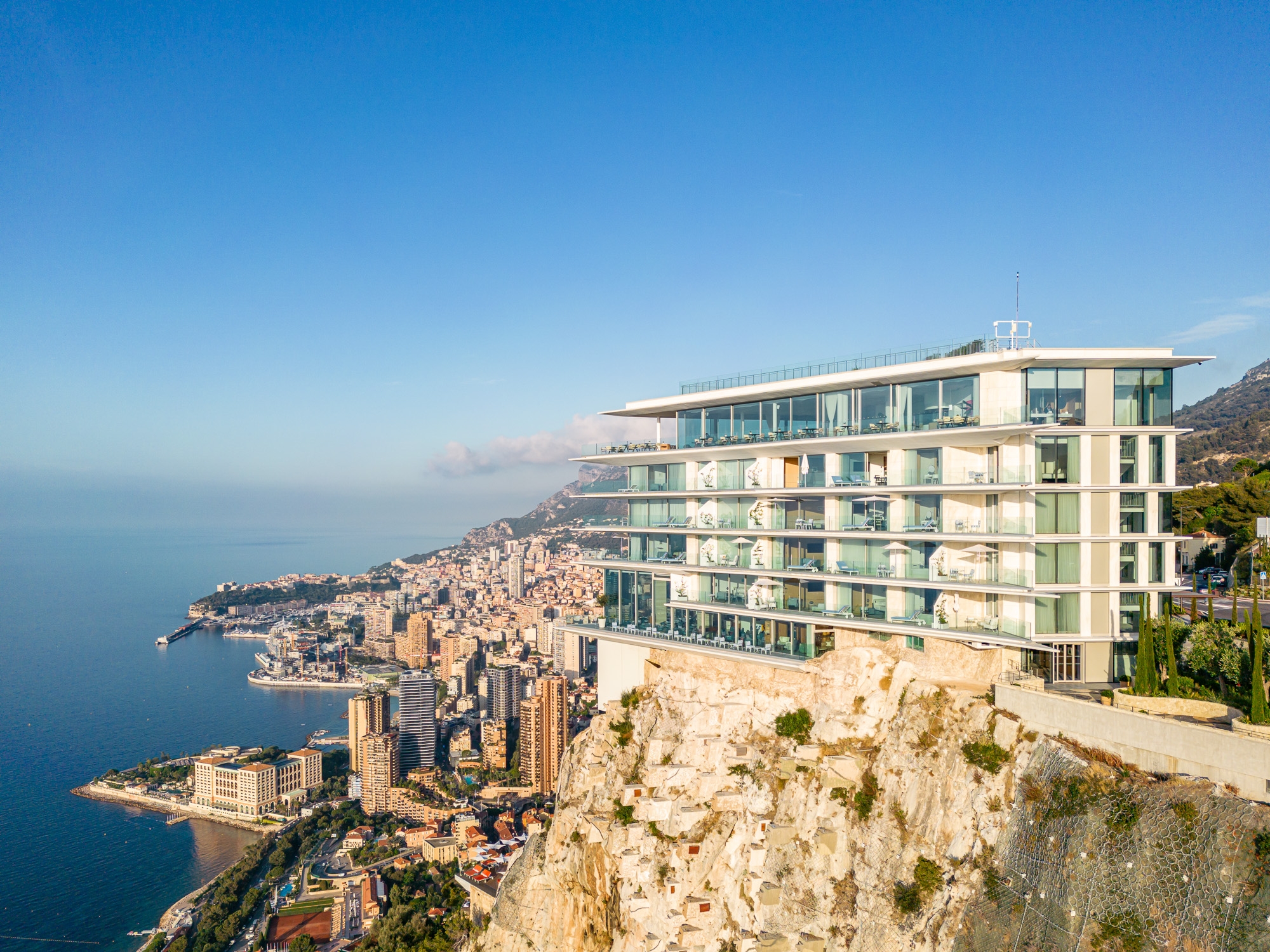 Located on a rocky peak in Roquebrune-Cap-Martin which dominates the Mediterranean and offers, from the top of its 300 meters, one of the most sumptuous panoramas of the French Riviera. A perfect symbiosis between nature and architecture. The project consisted of sublimating this osmosis and minimizing the visual impact of the building as much as possible in order to preserve the beauty of this unique landscape. The main challenge consists in the gentle intervention to reconstitute the volumetry of the hill. The ever present vegetation is an integral and very natural part of the project.