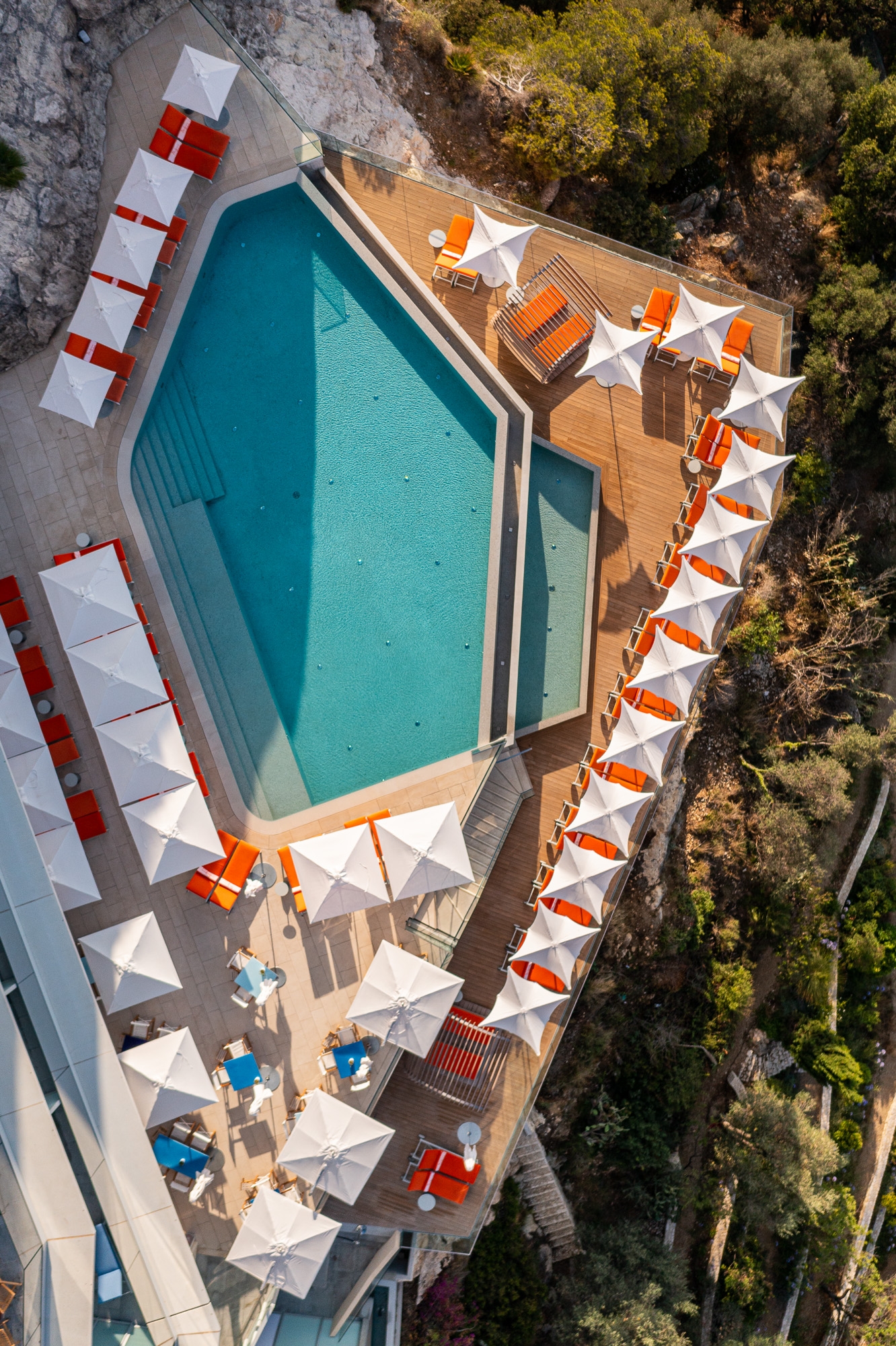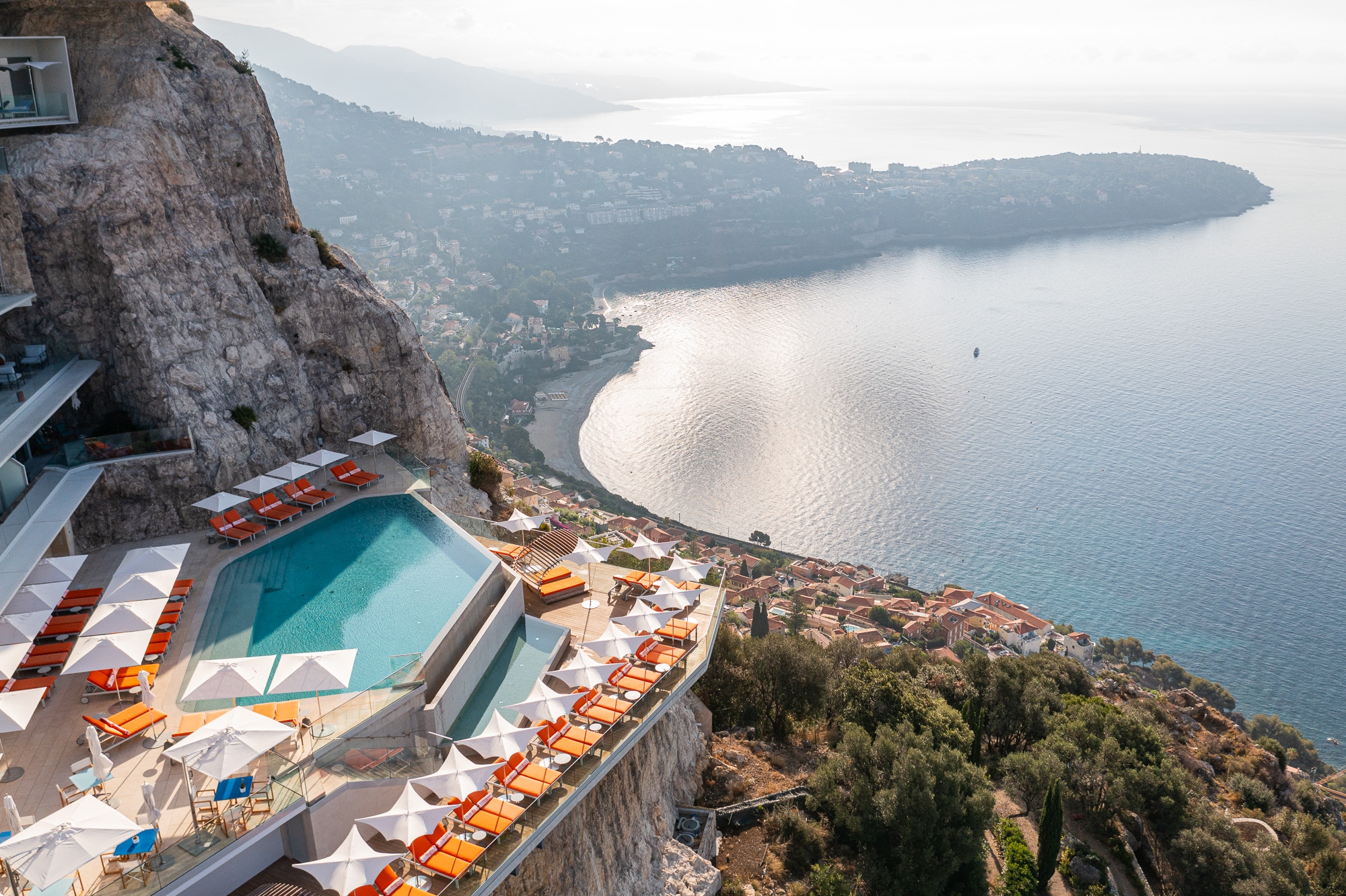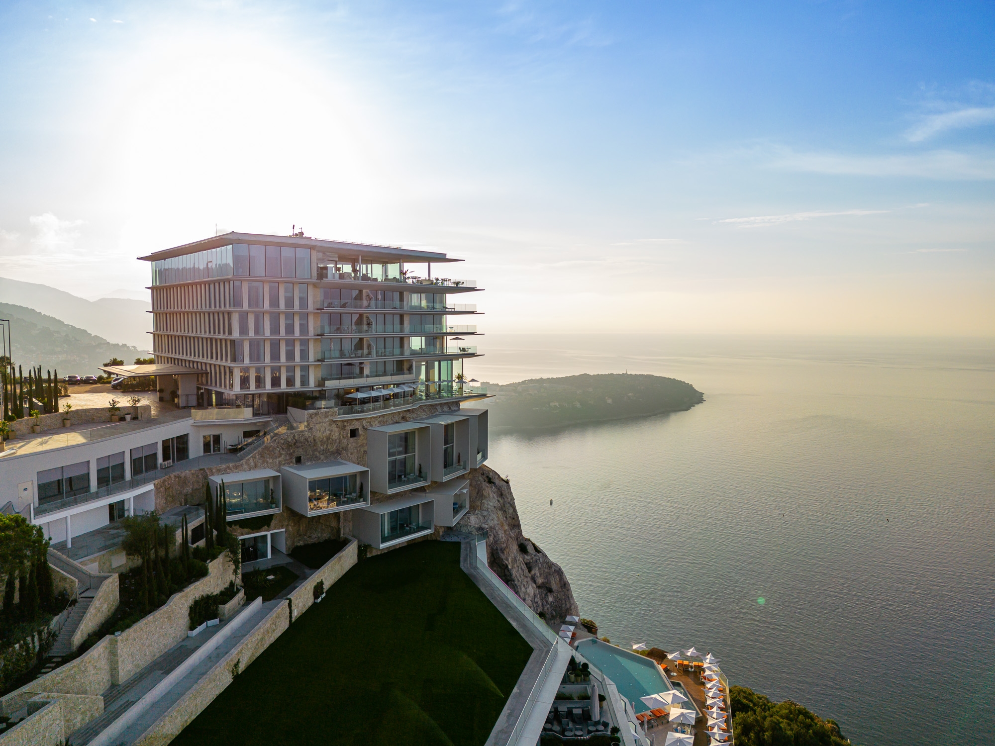The aim here is to reinforce the impression of vertigo and the idea that the building is balanced on the cliff by accentuating the overhangs. With its sober and pure volumetry, the building imposes itself by the strength of its simplicity.