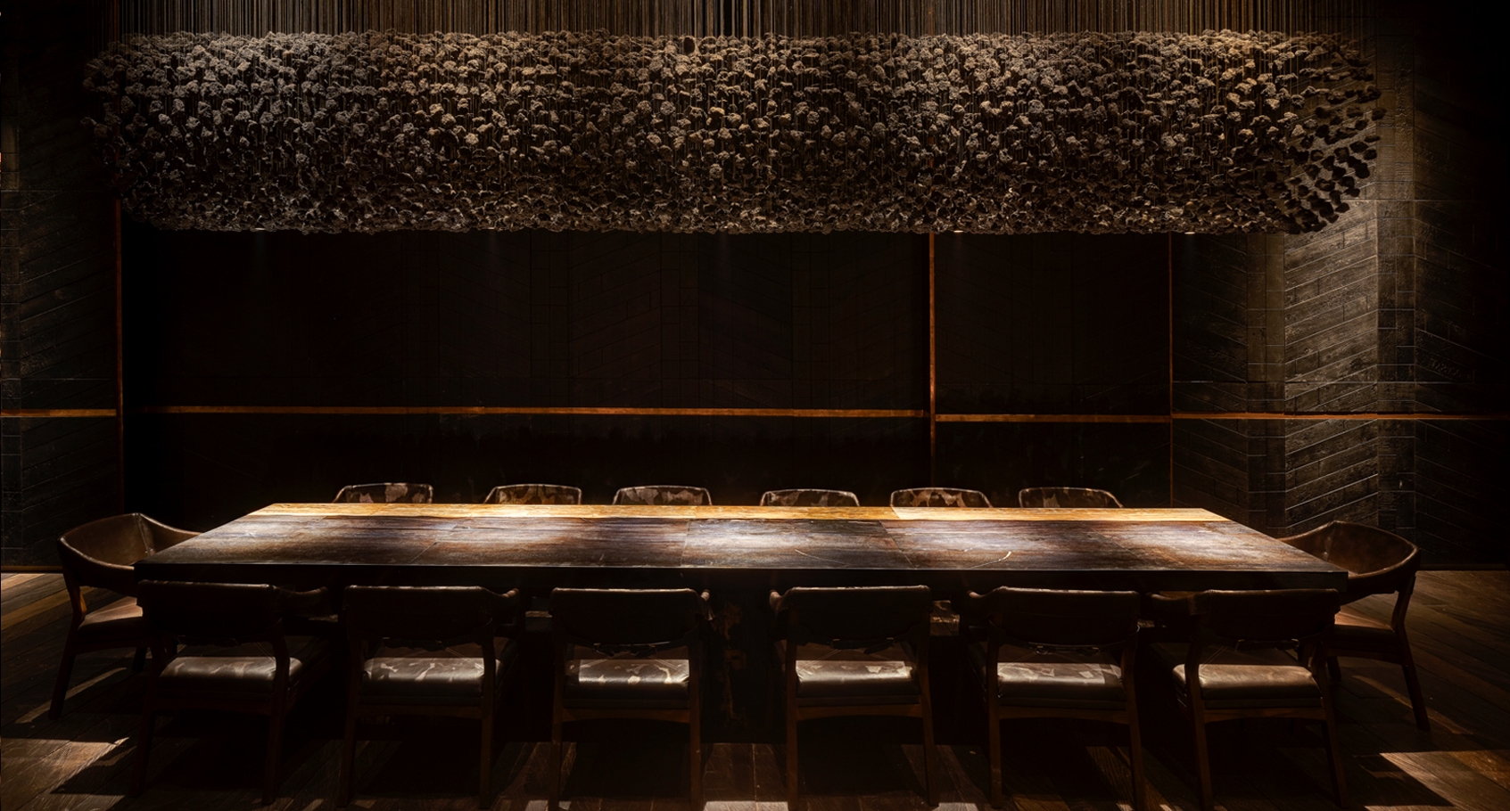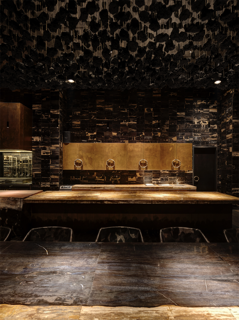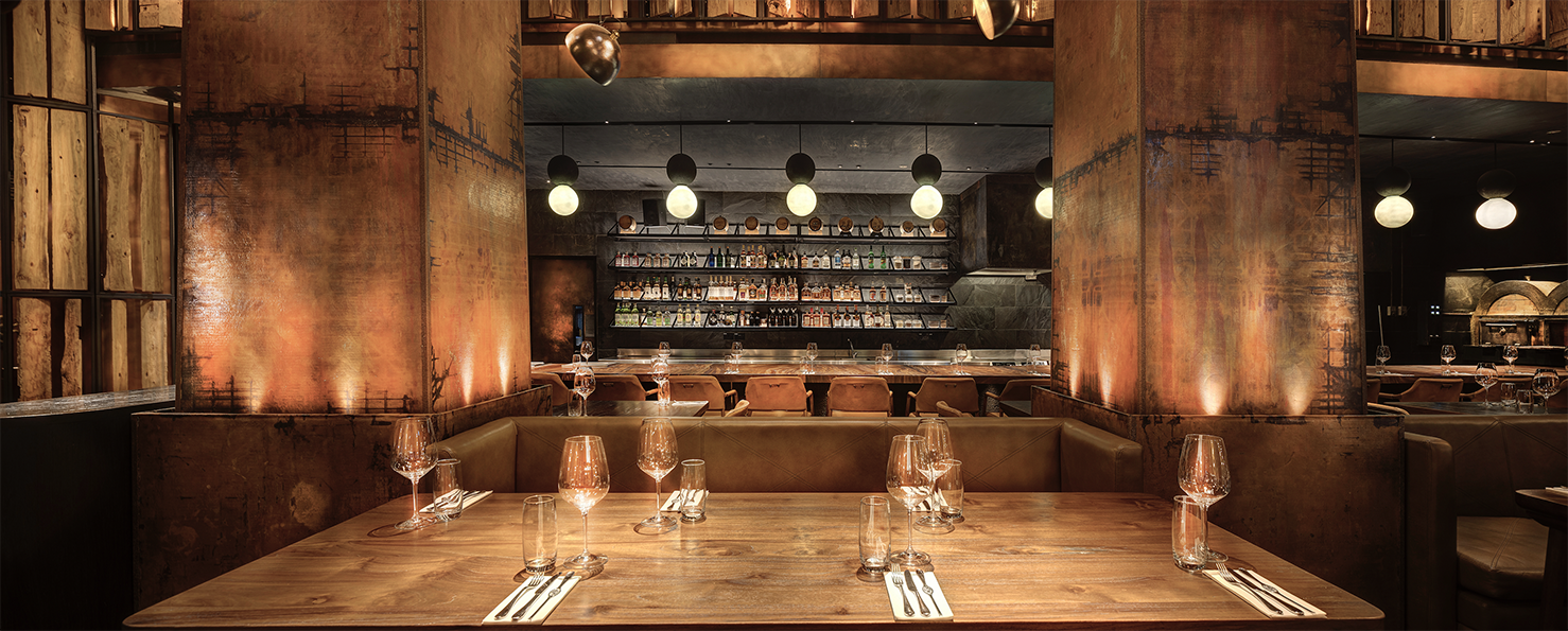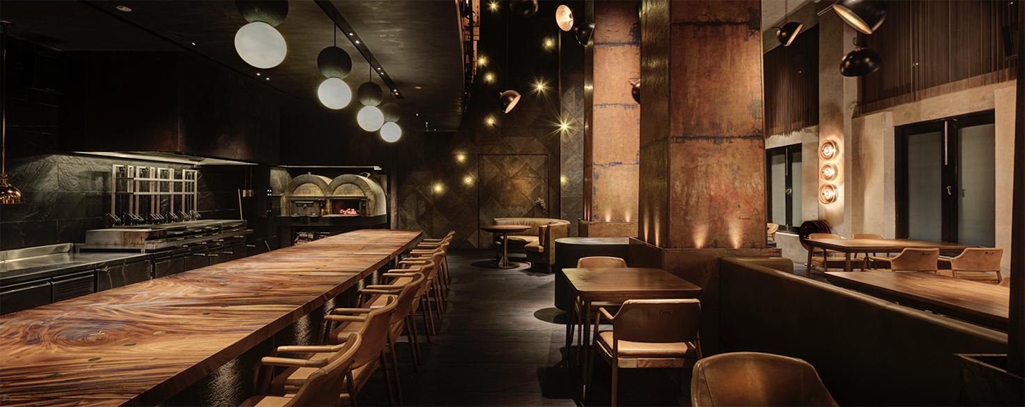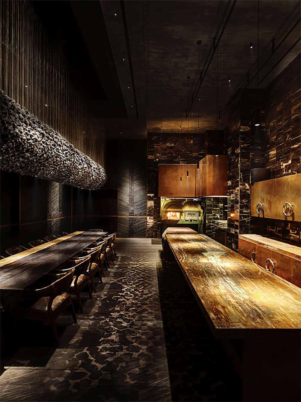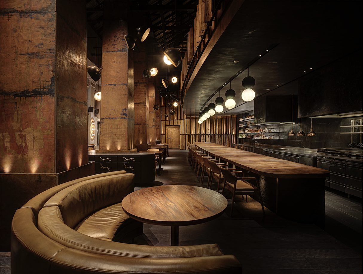 Just like the restaurants ethos, Fire and heat are the touchstones of the design. The standards were extremely high designing this Michelin-star and ranked among the Worlds 50 Best Restaurants. Located in a turn of century colonial barracks and double-height raftered ceilings. Materials and form were selected to be Primal and elemental in their nature, and prized for their transformative, shape-shifting qualities. Metals shift in colour, timbers deepen in tone.A In the main dining room, Indonesian suar is the counter table framing the open kitchen. Flooring is teak planks are reclaimed from a bridge in Indonesia. The square pillars are hand beaten copper panels. A forest of studio lamps hangs from the double-height ceiling. A walk in wine cellar which features over 5000 bottles of wine is contracted from solid timbers and brass. Accessed by a hidden pivot door in the restaurant wall is the show stopping private dining room. the walls are lined with petrified wood and timber charred in the tradition of Japanese shou sugi ban; a 14-seater, six-metre-long dining table of petrified black wood; and soaring high above, an incredible light installation made of 5,000 black lava stones.