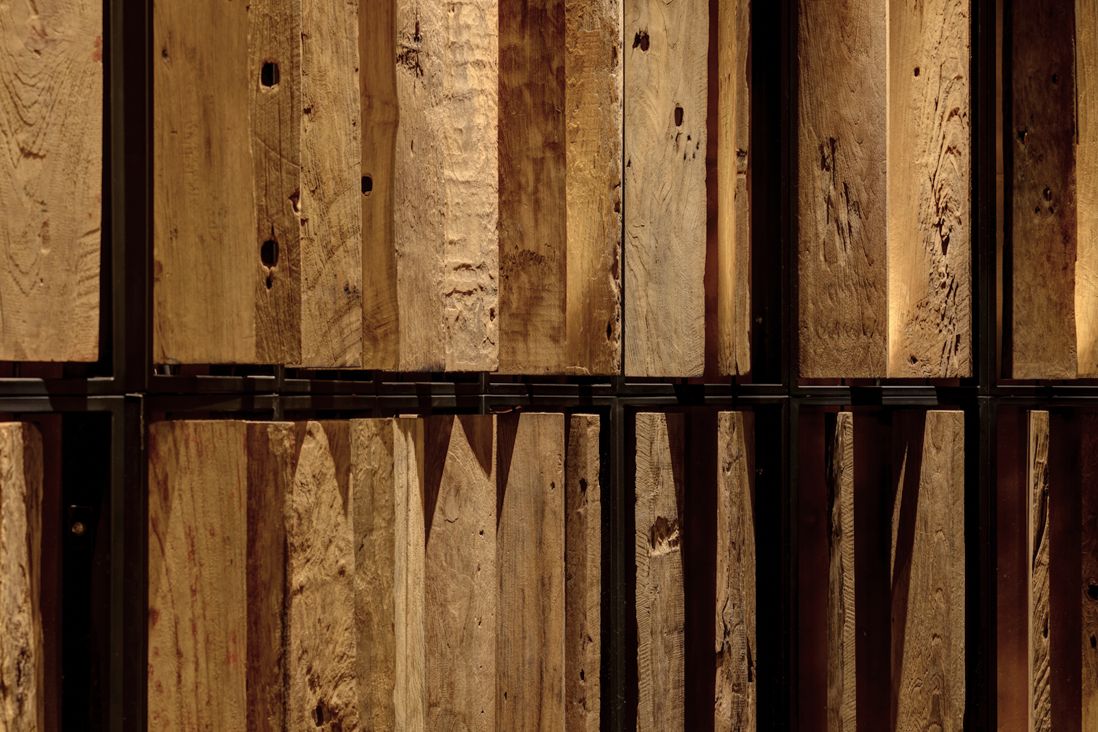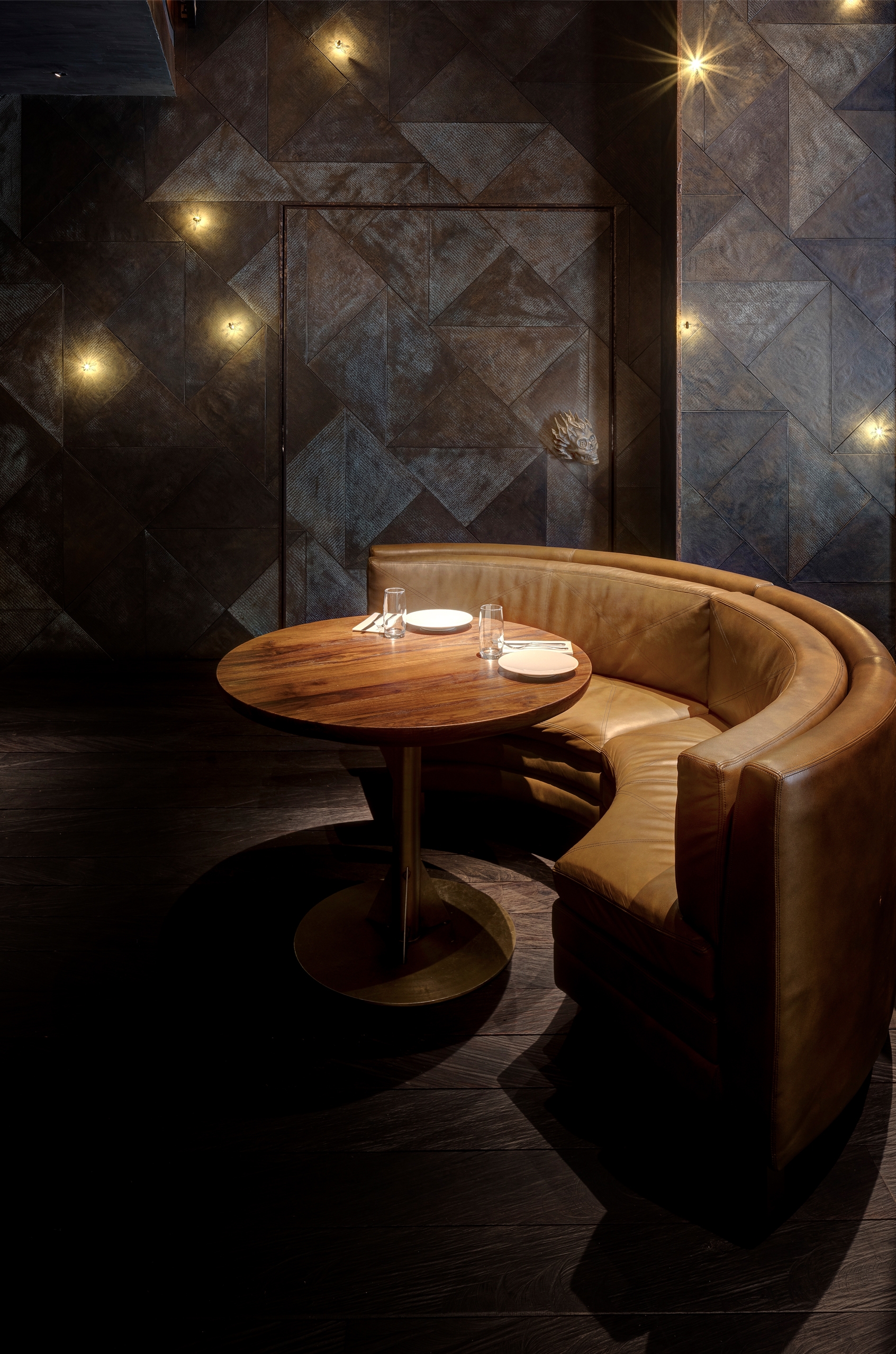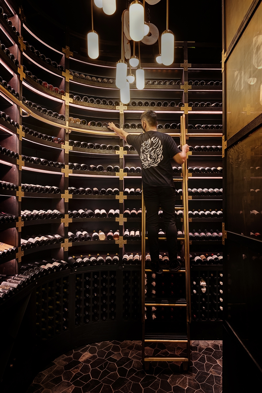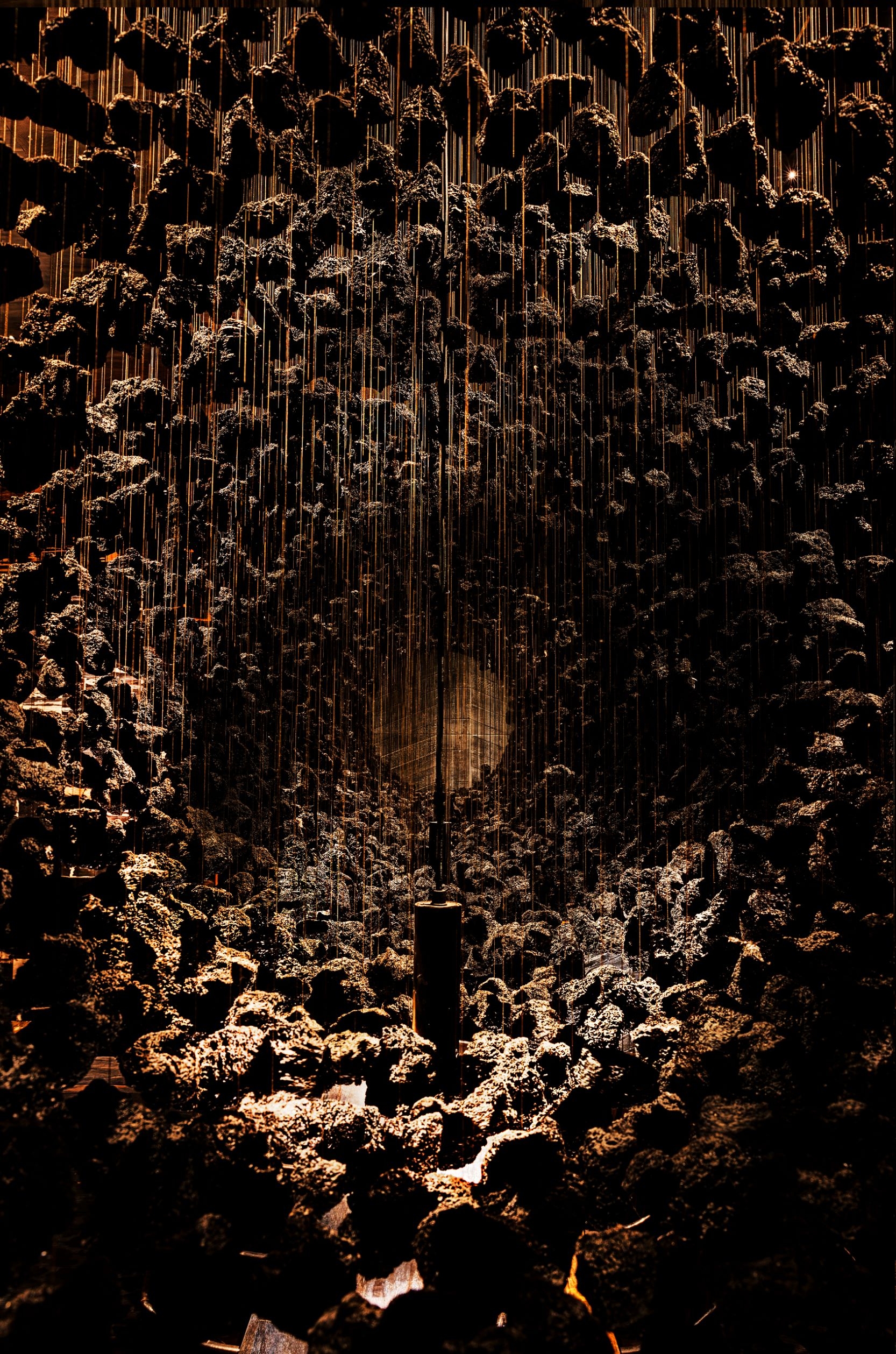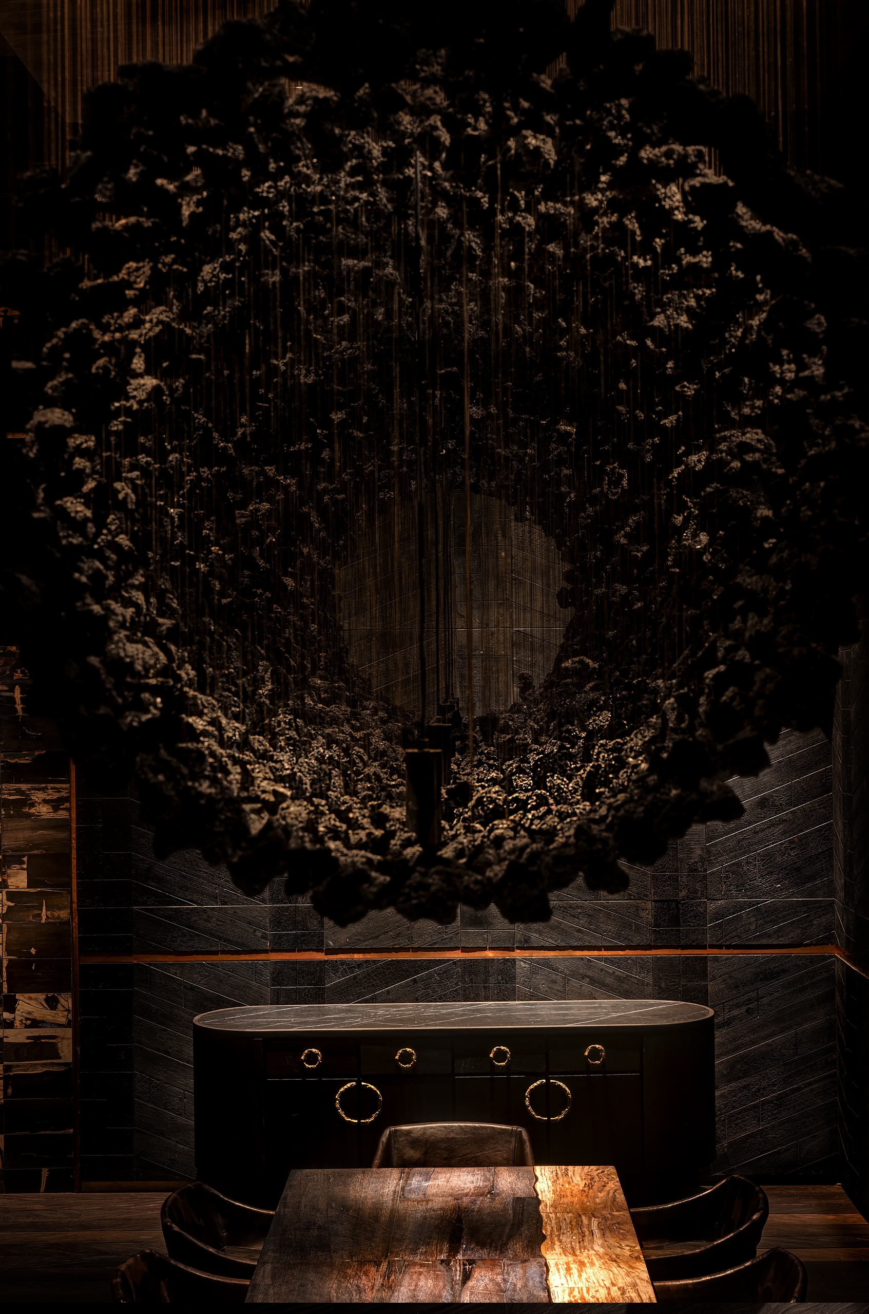 Just like the restaurants ethos, Fire and heat are the touchstones of the design. The standards were extremely high designing this Michelin-star and ranked among the Worlds 50 Best Restaurants. Located in a turn of century colonial barracks and double-height raftered ceilings. Materials and form were selected to be Primal and elemental in their nature, and prized for their transformative, shape-shifting qualities. Metals shift in colour, timbers deepen in tone.A In the main dining room, Indonesian suar is the counter table framing the open kitchen. Flooring is teak planks are reclaimed from a bridge in Indonesia. The square pillars are hand beaten copper panels. A forest of studio lamps hangs from the double-height ceiling. A walk in wine cellar which features over 5000 bottles of wine is contracted from solid timbers and brass. Accessed by a hidden pivot door in the restaurant wall is the show stopping private dining room. the walls are lined with petrified wood and timber charred in the tradition of Japanese shou sugi ban; a 14-seater, six-metre-long dining table of petrified black wood; and soaring high above, an incredible light installation made of 5,000 black lava stones.