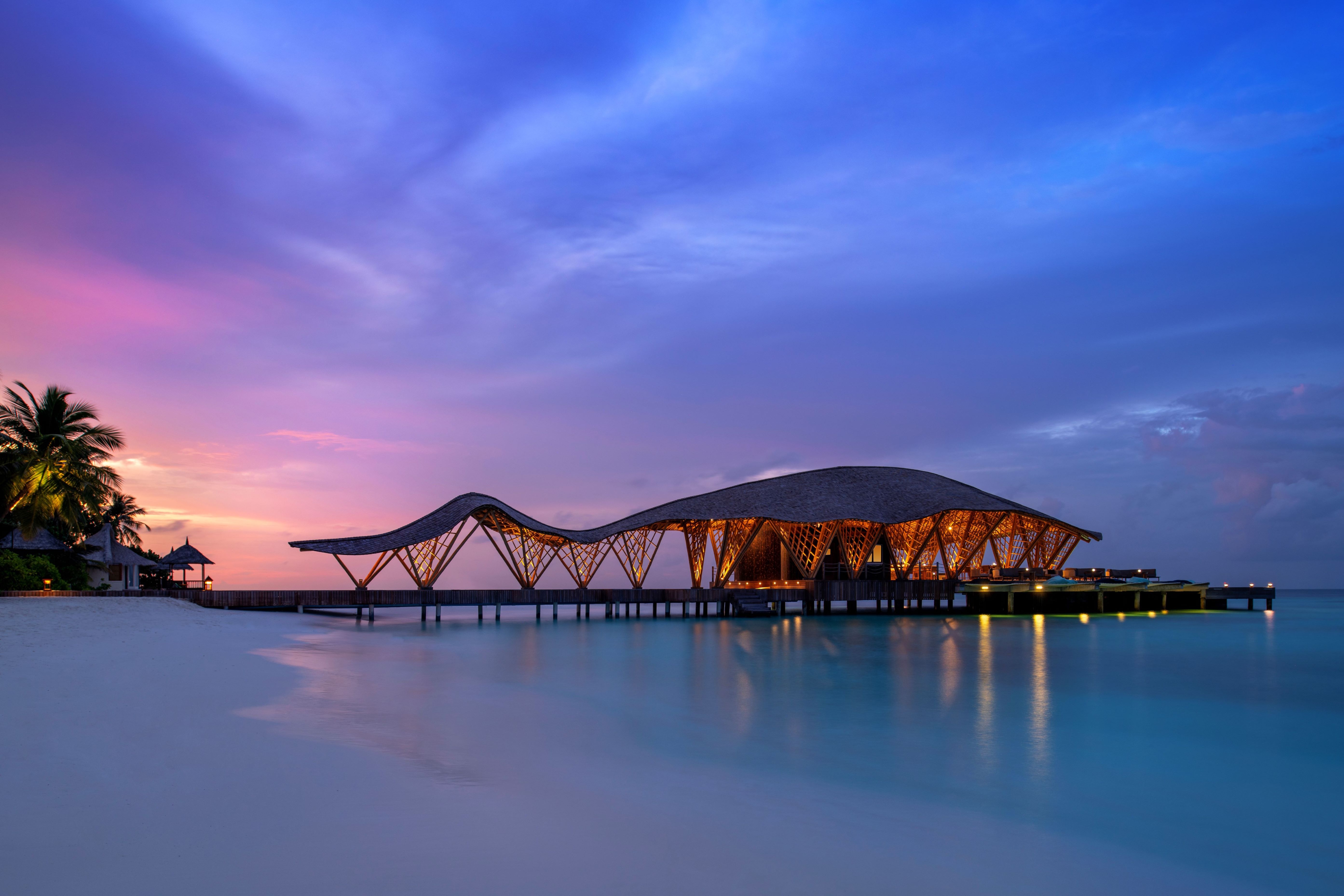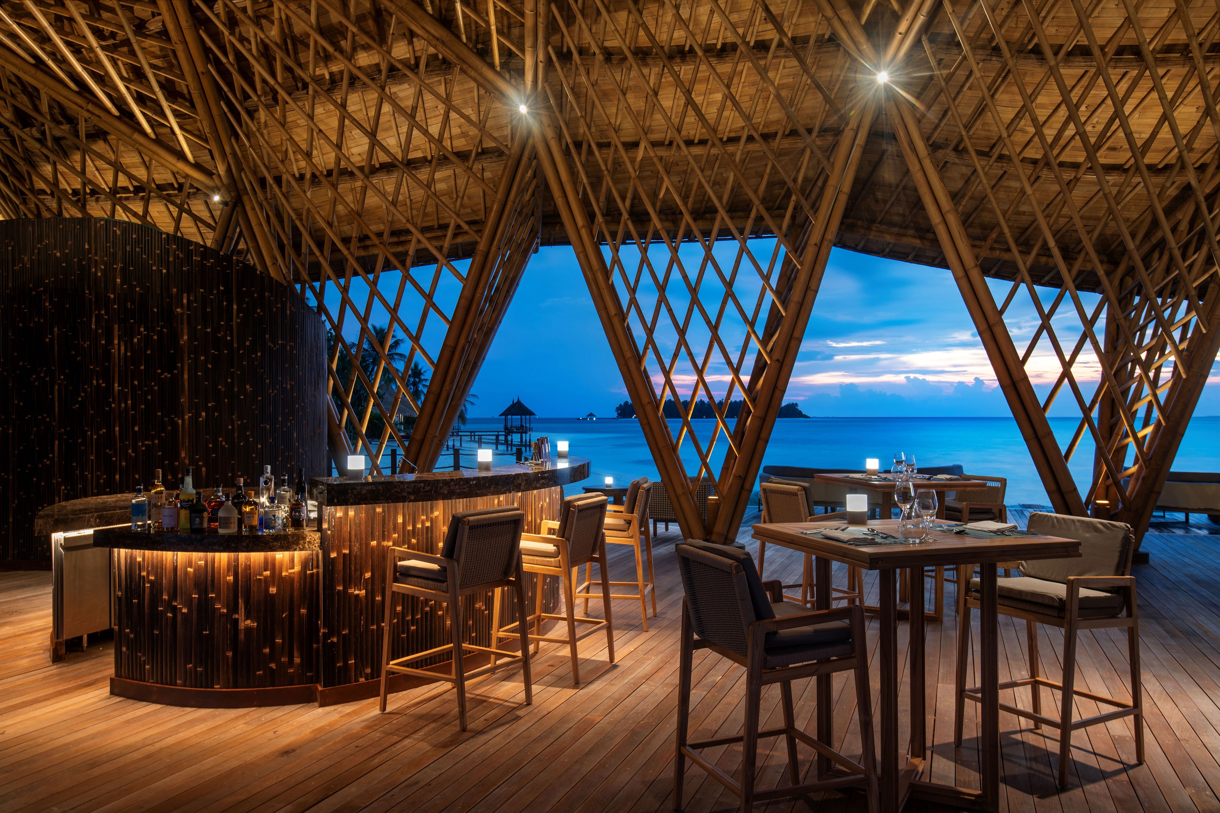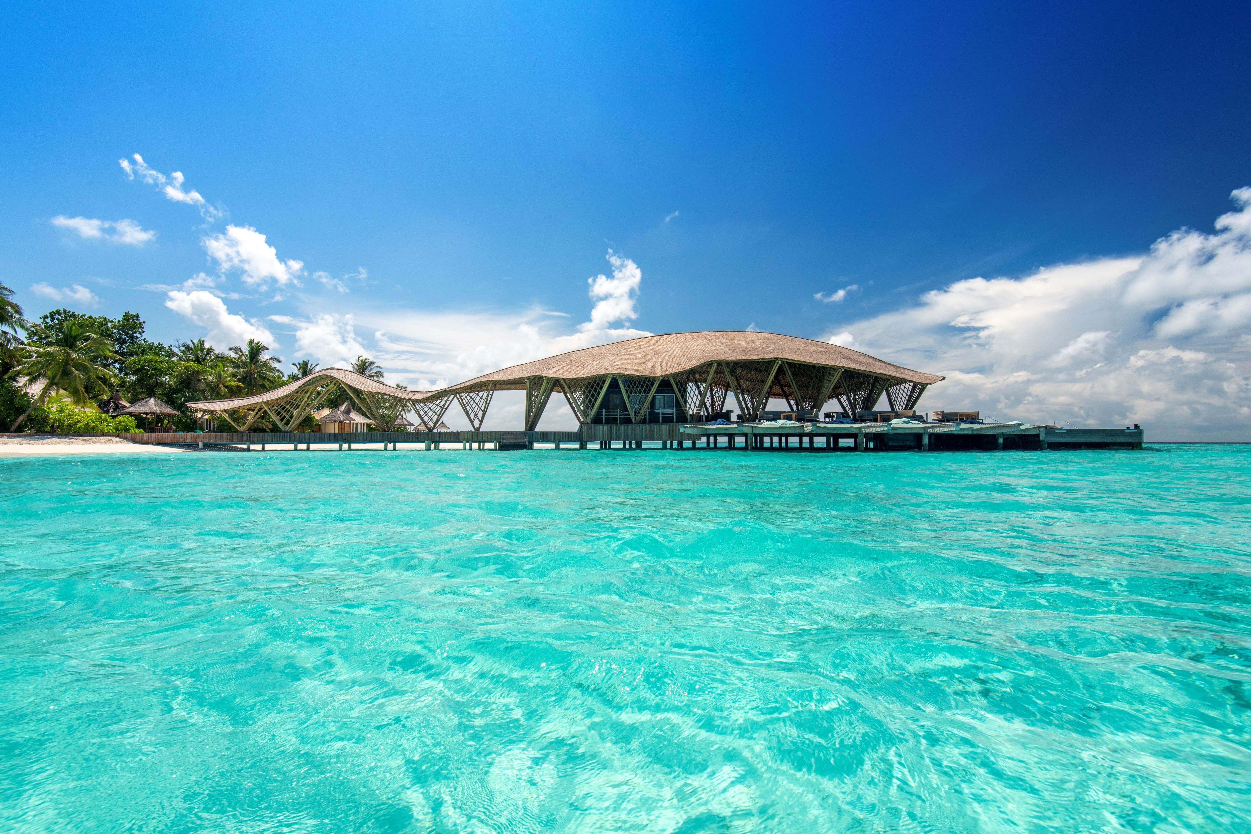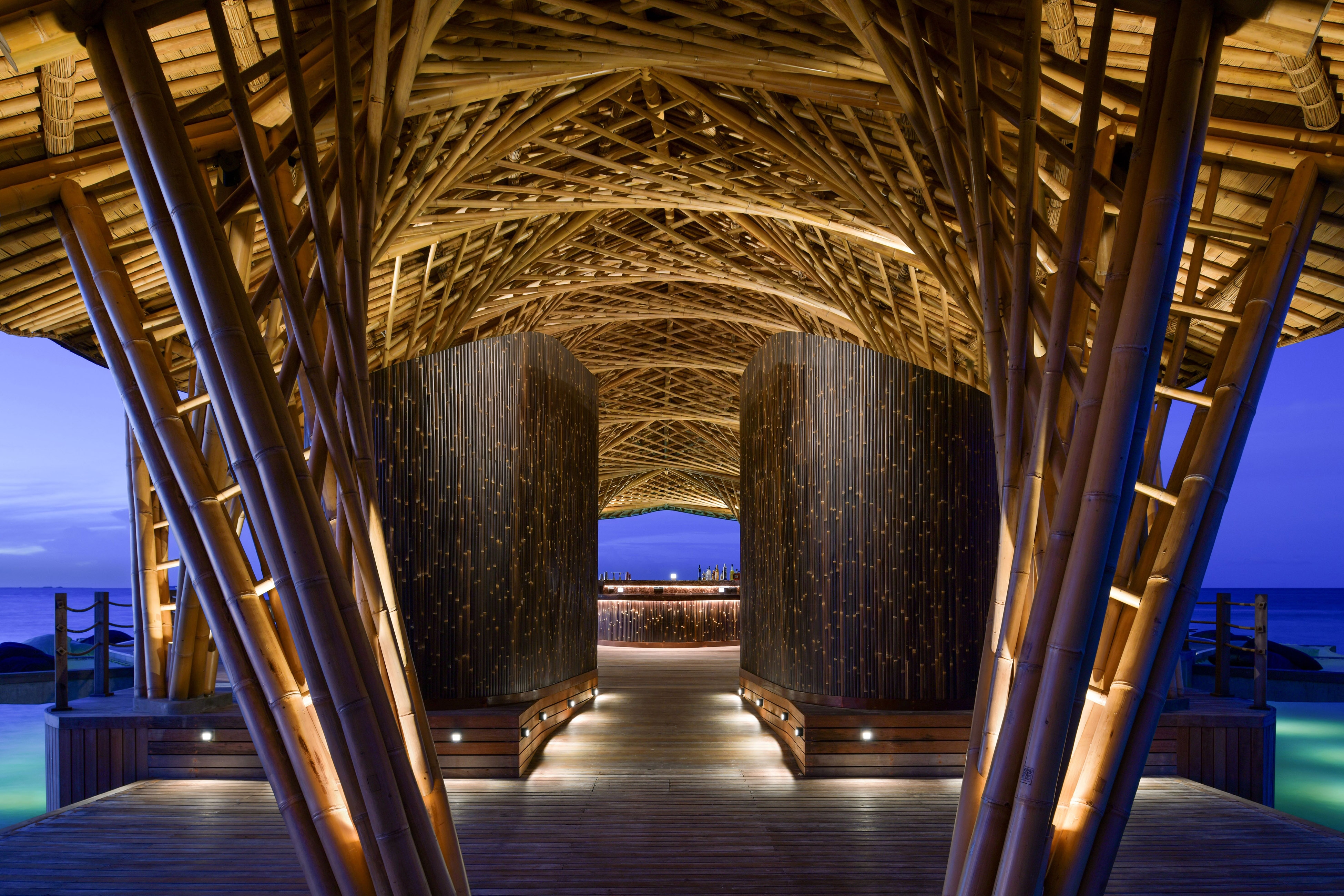 Crafted meticulously with bamboo, the structure is amplified by the dramatic Maldivian landscape and reflected in the mirror like lagoon. The looping, shingled tail winds back down the jetty to link the building with the mainland and to guide the visitors into the building.