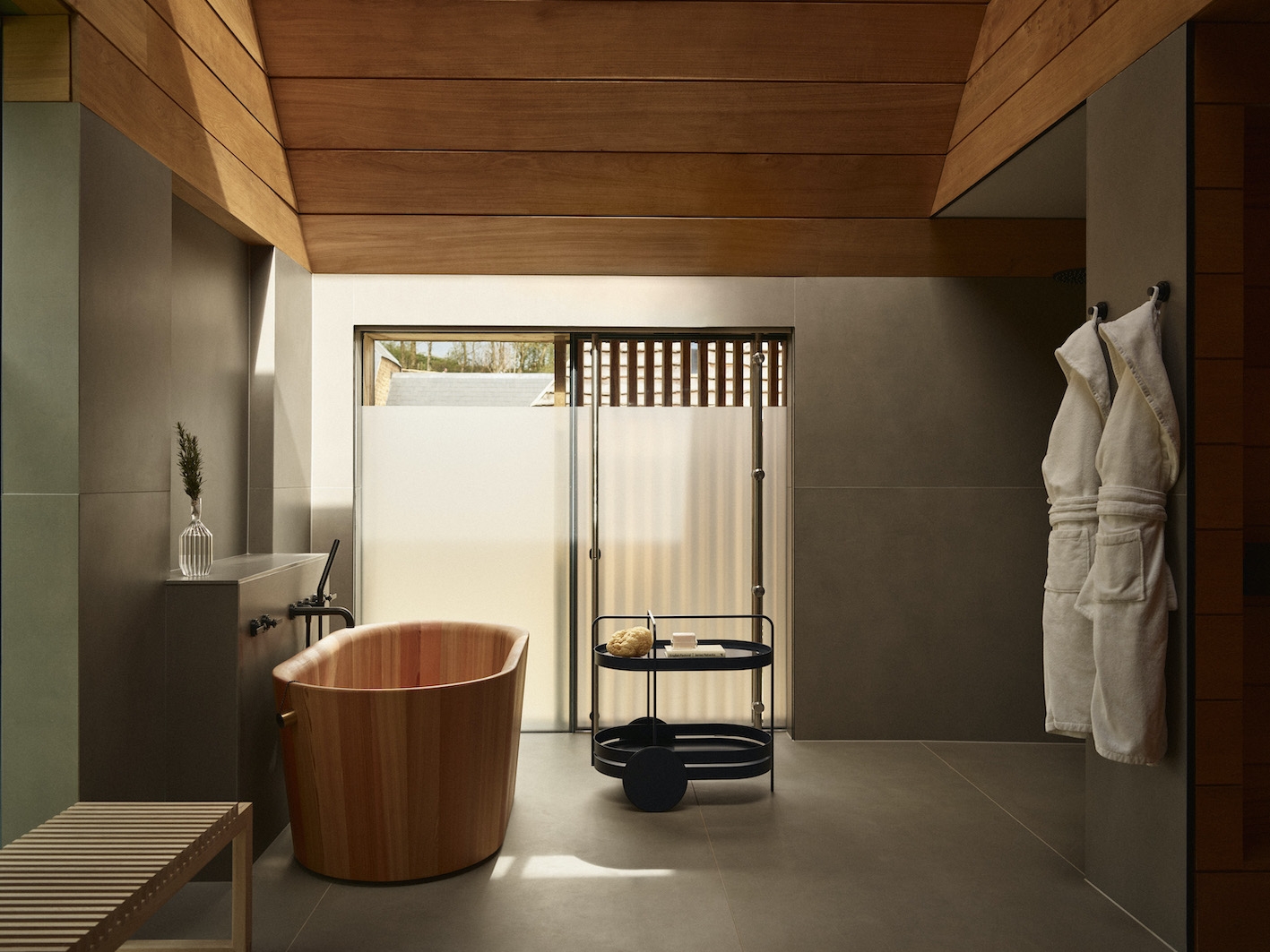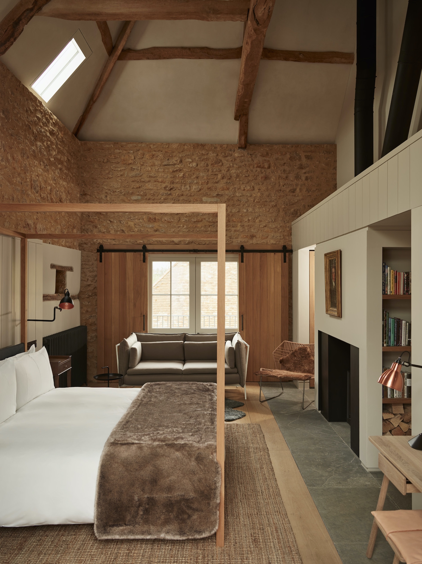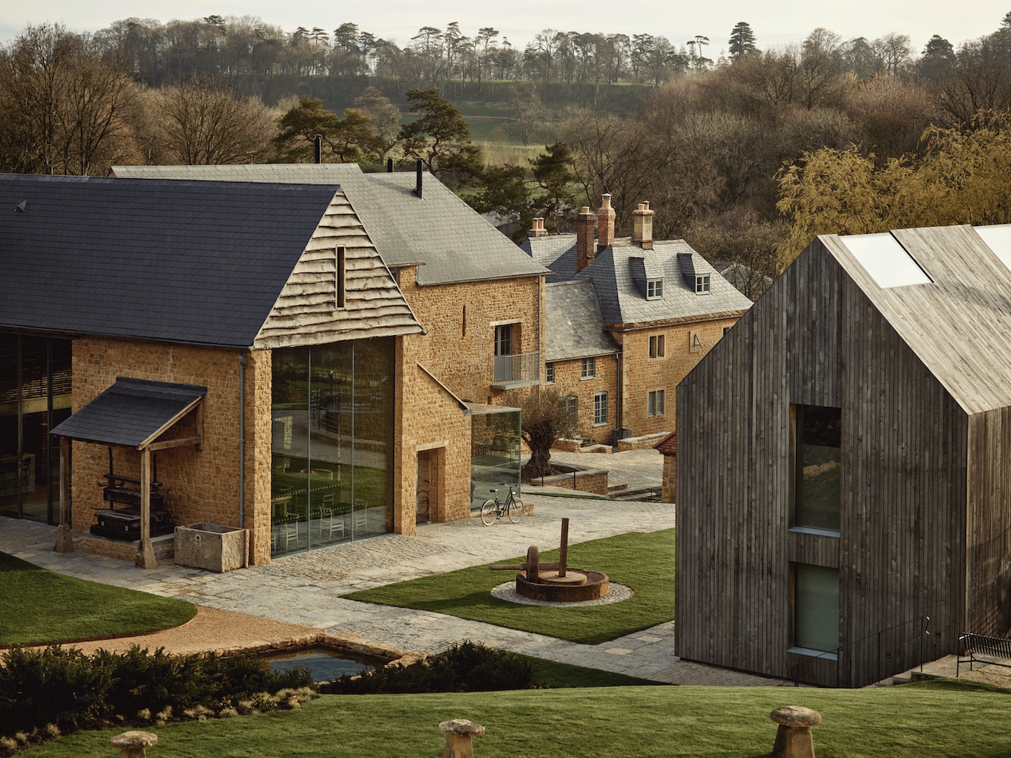 A sophisticated, pared-back design, inspired by the local landscape and vernacular, uses a limited pallet of English stones, oak timber, glass, marble and plaster in order to reinstate the original spirit of the nine buildings. Low build miles and the use of local artisans and craftsmen were key.