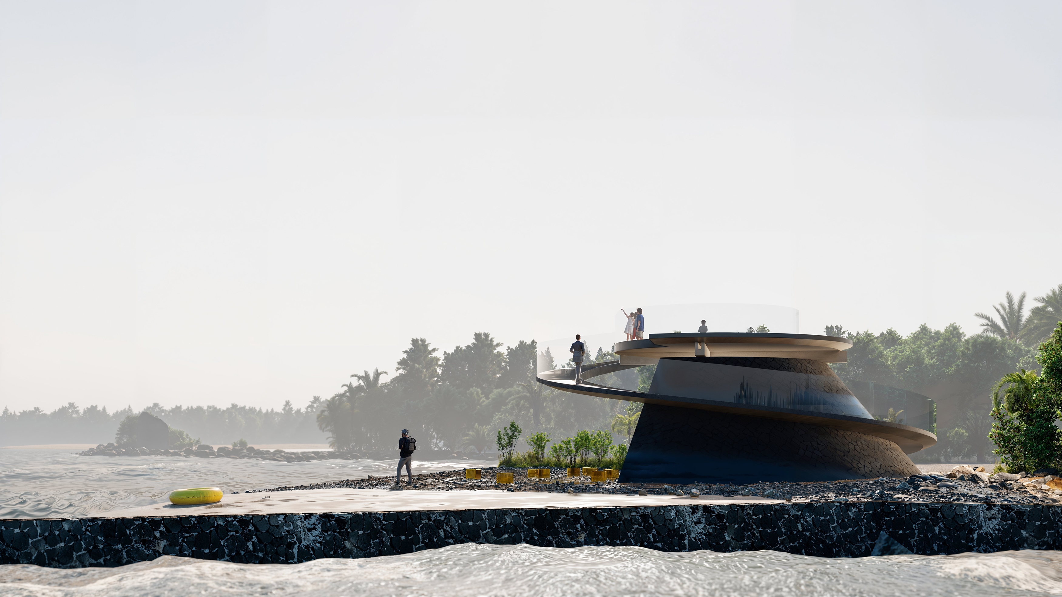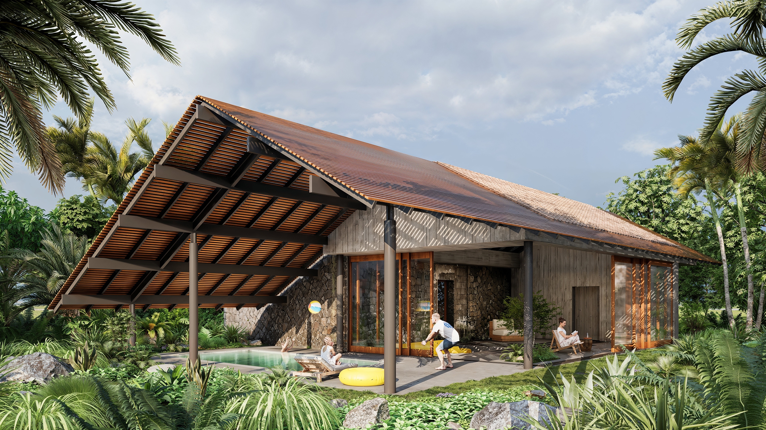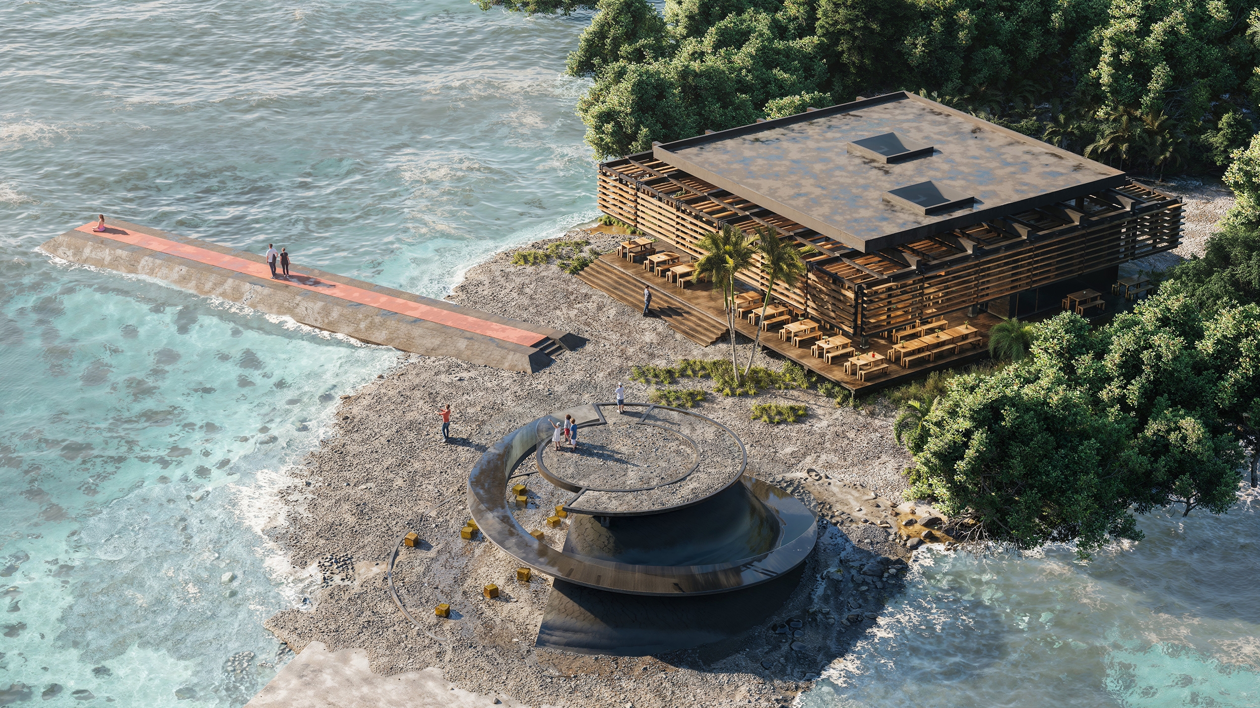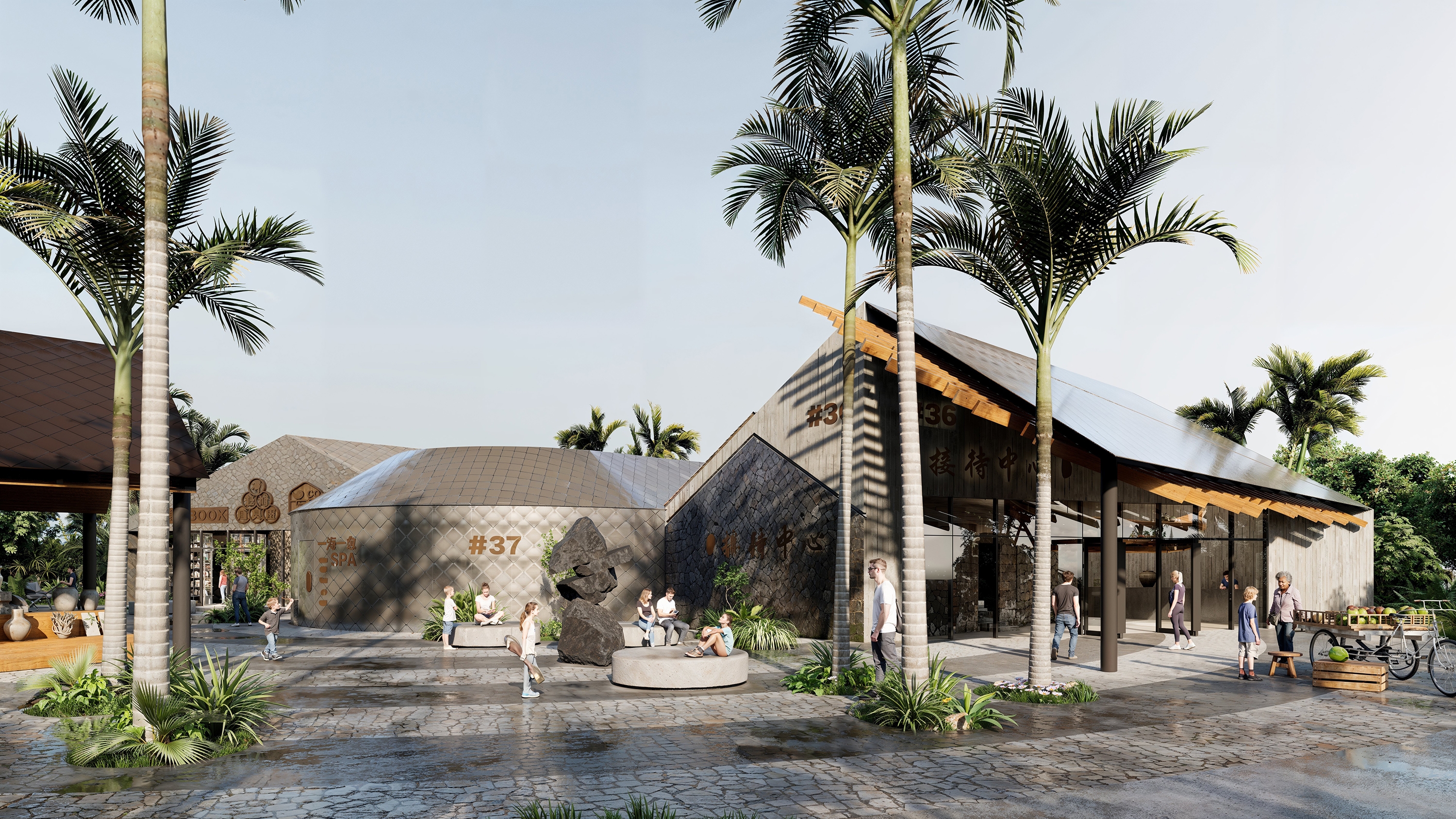 A two-hour drive to the west of Haiko on the tropical island of Hainan, China, an abandoned fishing village awaits revitalization into a boutique hotel and beach destination. At the village's harbor, a stone barrier served as a fish farm and will be used as a tidal pool for the hotel. The remaining old fishermen's cabins built from local lava stone will be preserved and transformed into various hotel villa typologies. A newly built restaurant by the beach, a café that serves as a viewing platform, and a lighthouse bookstore will serve the boutique hotel.