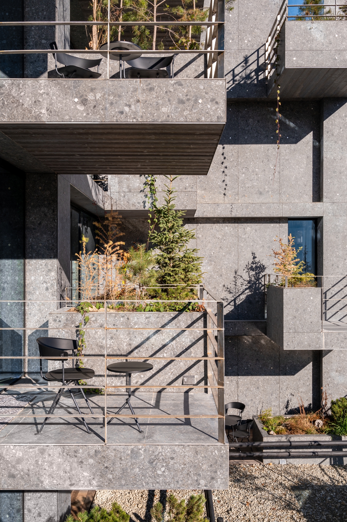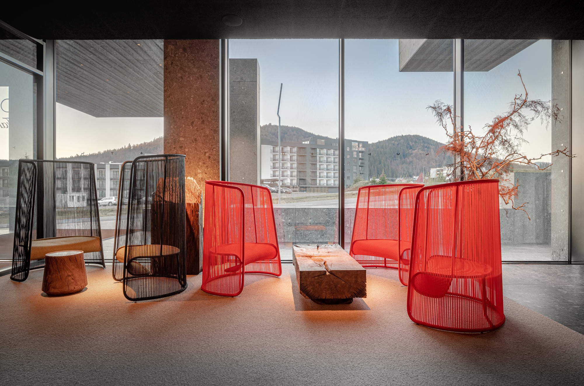 The hotel building offers a 360-degree view of the Carpathian landscape. You can see a different part of the mountain slopes from the windows of each room. The building is organically integrated into the landscape and resembles a rock with cascades of plants. Local trees, grasses, strawberries, and blackberries decorate the facade, hotel terraces, and balconies. Plants change in the same way as it occurs in nature: some grow at the foot of the mountain, others at the slop and the top.