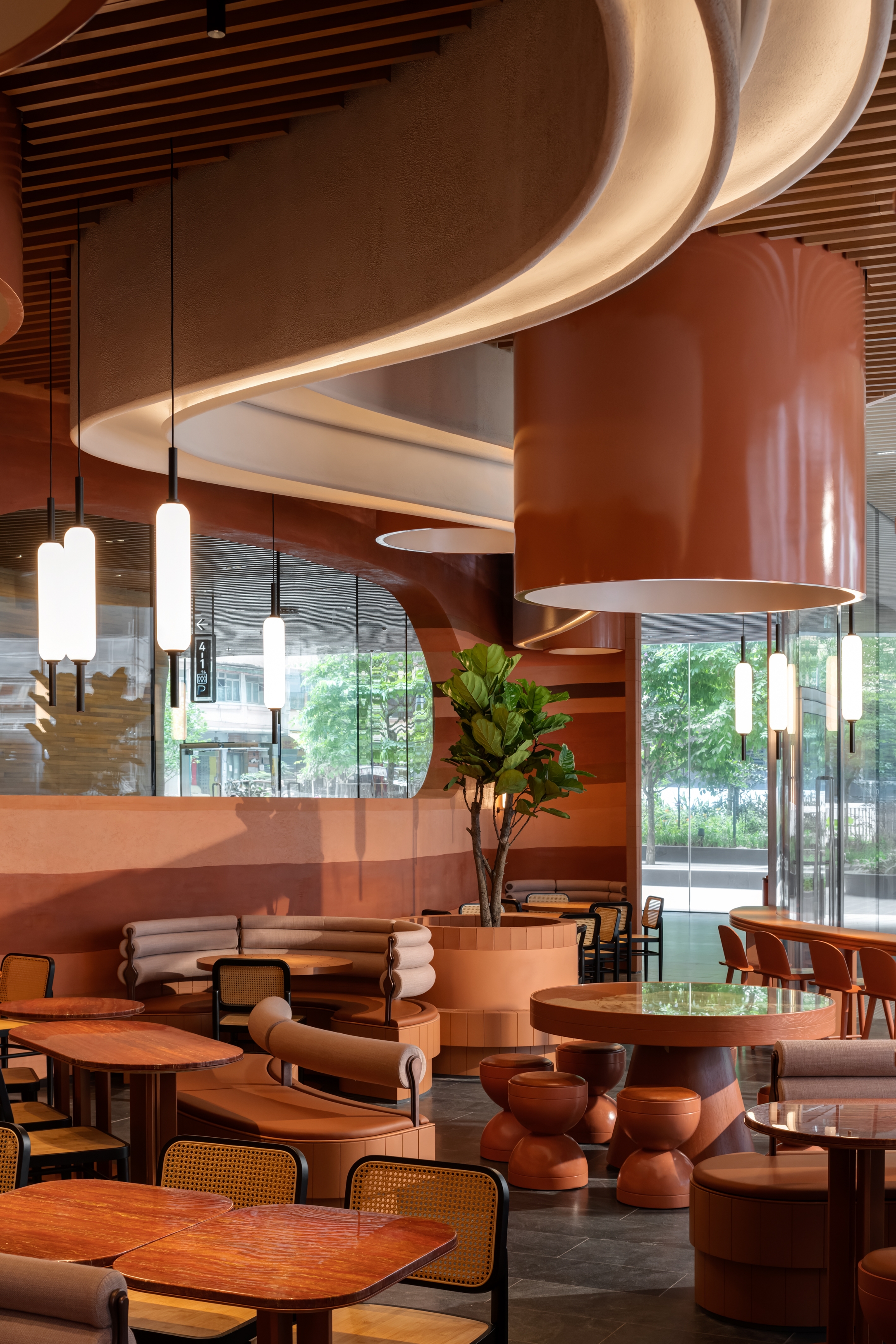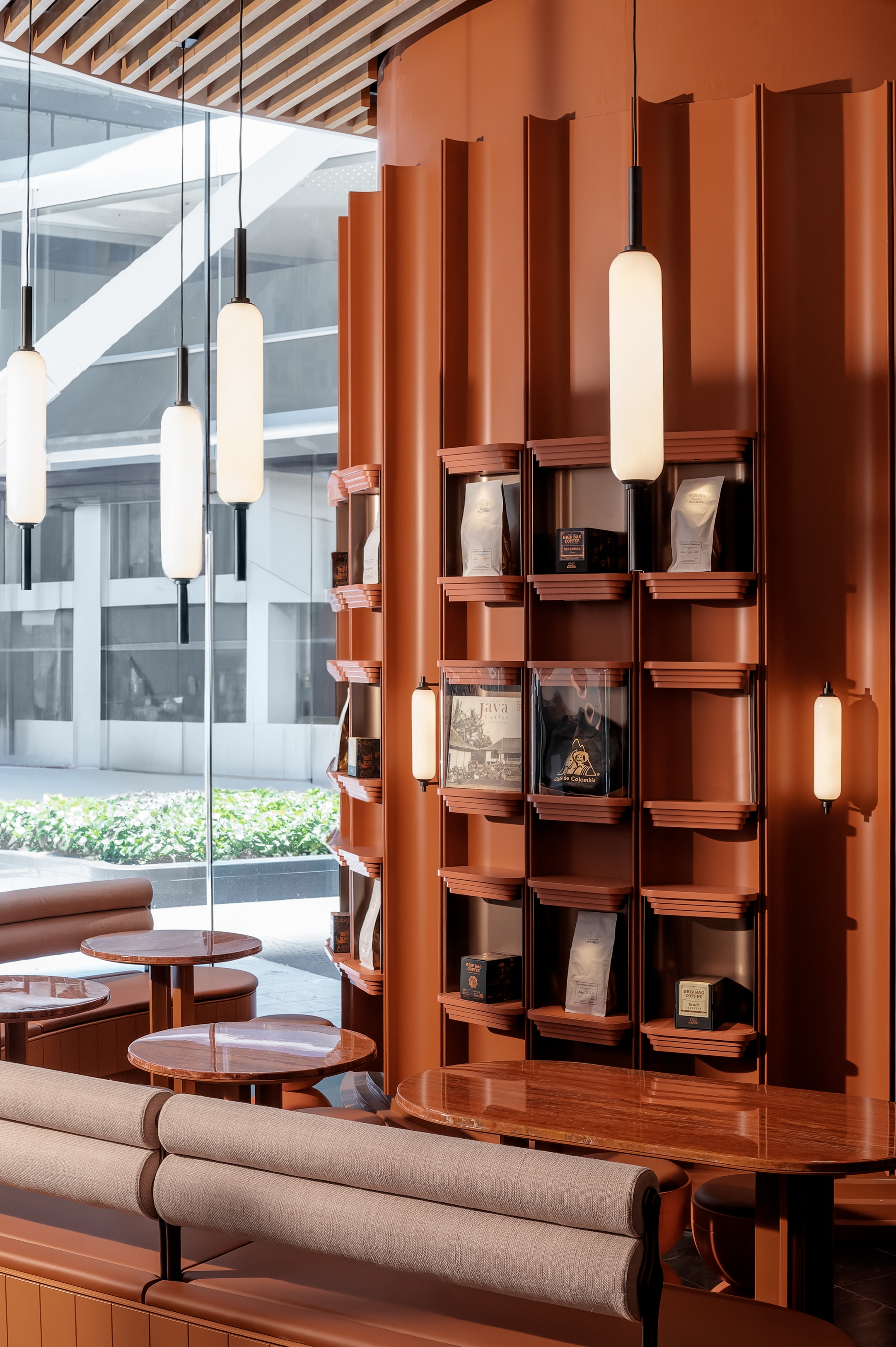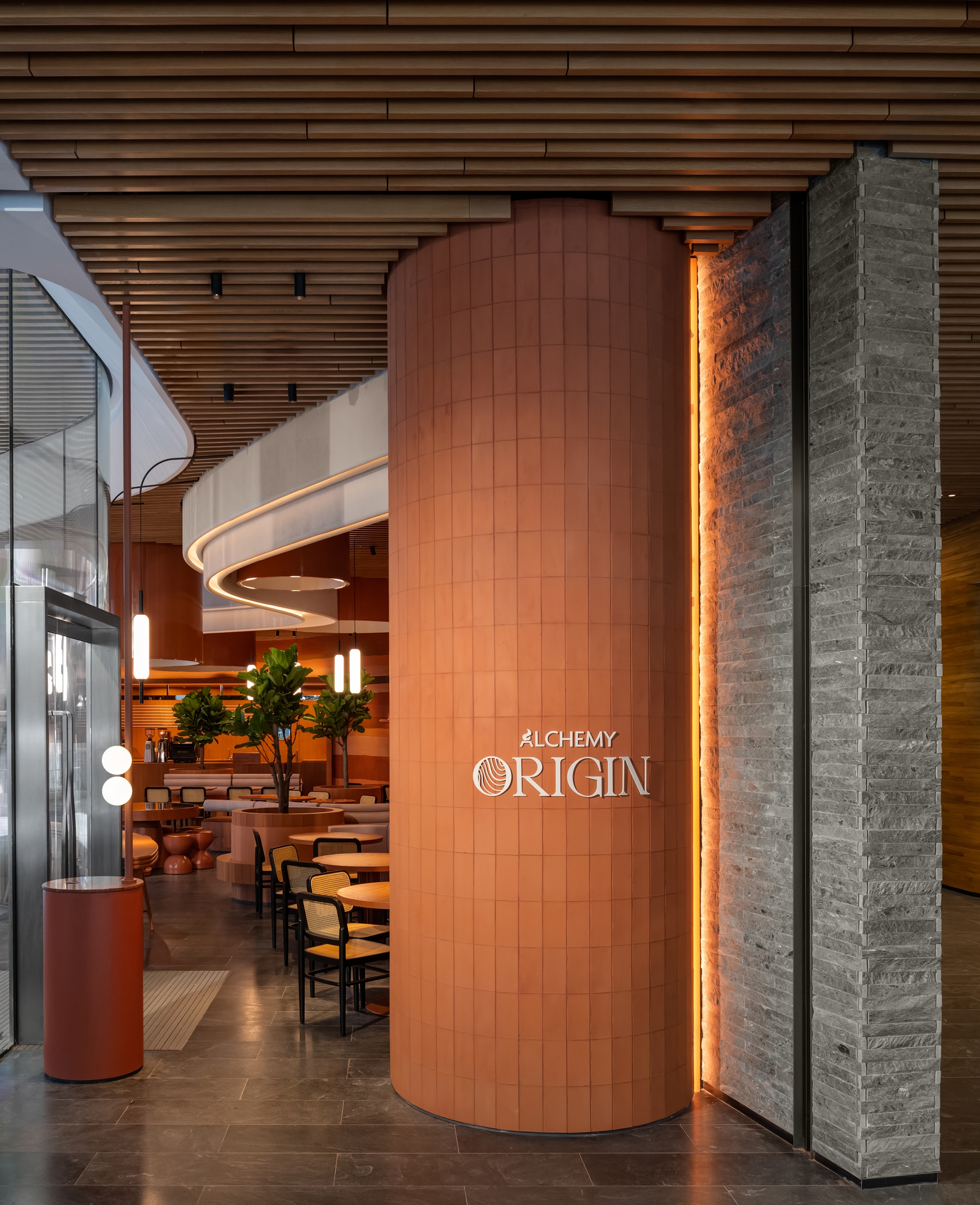 The design features scheme whose colours and form were inspired by coffee origins and the topography of those locations. Coffee is sourced from across the globe and is grown in vastly different topographic and environmental conditions. Metagram carefully sculpted the layout and key architectural features as dramatic curved objects synchronised with the challenging shape of the site. The outcome was a richly textural and dynamic cafe environment, with form perfectly tied into its curved context and distinct enough to highlight the Alchemy brand. The design successfully navigated extremely complicated geometry and external input, whilst complementing context and creating a successful brand and dining experience.