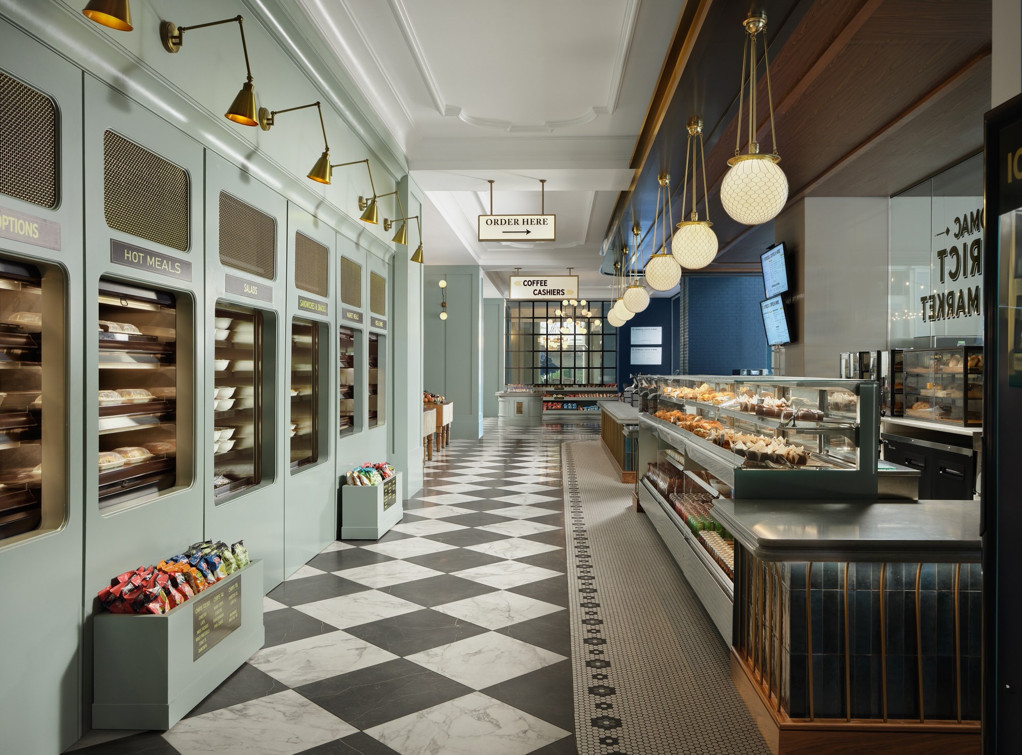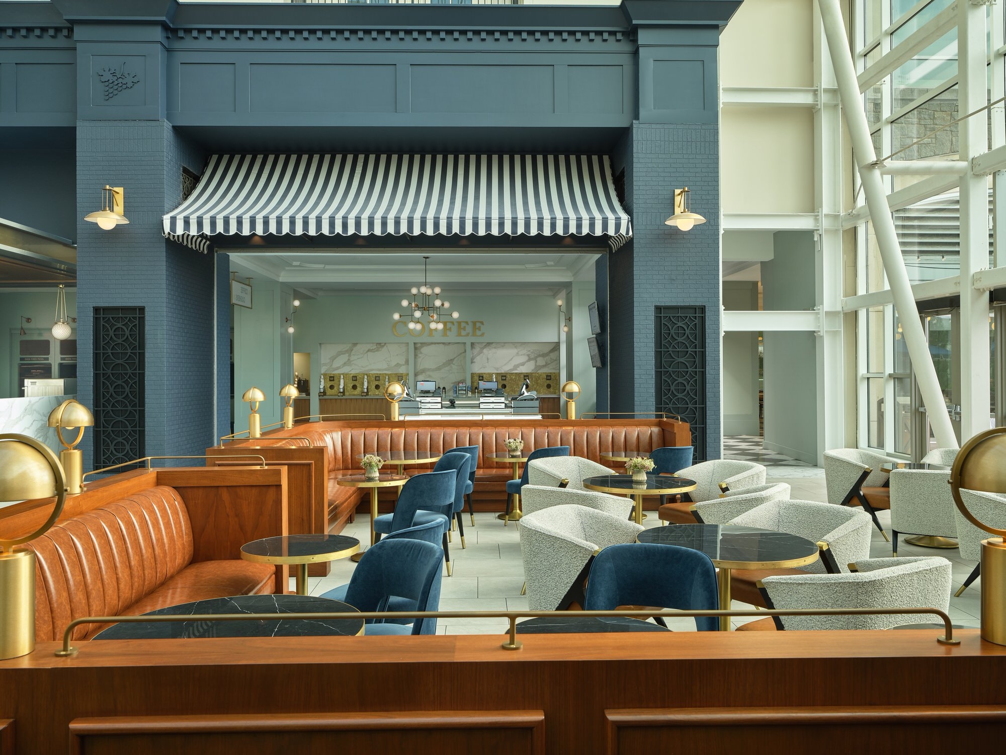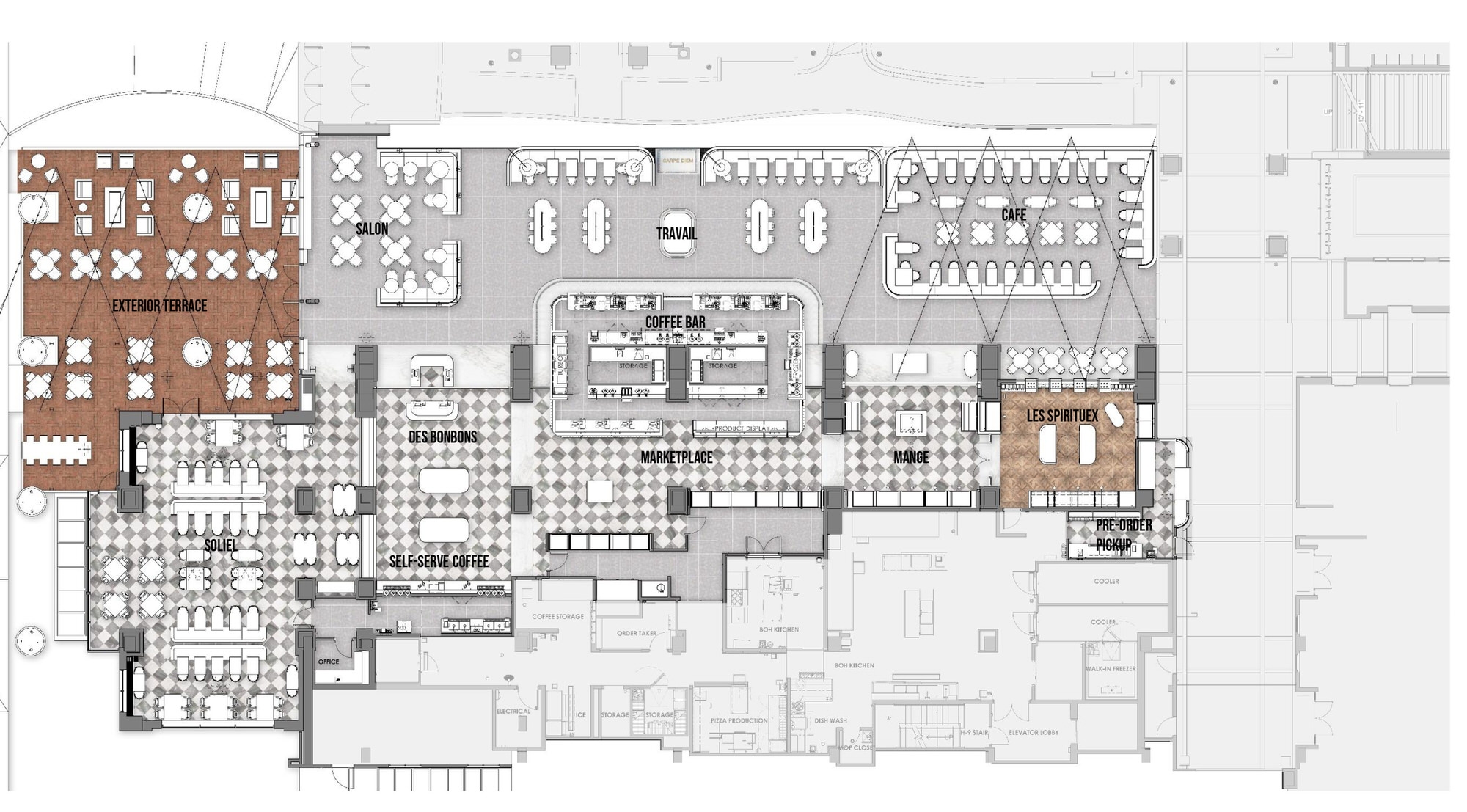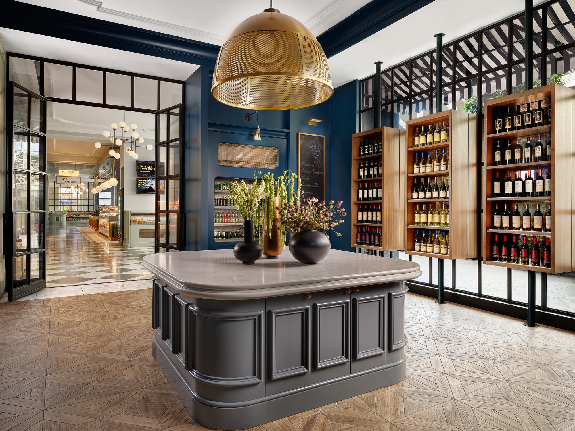 The design inspiration stemmed from the desire to create a space that gave guests the sense of meandering through a French market and having the ability to enjoy the market goods amongst a welcoming atrium seating space. The design transformation is a modern interpretation of a classic French bistro, complete with selectively integrated traditional trim work, beautifully designed stone edge countertop profiles, cool paint tones, custom mosaic tiles, and glass and steel partitions that help break up the space. The custom millwork design was crafted to enclose and hide very industrial looking coolers and food display cases and to create a more tailored look while still allowing easy access for maintenance and operational needs. The addition of overhanging fabric awnings, mimicking French bistro eateries, and intimately placed lighting helps to bring down the scale of the venue, to feel nestled within its context. The project also features a wine and spirits room, an outdoor dining terrace, a sunroom, several ready-to-eat dining options, a self-serve coffee wall as well as an espresso bar that projects into the atrium as the focal point of the experience.