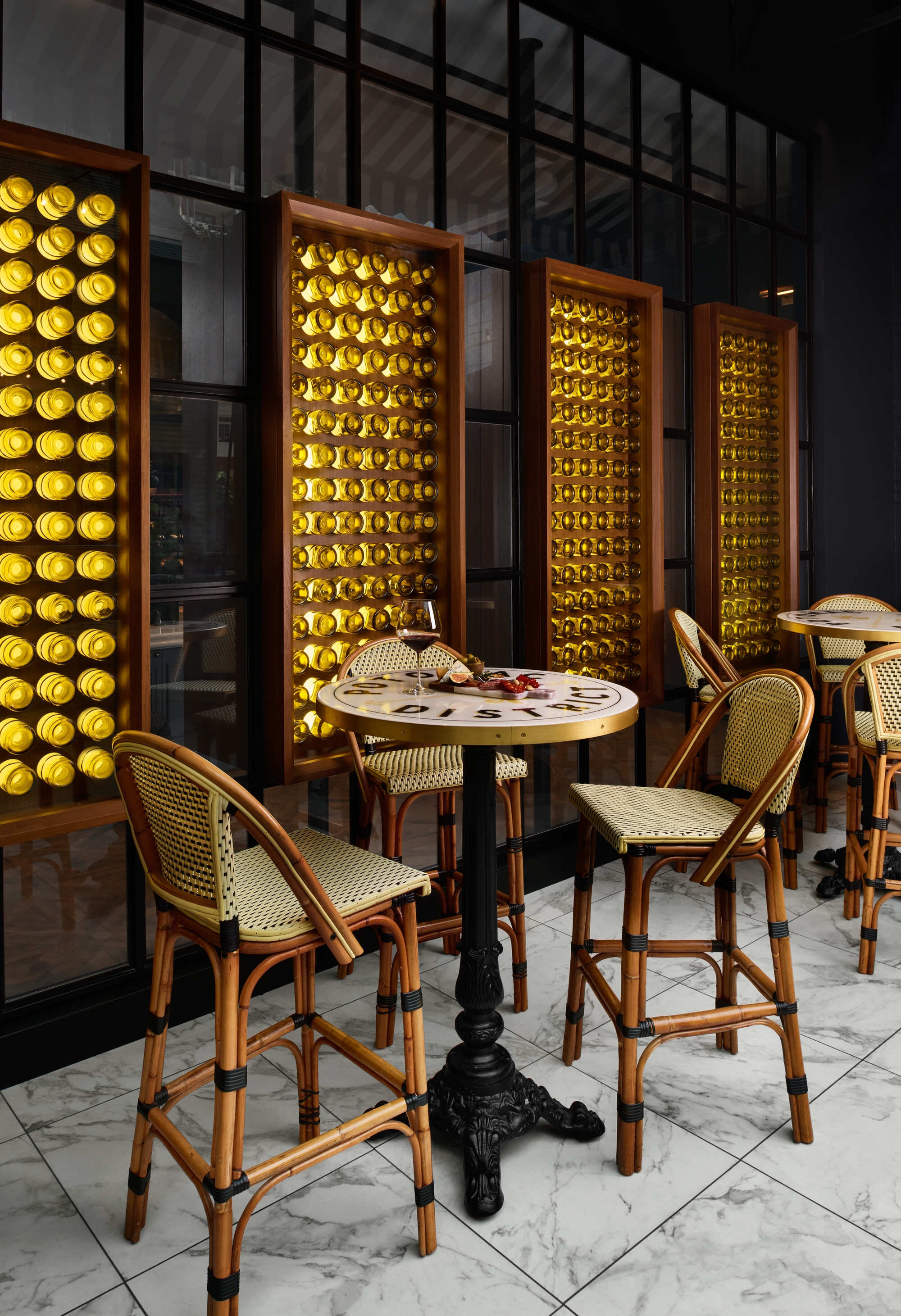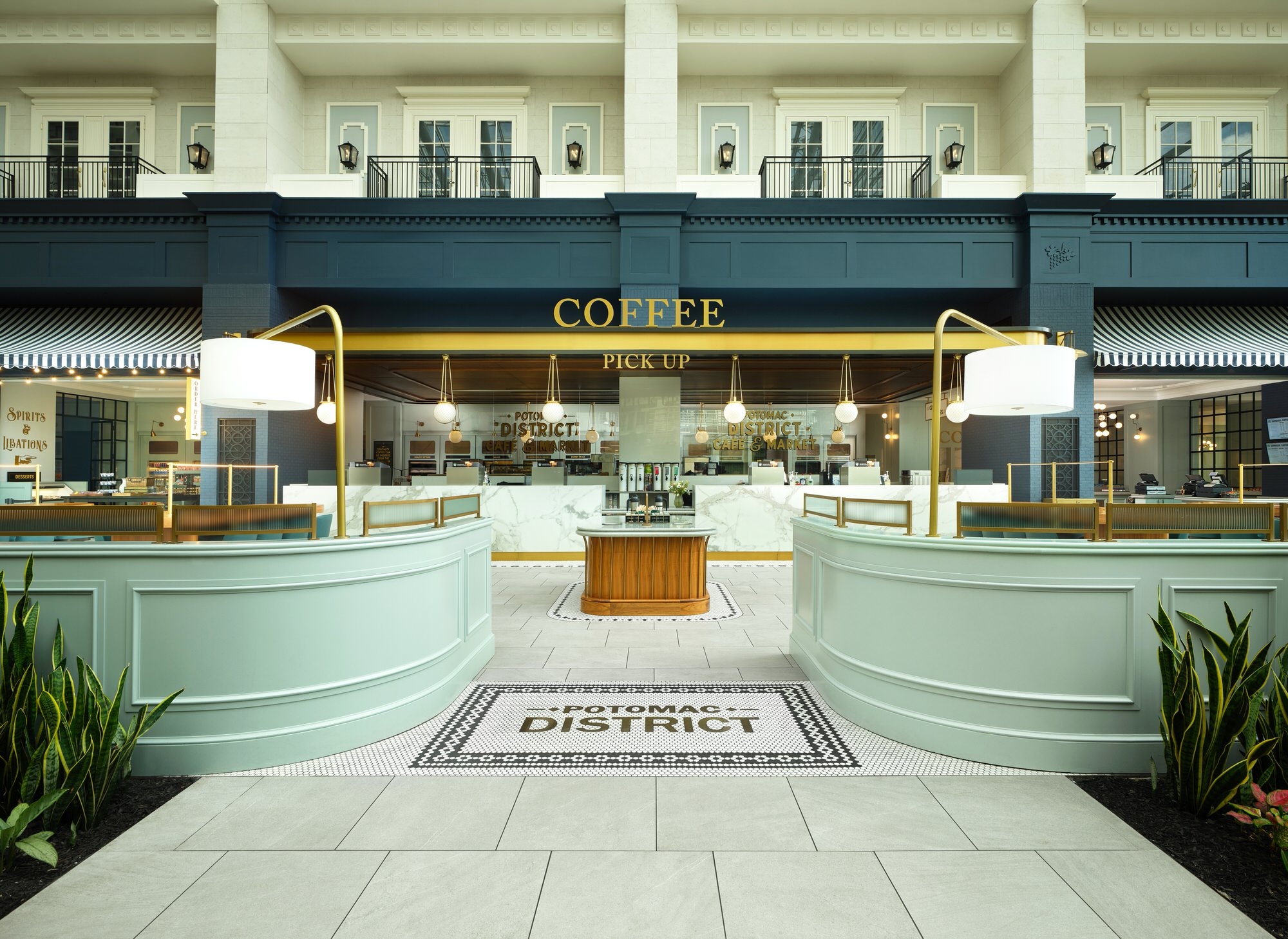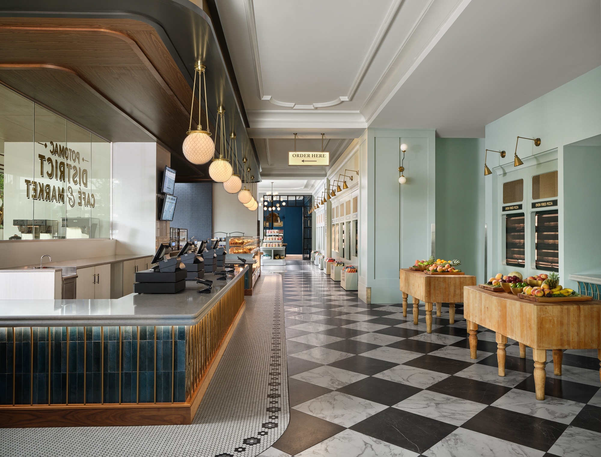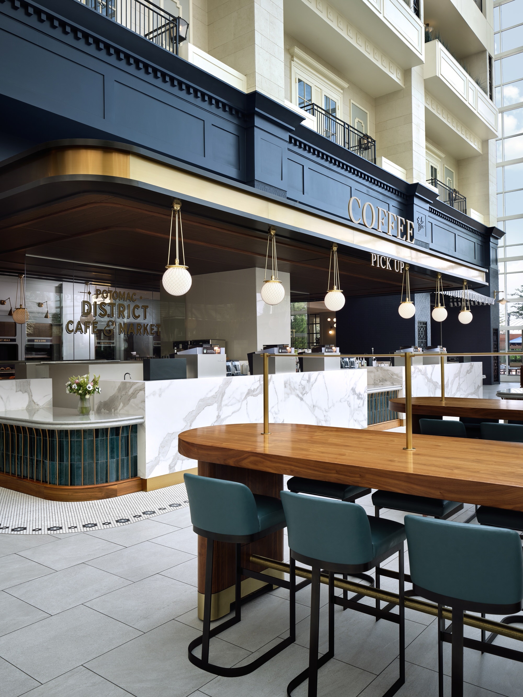 The design inspiration stemmed from the desire to create a space that gave guests the sense of meandering through a French market and having the ability to enjoy the market goods amongst a welcoming atrium seating space. The design transformation is a modern interpretation of a classic French bistro, complete with selectively integrated traditional trim work, beautifully designed stone edge countertop profiles, cool paint tones, custom mosaic tiles, and glass and steel partitions that help break up the space. The custom millwork design was crafted to enclose and hide very industrial looking coolers and food display cases and to create a more tailored look while still allowing easy access for maintenance and operational needs. The addition of overhanging fabric awnings, mimicking French bistro eateries, and intimately placed lighting helps to bring down the scale of the venue, to feel nestled within its context. The project also features a wine and spirits room, an outdoor dining terrace, a sunroom, several ready-to-eat dining options, a self-serve coffee wall as well as an espresso bar that projects into the atrium as the focal point of the experience.