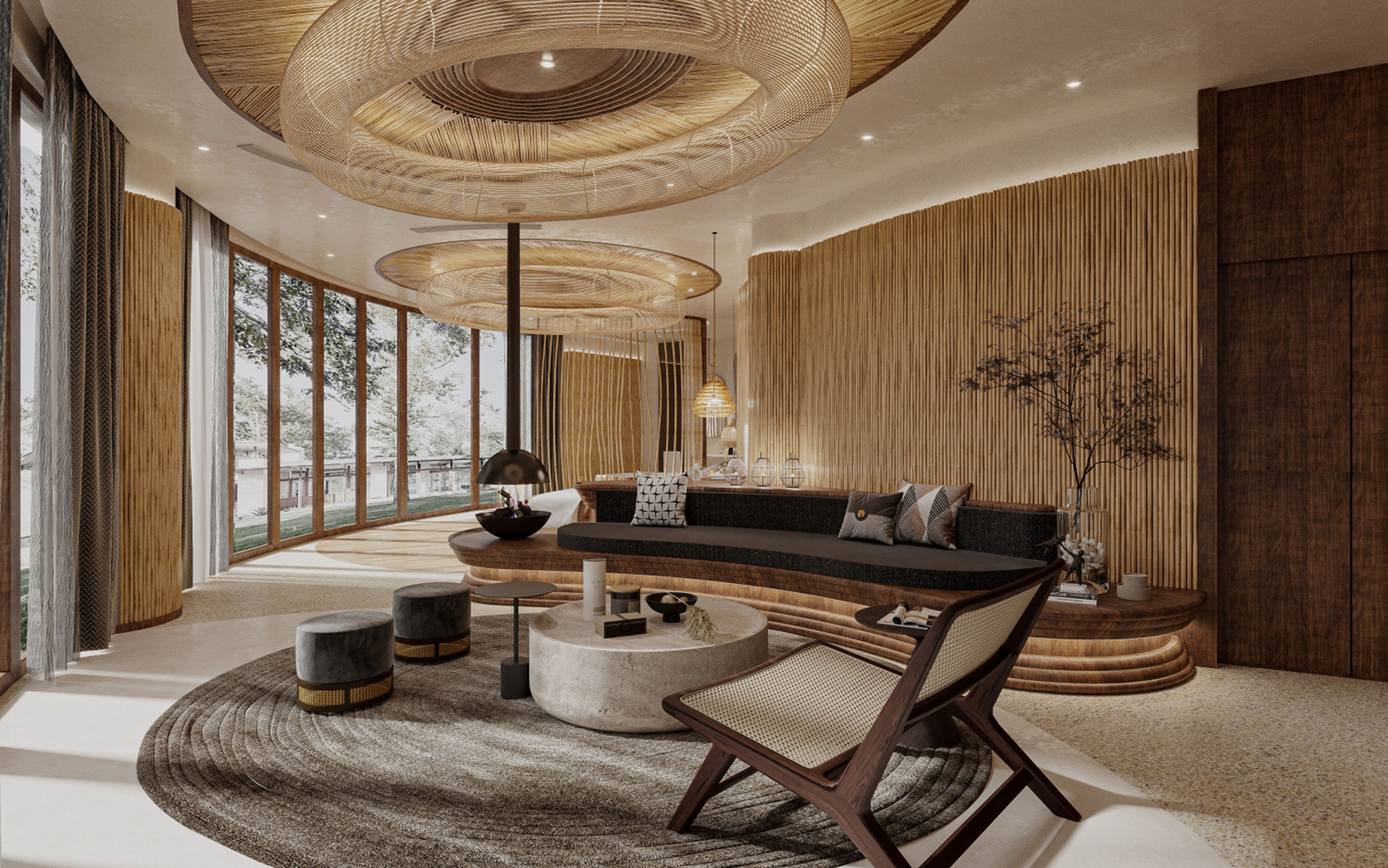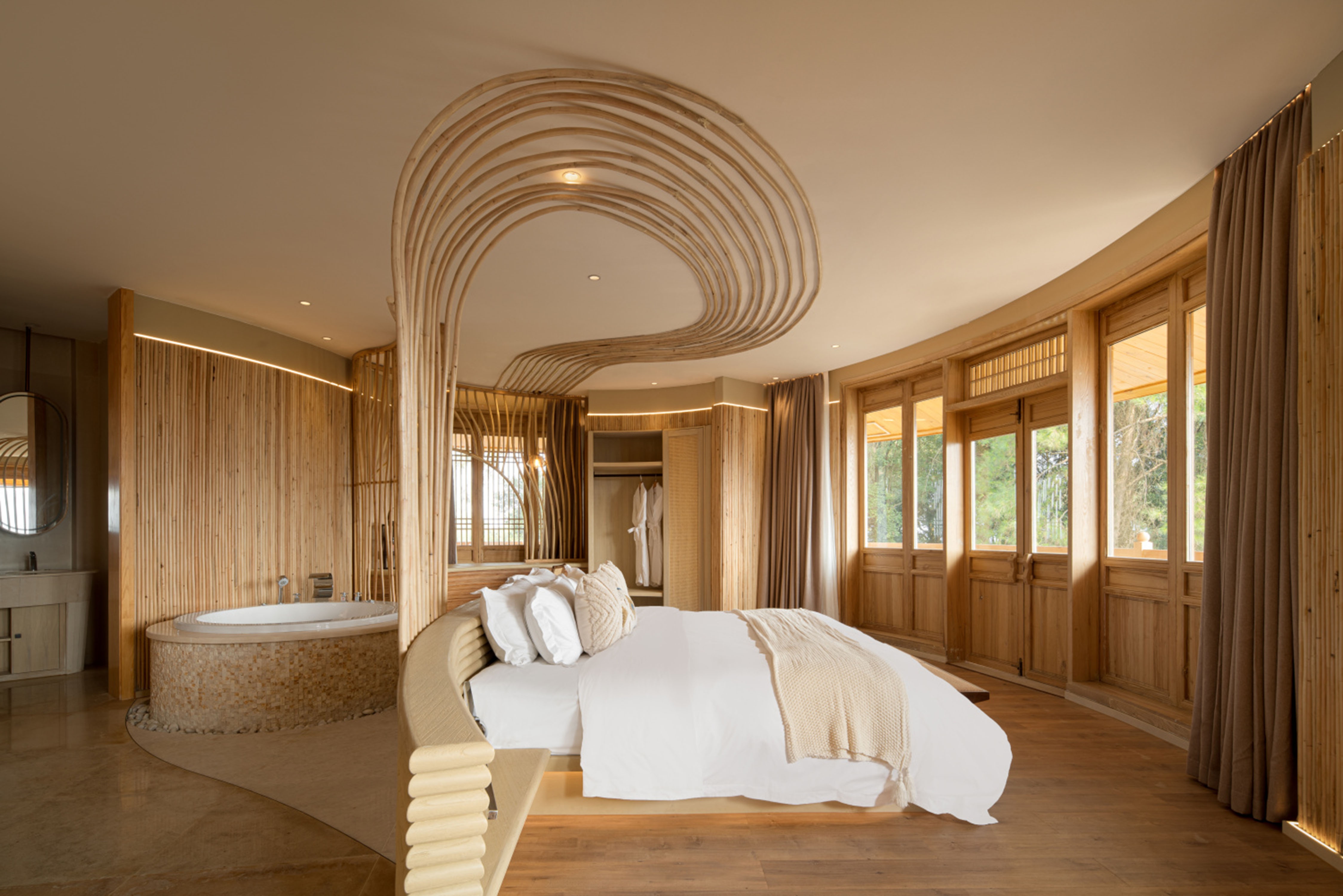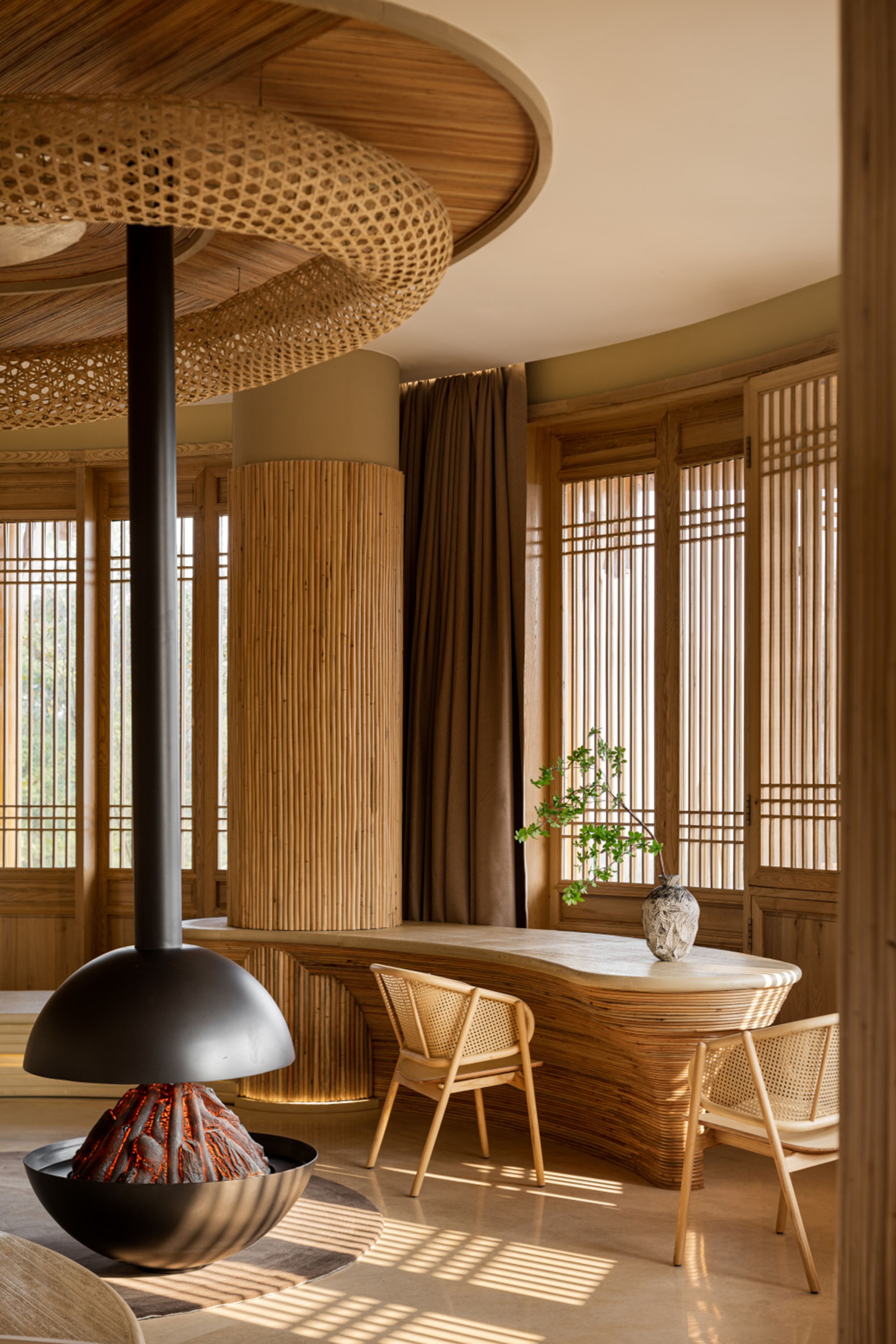 There are only nine rooms in the project, and the building is a non-conventional tai chi-style building. No room has the same building plan, from the narrowest two-meter interface to the widest six-meter interface, which is a large arc of irregular space, this rare building mass is also the difficulty of this design. We are looking for a way to build on the mountain, to live on the spot, to follow the trend, to be born naturally, just like Tai Chi, “To stop with stillness, to stop with softness. “Everything in the space is designed using the non-heritage of farming culture as the design carrier, using cattail grass as the design inspiration, and creating it on site with local artists. It is not only a hotel, but also a cultural heritage.
