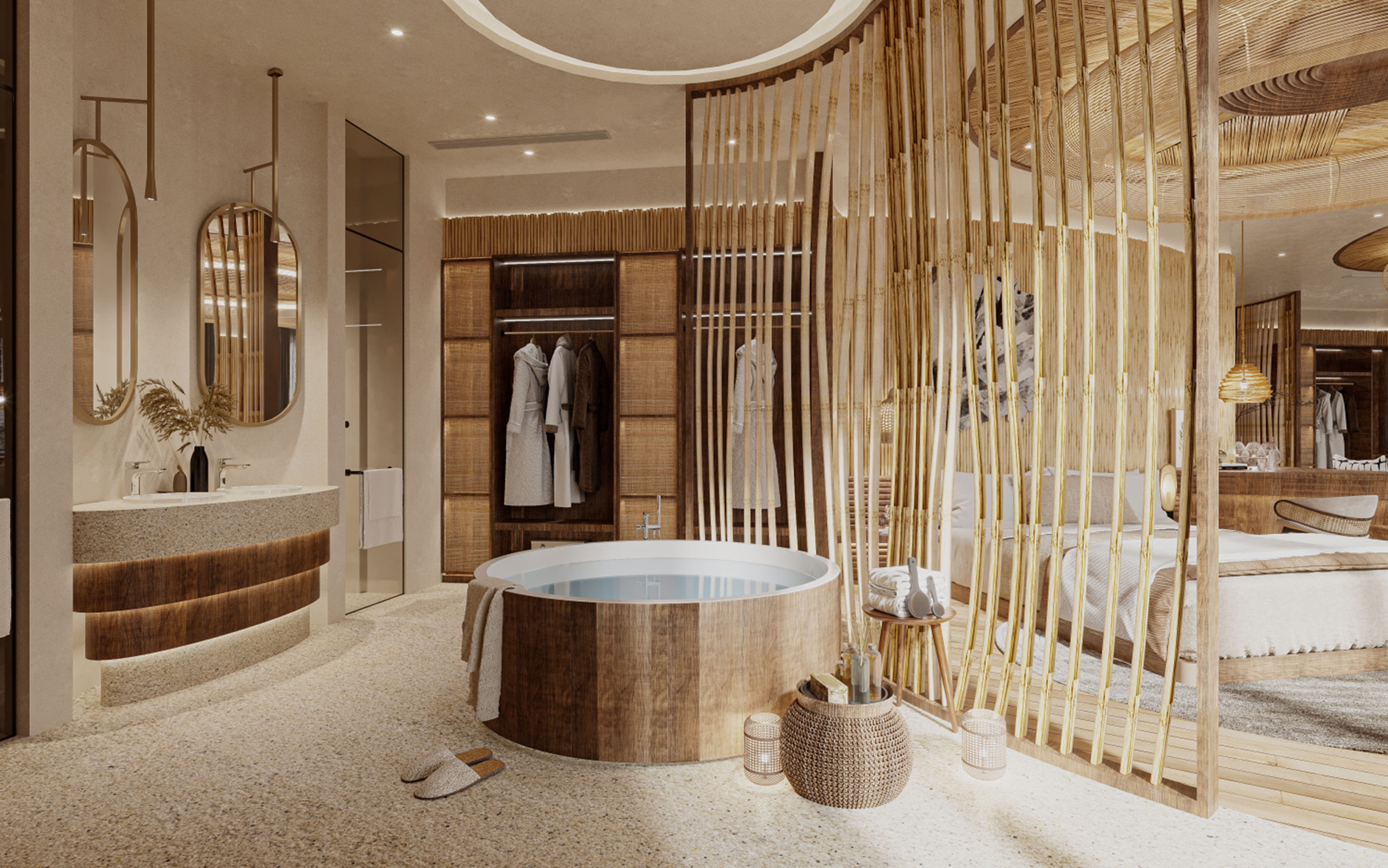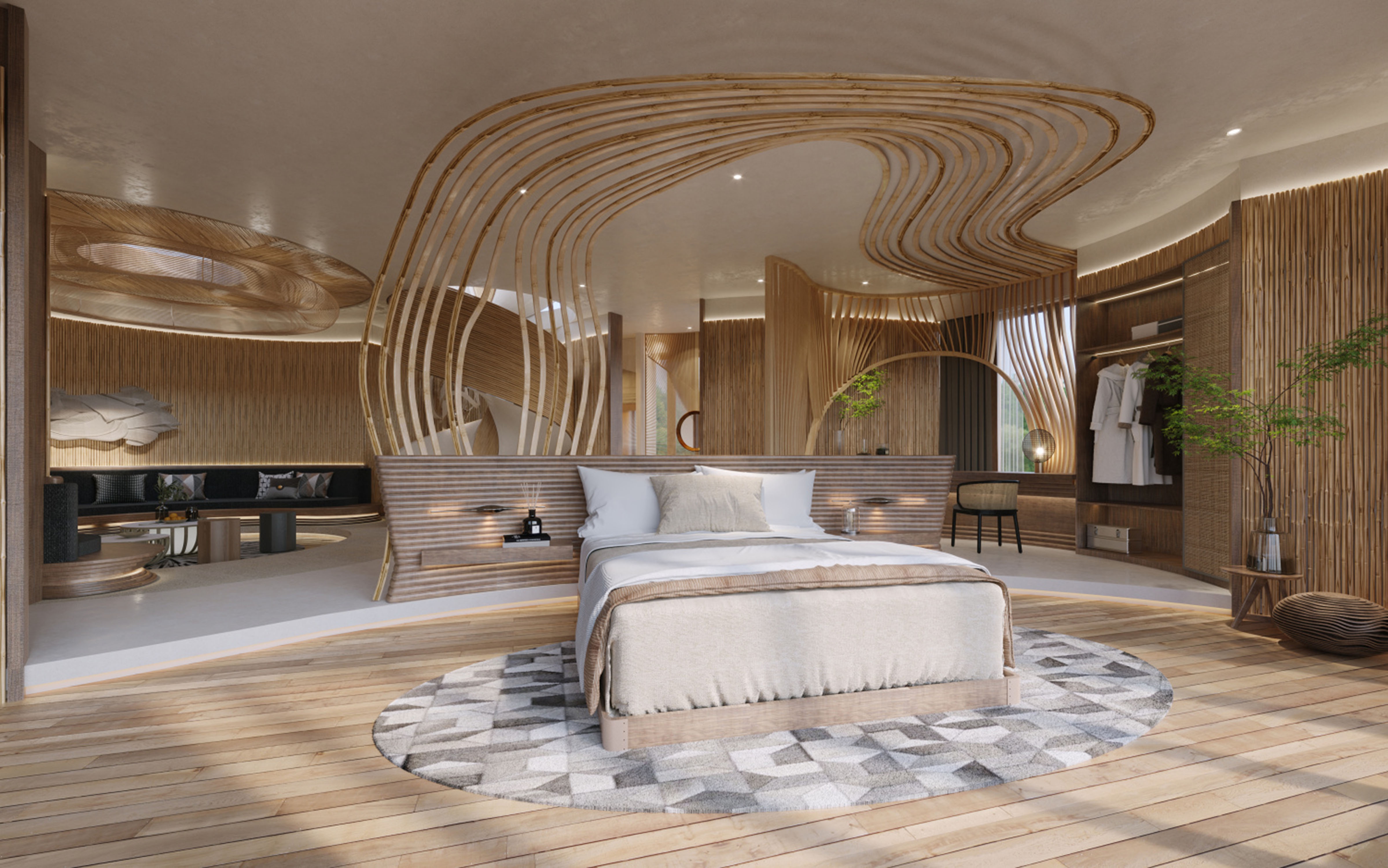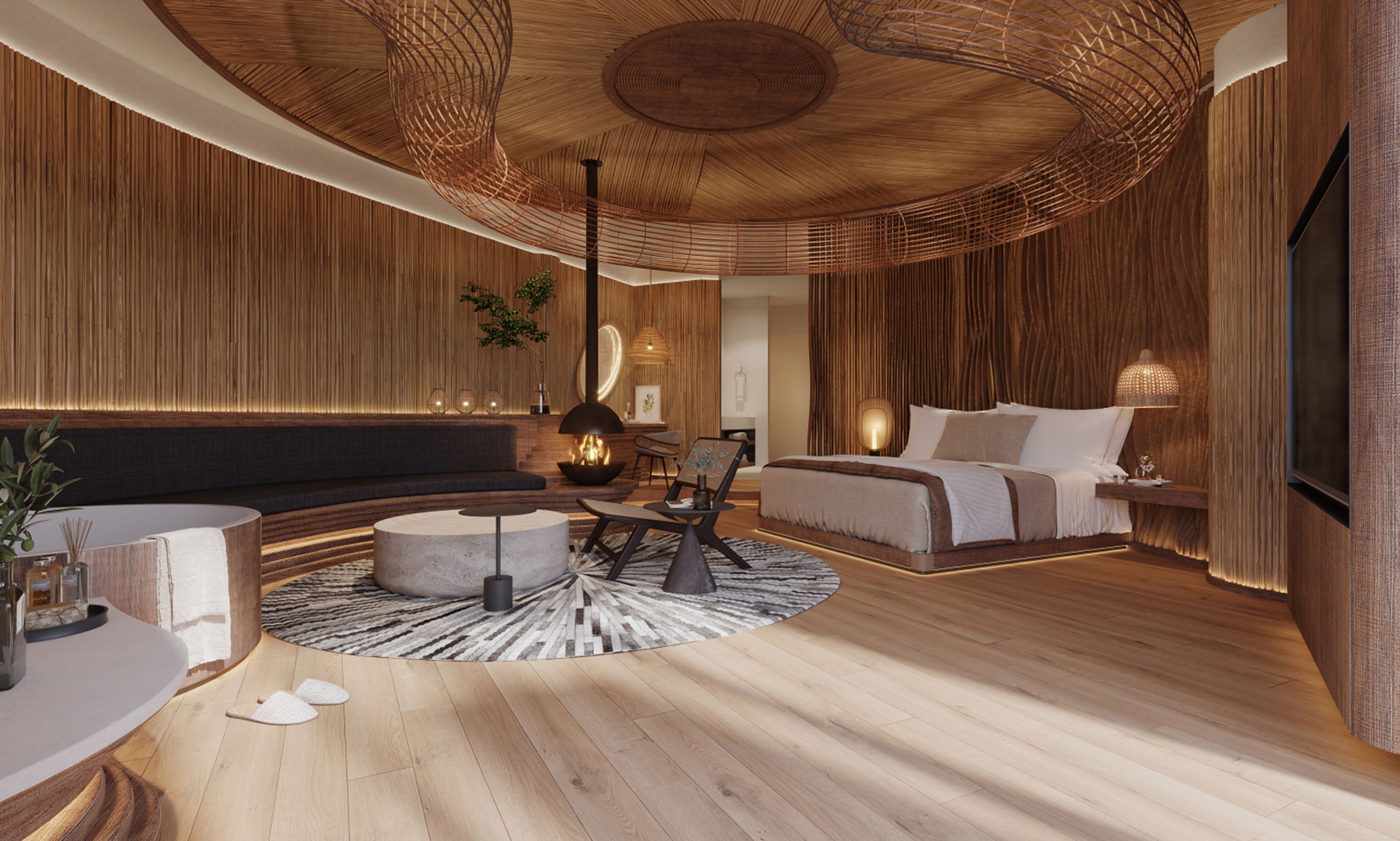 There are only nine rooms in the project, and the building is a non-conventional tai chi-style building. No room has the same building plan, from the narrowest two-meter interface to the widest six-meter interface, which is a large arc of irregular space, this rare building mass is also the difficulty of this design. We are looking for a way to build on the mountain, to live on the spot, to follow the trend, to be born naturally, just like Tai Chi, “To stop with stillness, to stop with softness. “Everything in the space is designed using the non-heritage of farming culture as the design carrier, using cattail grass as the design inspiration, and creating it on site with local artists. It is not only a hotel, but also a cultural heritage.