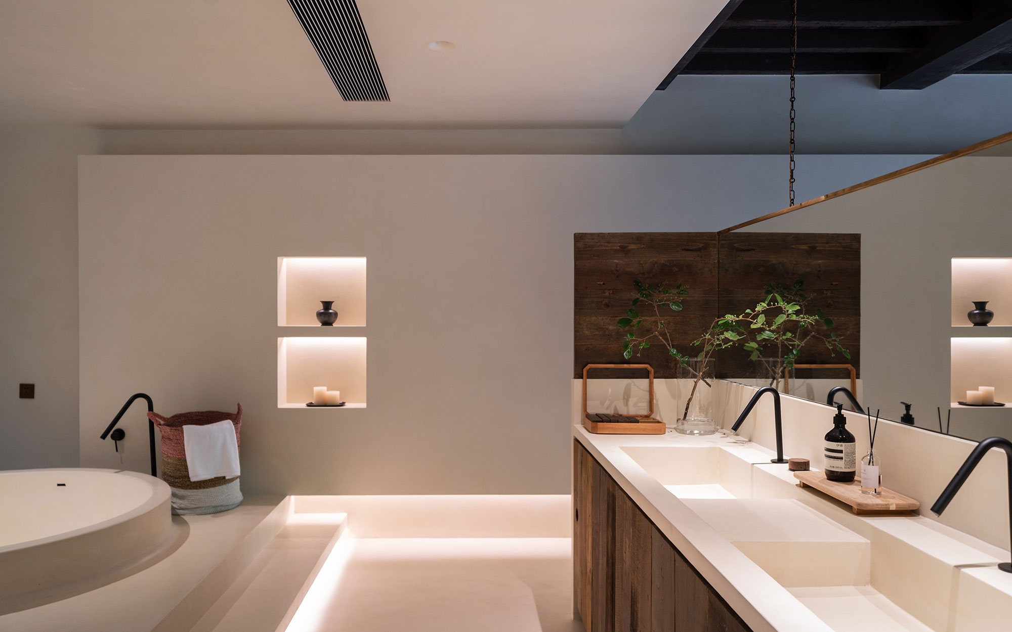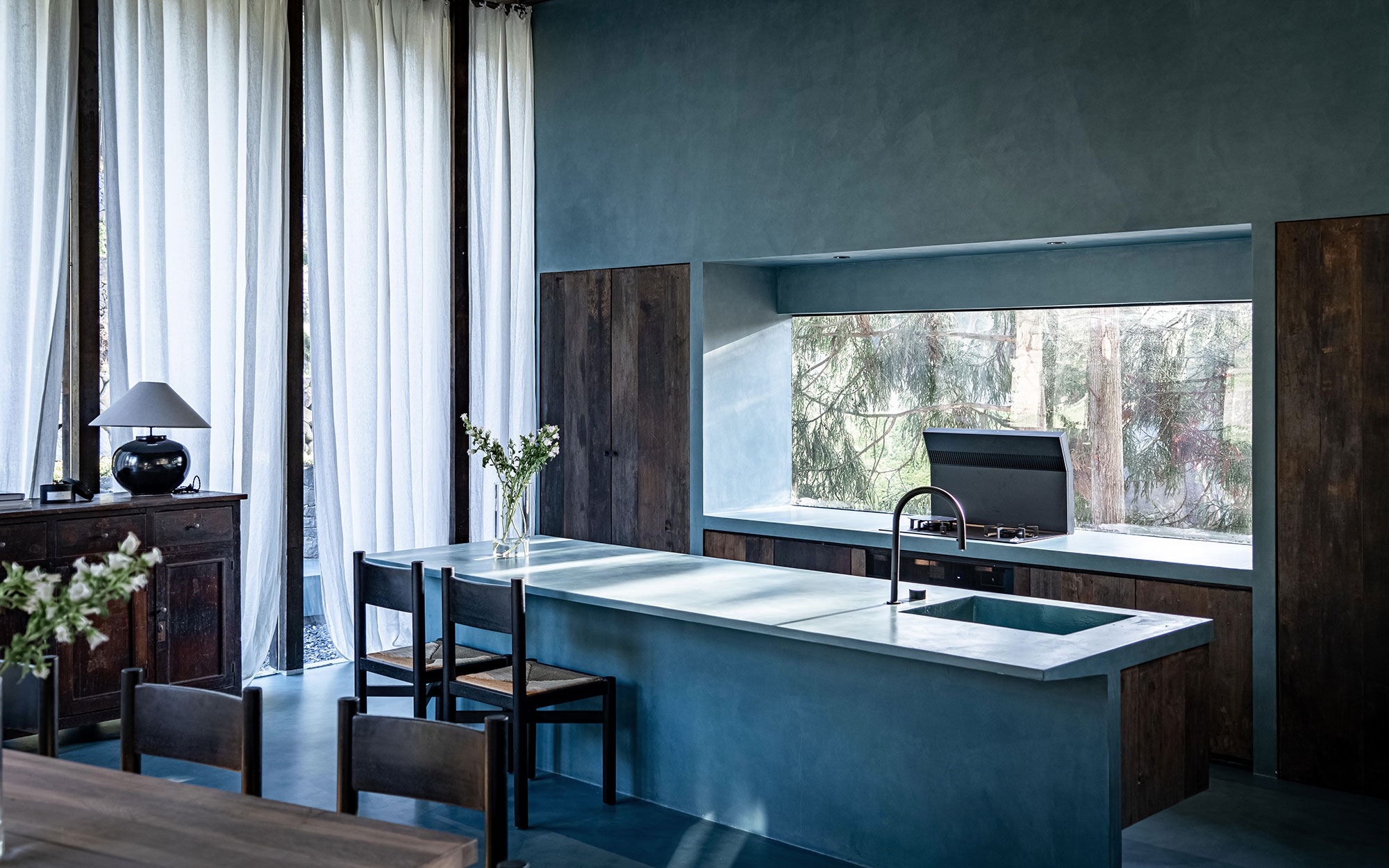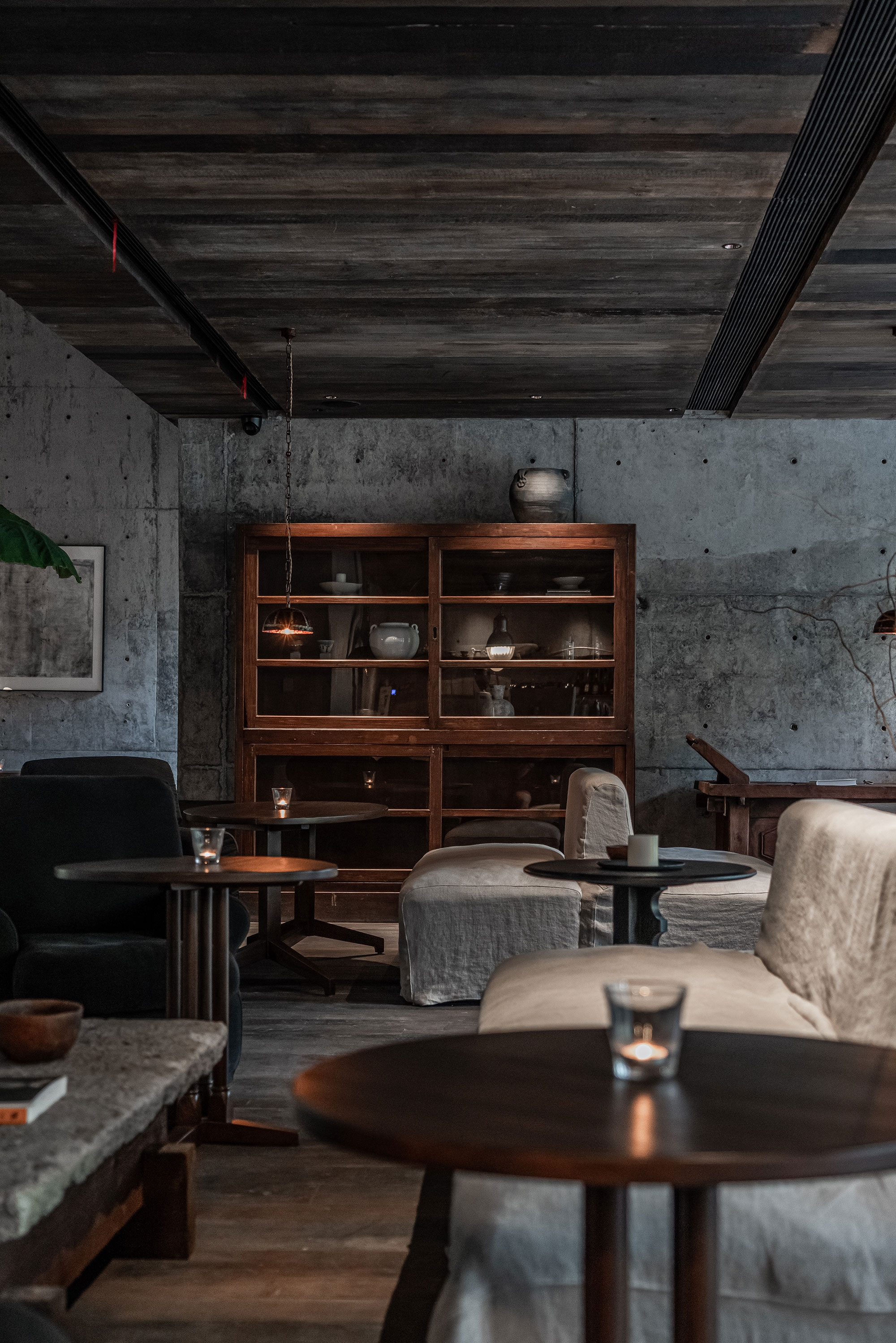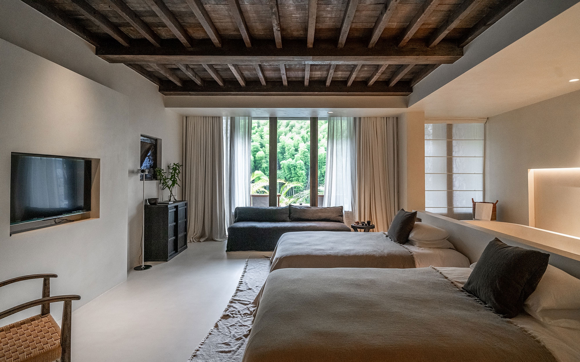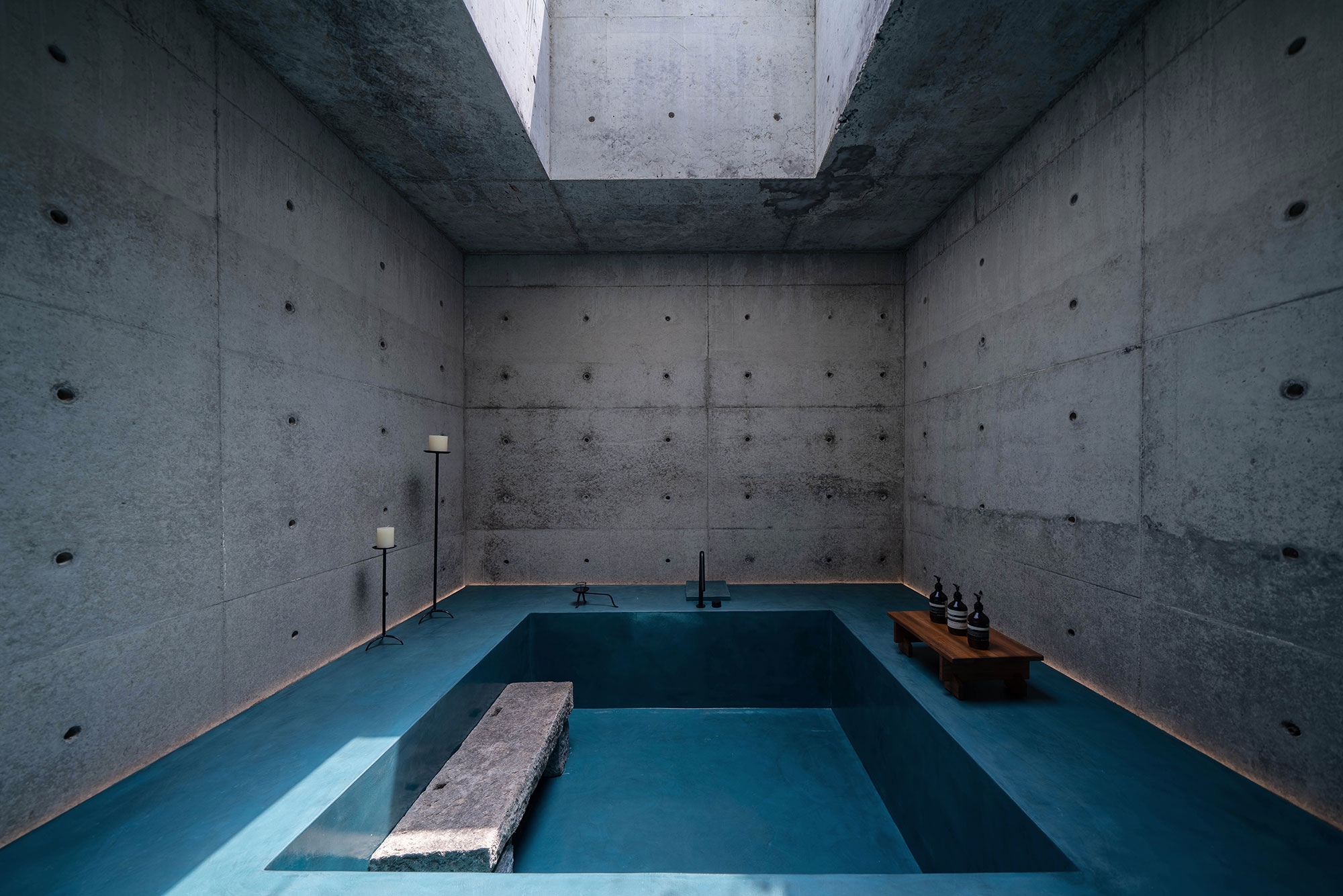 As the project site had a slope with a difference in elevation of 9 meters, the design team decided to construct the building accordingly as a terrace-type house layer by layer. The lower two levels house the infinity pool and cafe, where the interior walls retain the fair-faced concrete of the existing structure and are paired with medieval furniture, giving the entire space a rustic and relaxing ambiance. The top level of the building accommodates the hotel rooms that are covered by micro-cement.