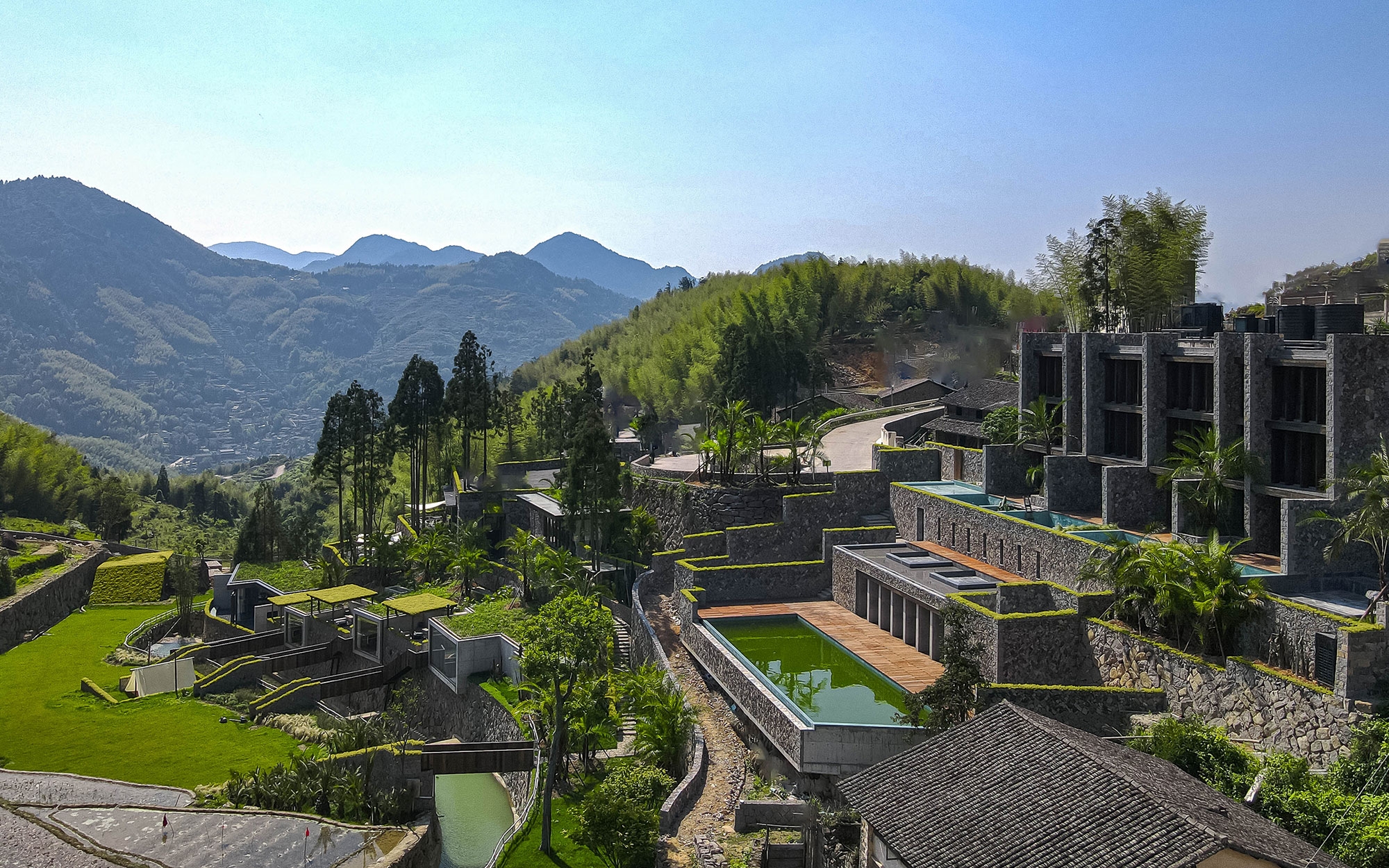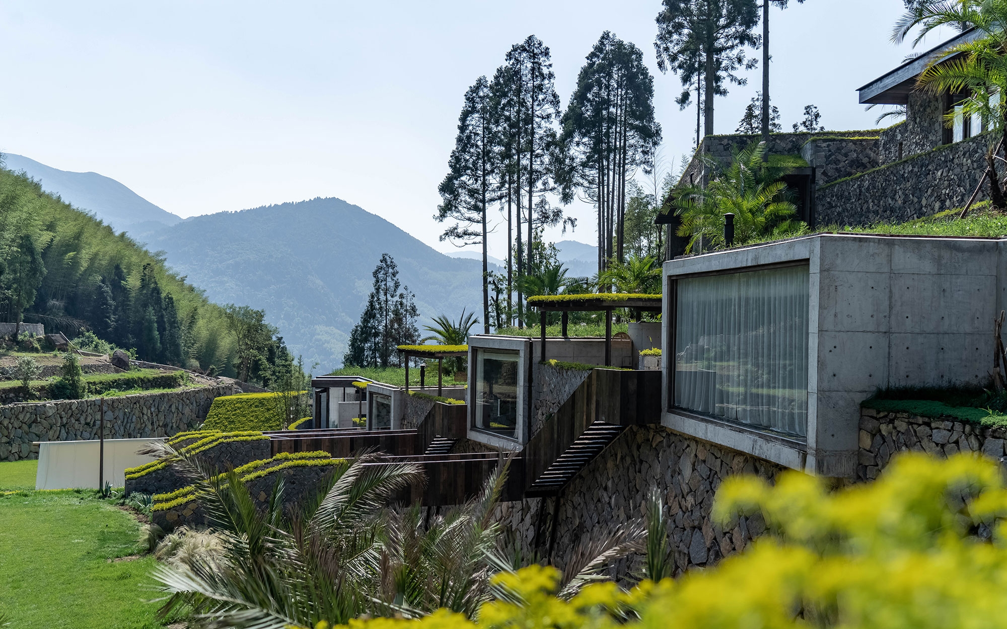 The project is situated in a mountain village in Zeya, Wenzhou, China. The houses in the village are made of stone, which has stood the test of time and weathered hundreds of years of wind and rain. The project site features a long and narrow slope, with a bamboo forest in front, a natural stream between the sloping land and the bamboo forest, and a rice field on the edge of the stream. The design brief is to create a high-quality house that would last for generations. The design team applied local stone materials on the exterior walls and retaining walls of the main building to maintain an authentic local building and to preserve the rustic architectural style.