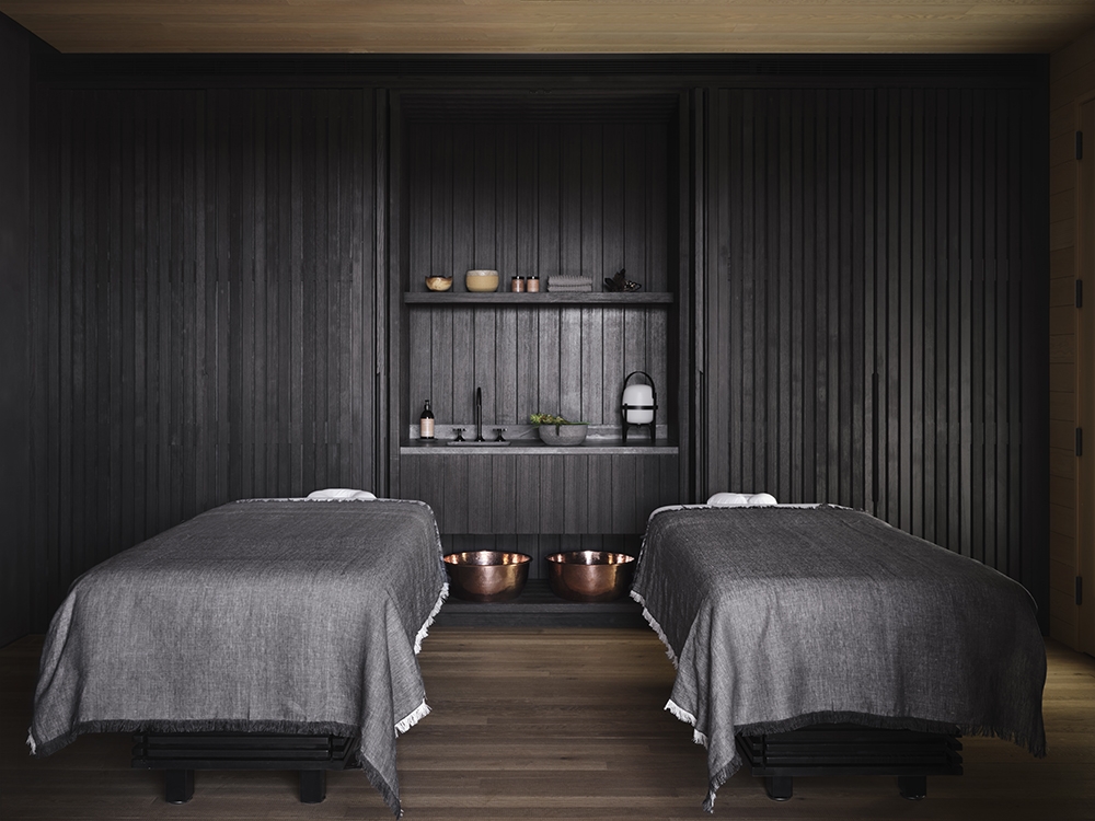 Nestled above the lava flow, the Asaya Spa at Kona Village boasts breathtaking views of Hualalai and Mauna Kea. Inspired by the lava landscape, the spa features rich palettes and textures. Crafted Asaya Atelier counters offer unique treatments, while intricately carved millwork adds to the ambiance. A raised boardwalk connects indoor and outdoor spaces, adorned with a bronze sculpture by John Koga. Moody basalt showers and cedar saunas await in the locker rooms, complemented by relaxation gardens featuring water circuits. Starry light patterns from copper lanterns guide guests to treatment rooms, designed to align with the lava flow and offer serene views of the volcanoes. The Asaya suite pavilion provides a sanctuary inspired by Hawaiian healing traditions. The indoor-outdoor Fitness Center maximizes views and offers personalized workout programs. Sustainability is paramount, with the spa powered by solar energy and achieving LEED Gold certification.