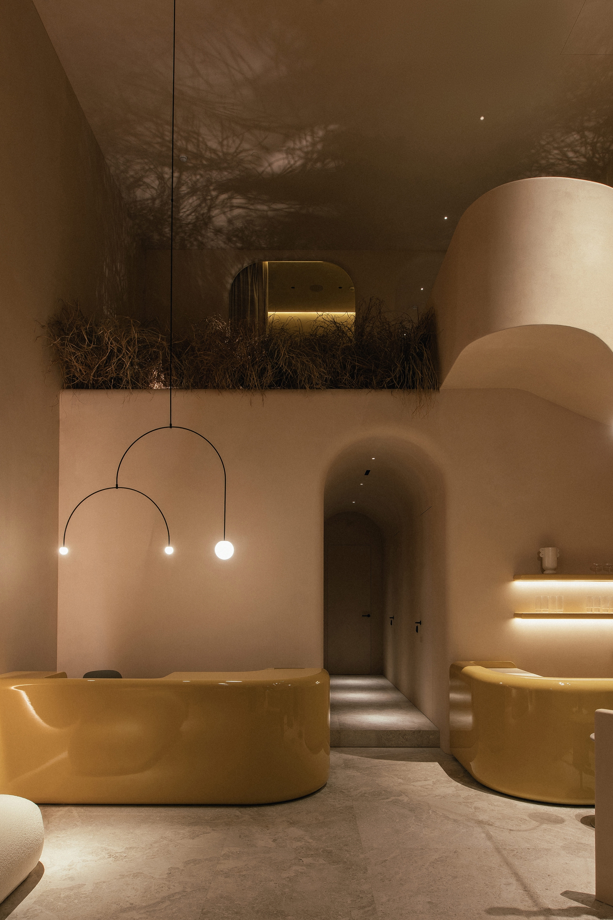 The deepest meaning of the project is inspiration and adoration of nature’s beauty, lines, shapes, and tints it has. On the second level of the atrium, there is naturally dried and “planted” fresh grass. This added an incredible fresh herby fragrance of a green field to the space. The oasis benefits the guests' relaxation and creates a spectacular background for the oxygen capsule.