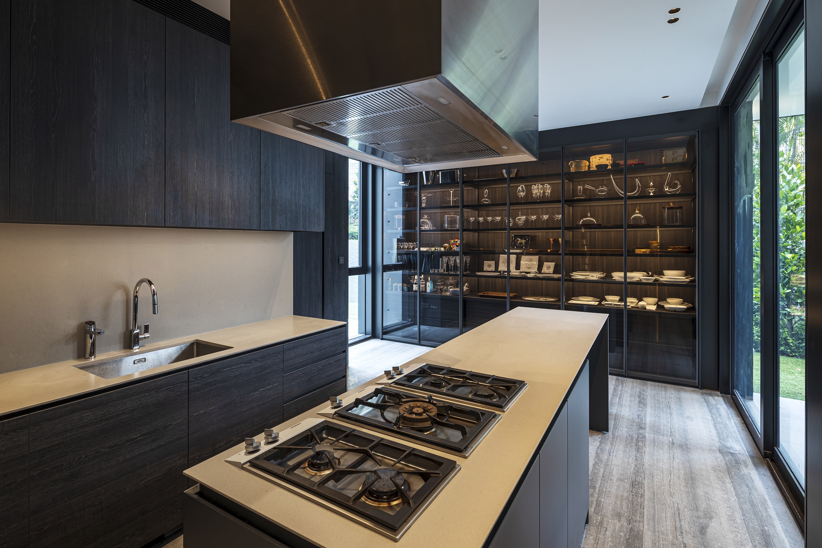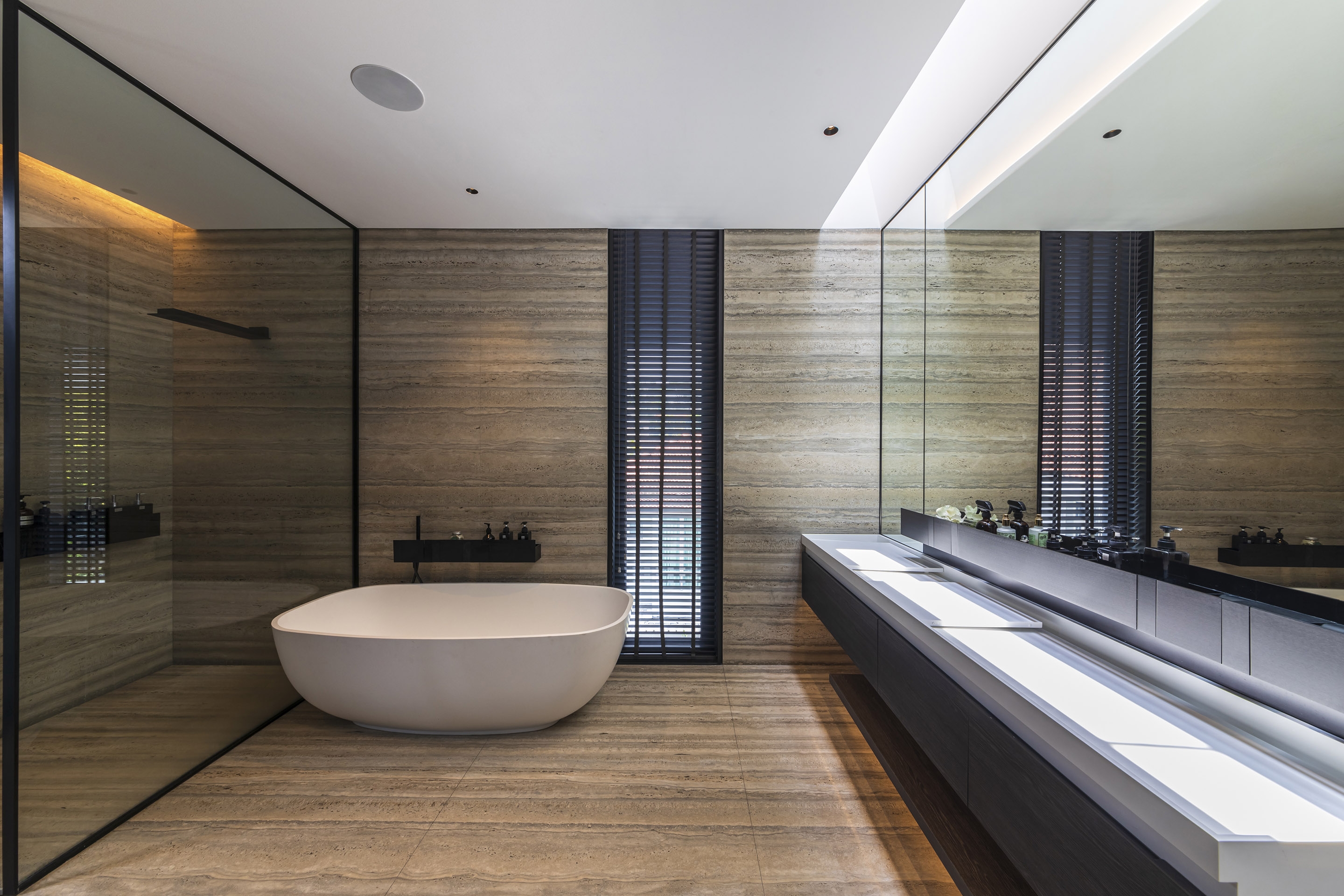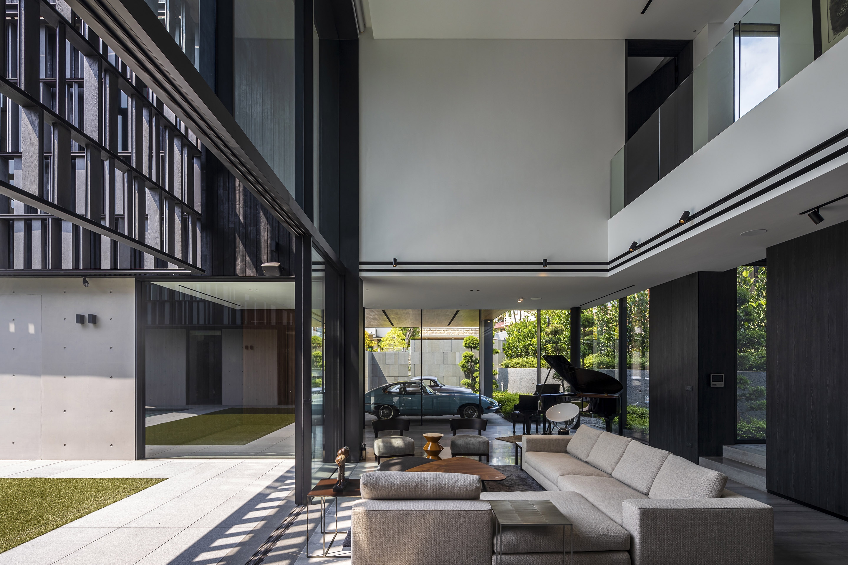 The house we designed uses the 'open' courtyard (3-sided) to reorientate the house to the west. It is both a response to the site terrain which is higher on the eastern & southern sides & lower at the western end, & a functional organisation. The exterior is made of primarily 3 materials: Wire brushed blacken teak, fair-faced concrete & Dark grey granite on the boundary wall. The house, due to the orientation, needs to shield the western sun in the evening. The idea of a dynamic screen in order not to block the view to the sky completely & yet create an irregular pattern when the shadow is cast in the house caught the imagination of the client & we proceeded to design the inner courtyard look that differs from the outer skin. The screen details also hide the steel bracing that holds the screen lattice together. To emphasise our minimalist design approach, the subtle texture of the wire-brushed wood is deliberately contrasted with a neutral fair-faced concrete material with the tie-holes purposefully planned to give it an engineered precision.