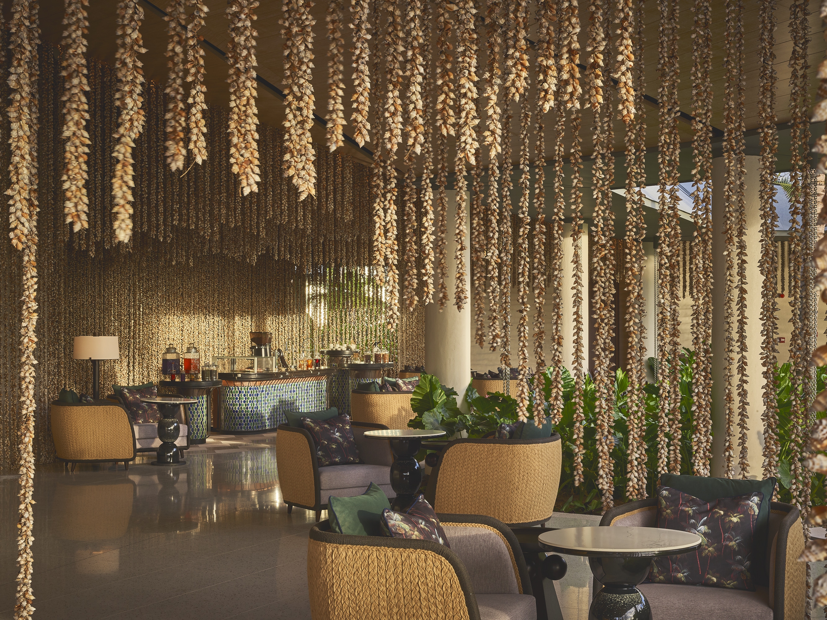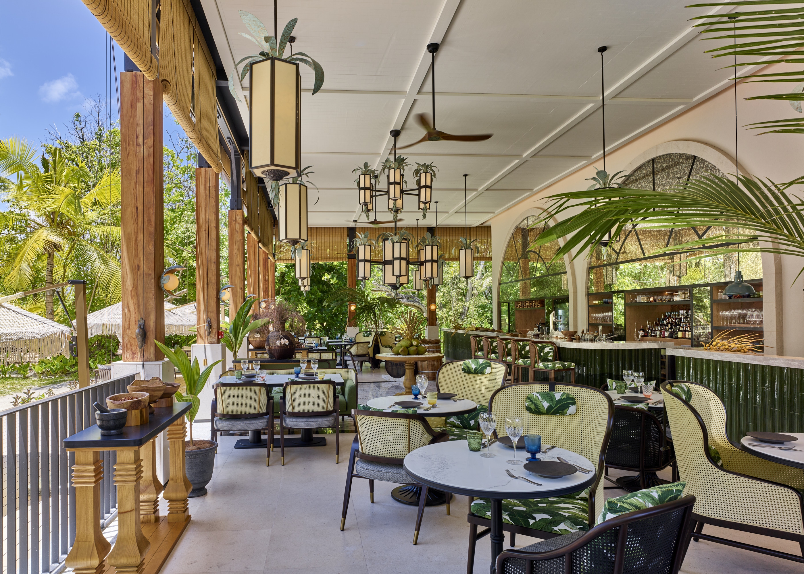 Inspired by the island's vibrant flora and fauna, the resort's architecture and interiors embody a meticulous fusion of opulence and environmental mindfulness. The main buildings echo the beautiful colored and patterned tortoiseshell of the native Hawksbill turtles, forming faceted shapes that create light and airy canopies throughout the arrival building and villas. Sensitively positioned away from the shoreline, the villas boast expansive gardens that provide a serene haven for nesting sea turtles.