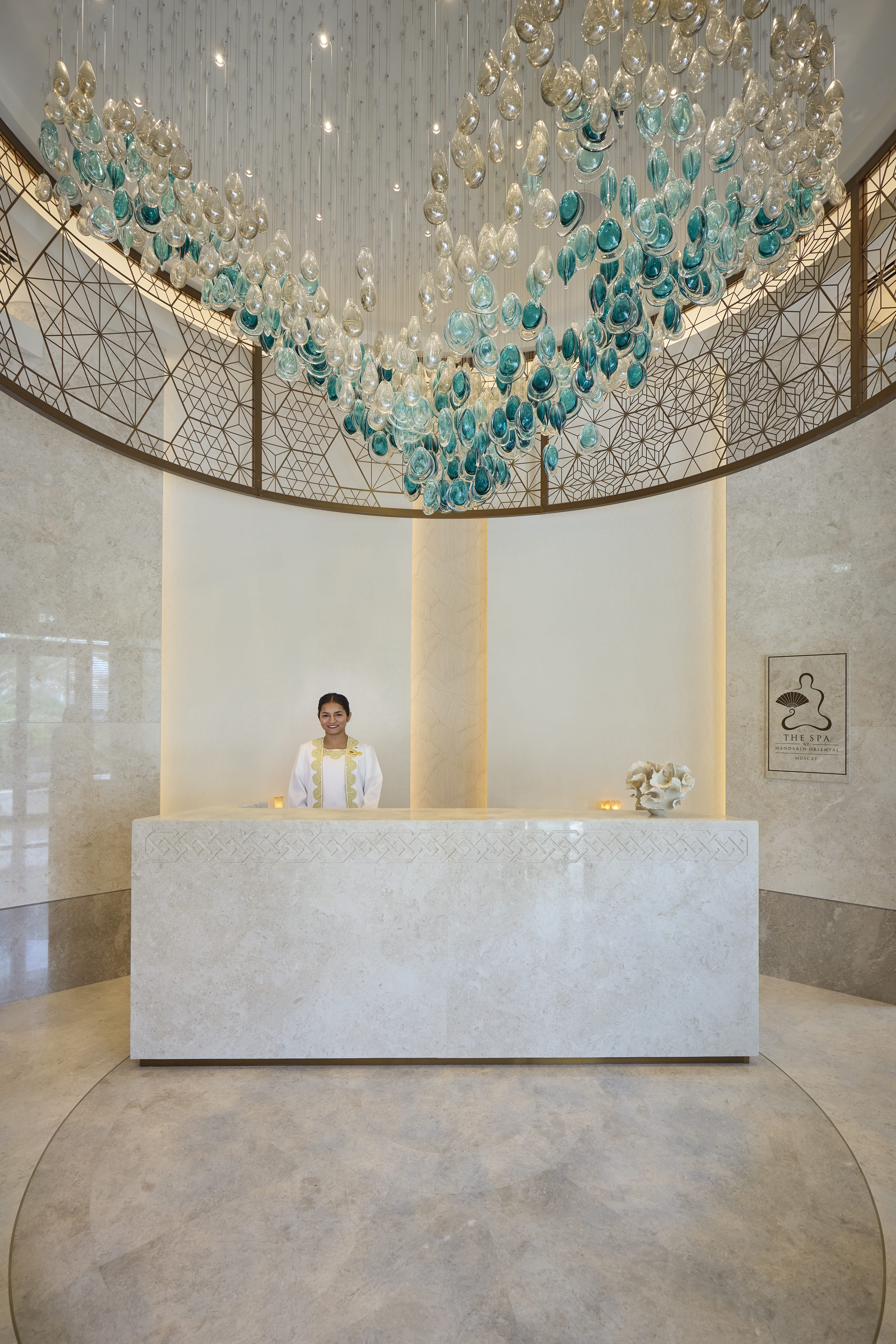 The Mandarin Oriental in Muscat, Oman, sets a new standard for luxury hospitality. The interior design blends modern elegance with Oman's rich cultural heritage, creating a sophisticated yet inviting atmosphere. Guests are welcomed through grand Omani wooden doors into a lobby where tradition meets artistry. Three central fountains pay homage to the influences of the Middle East, Africa, and Asia, while a colored crystal chandelier illuminates the space.
