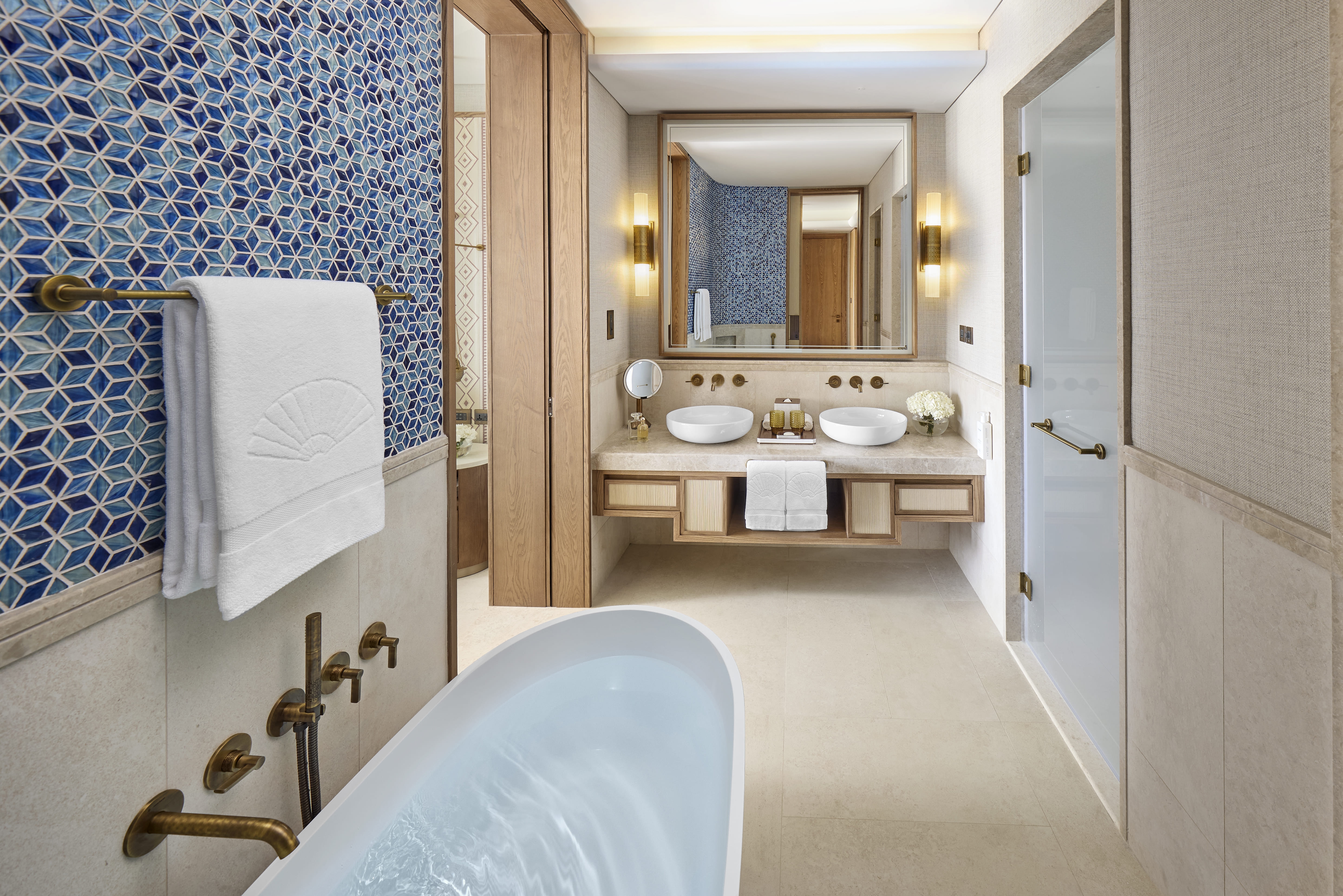 The 103 rooms and 47 suites are designed using local materials like Desert Rose marble and ash wood, with handmade objects celebrating Omani craftsmanship. From headboards inspired by the traditional kuma to brass lanterns reflecting the iconic kandjar, every detail honors local culture. This project combines Omani hospitality with contemporary luxury, offering an immersive experience of the country's beauty and heritage