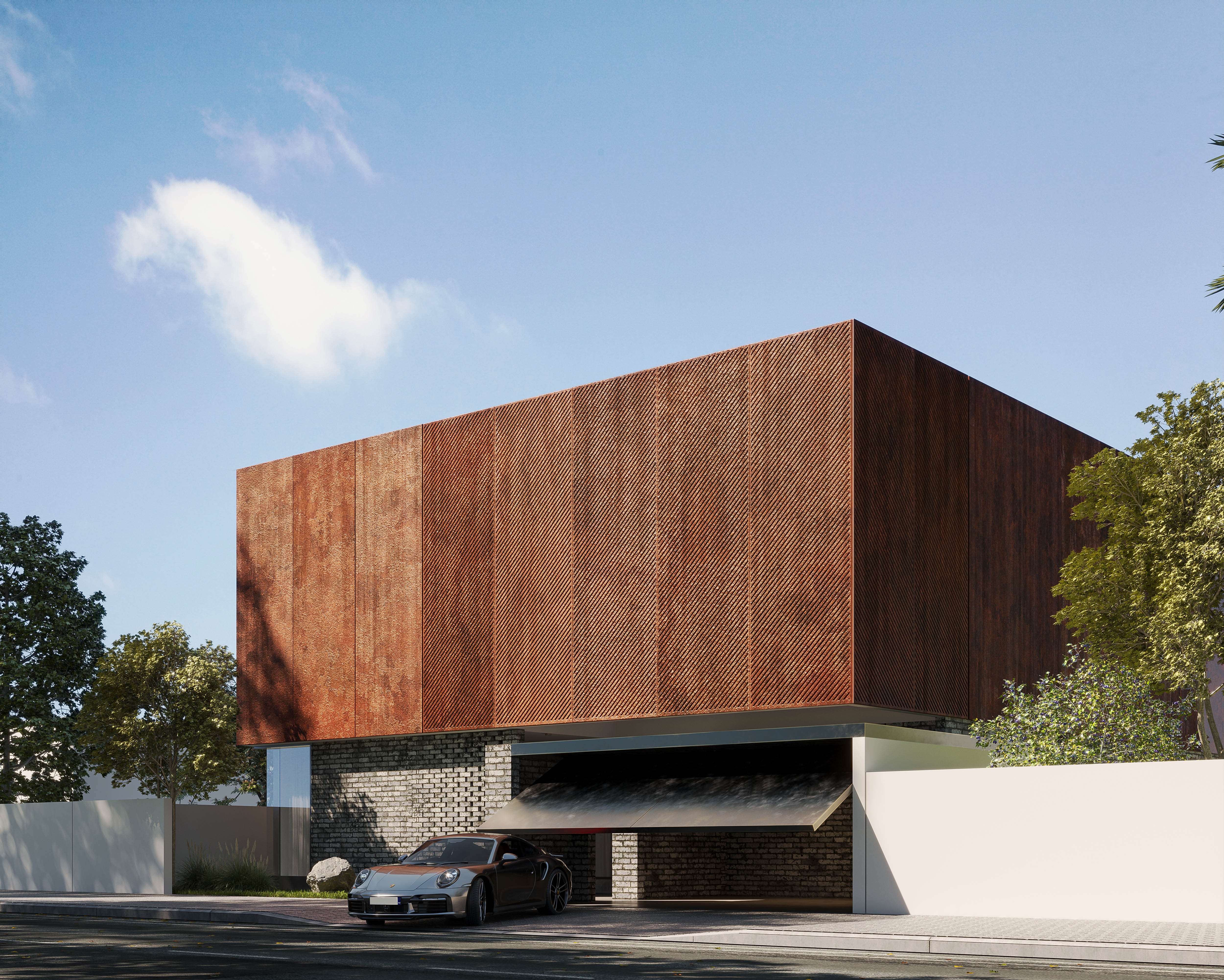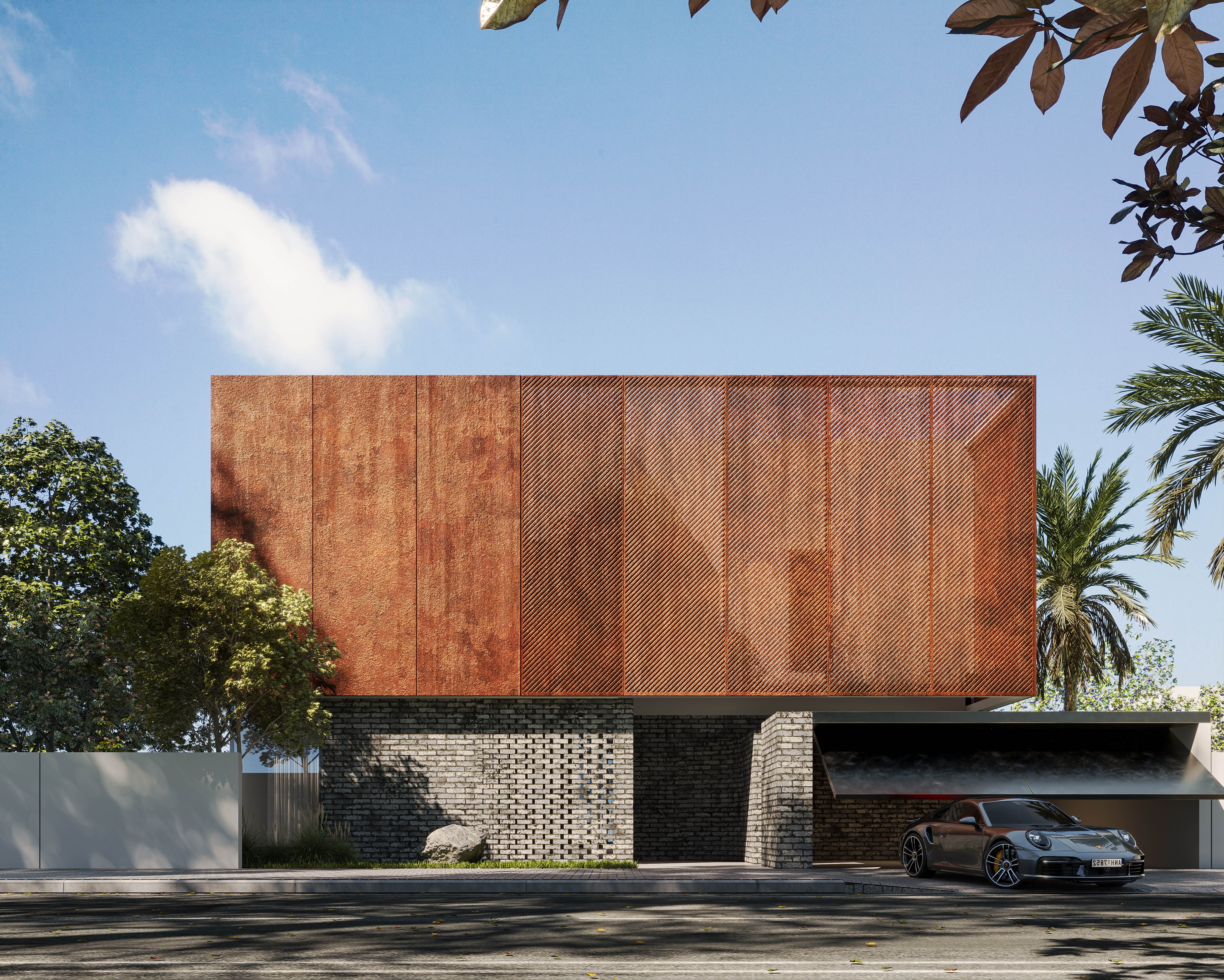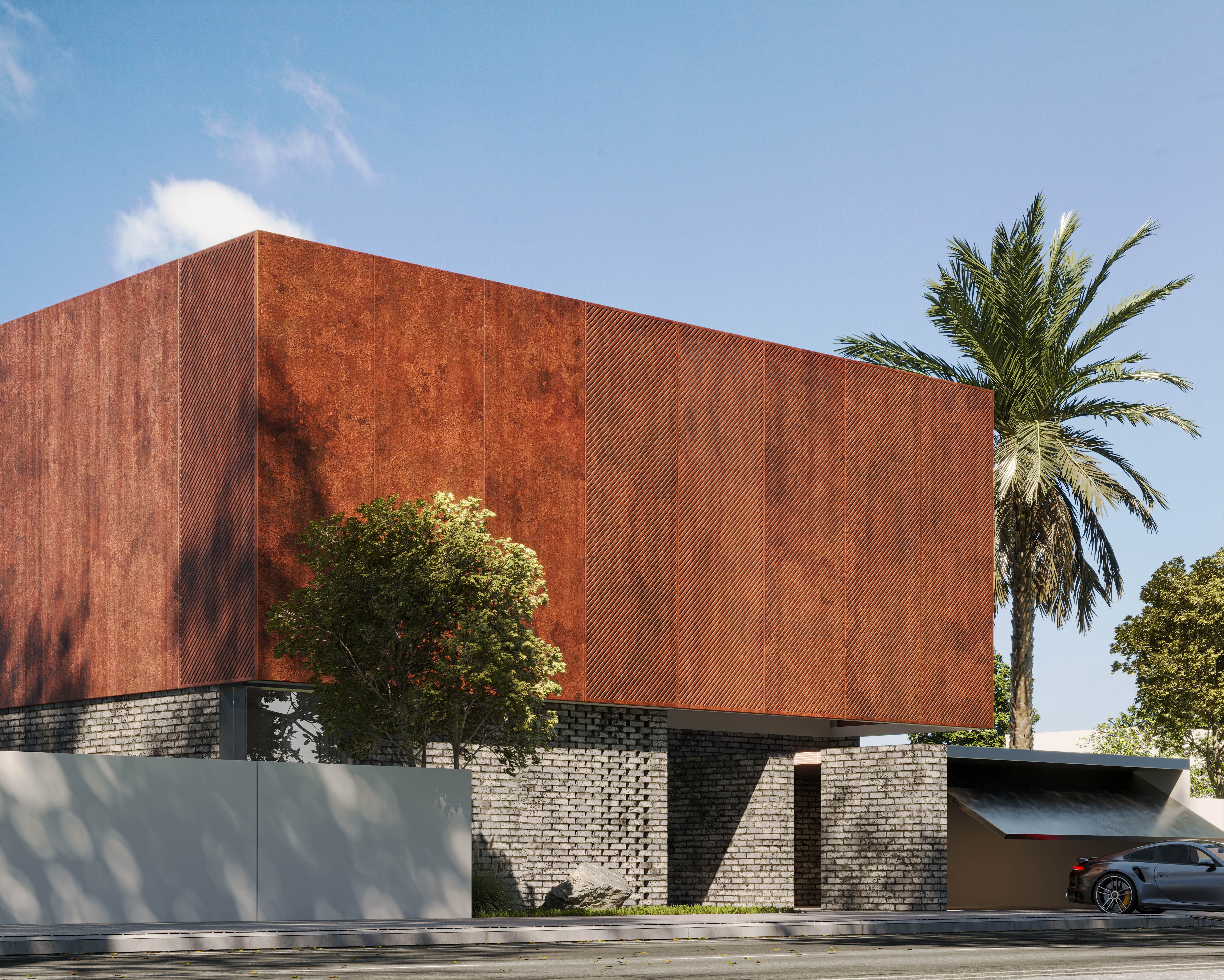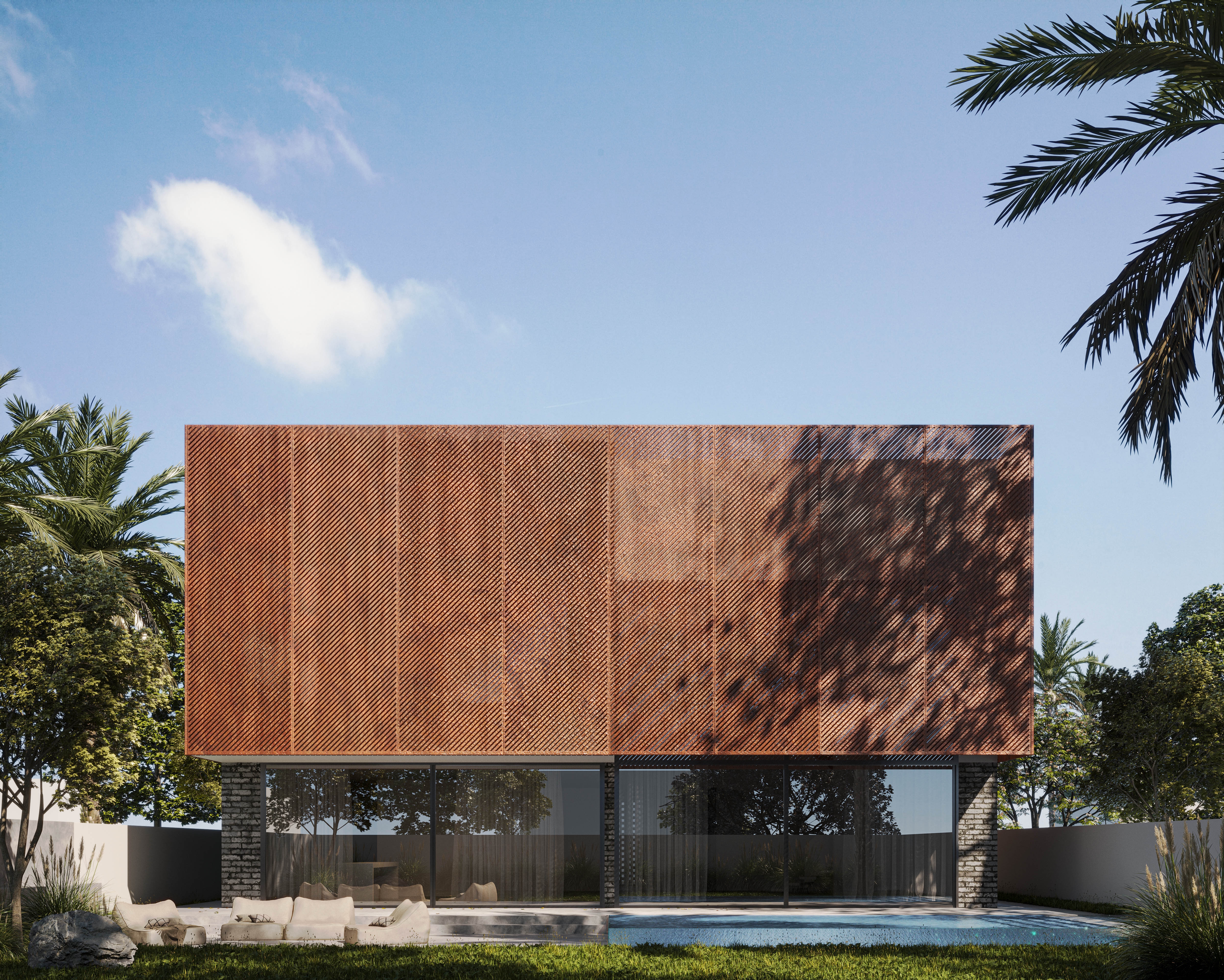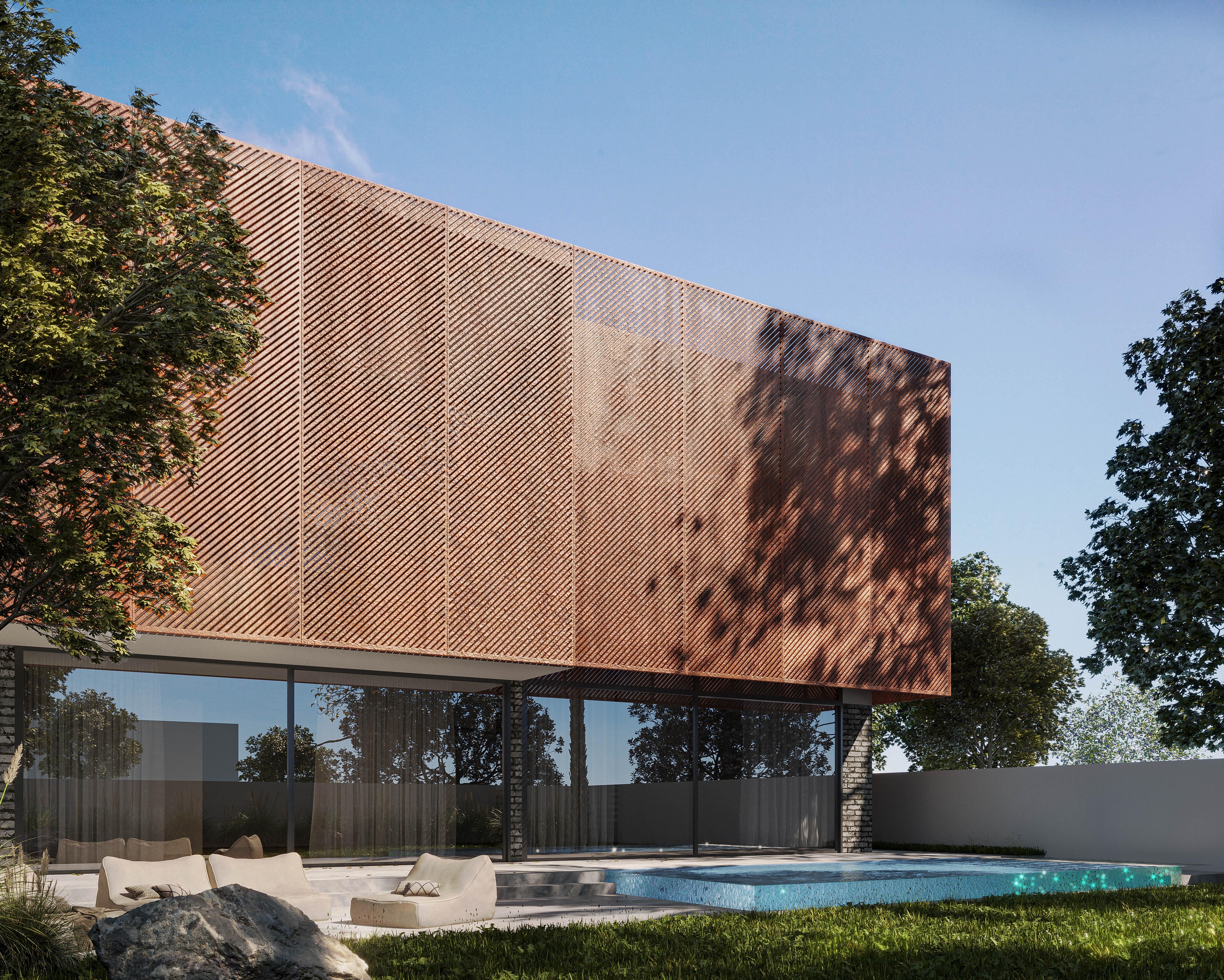 The façade draws inspiration from the timeless character of brick and the raw elegance of rustic metal, establishing a grounded yet refined identity. Perforated metal panels and aluminum elements introduce depth and rhythm while filtering natural light to create dynamic shadow patterns throughout the day. Expanses of glass and acrylic glazing blur the boundaries between interior and exterior spaces.
