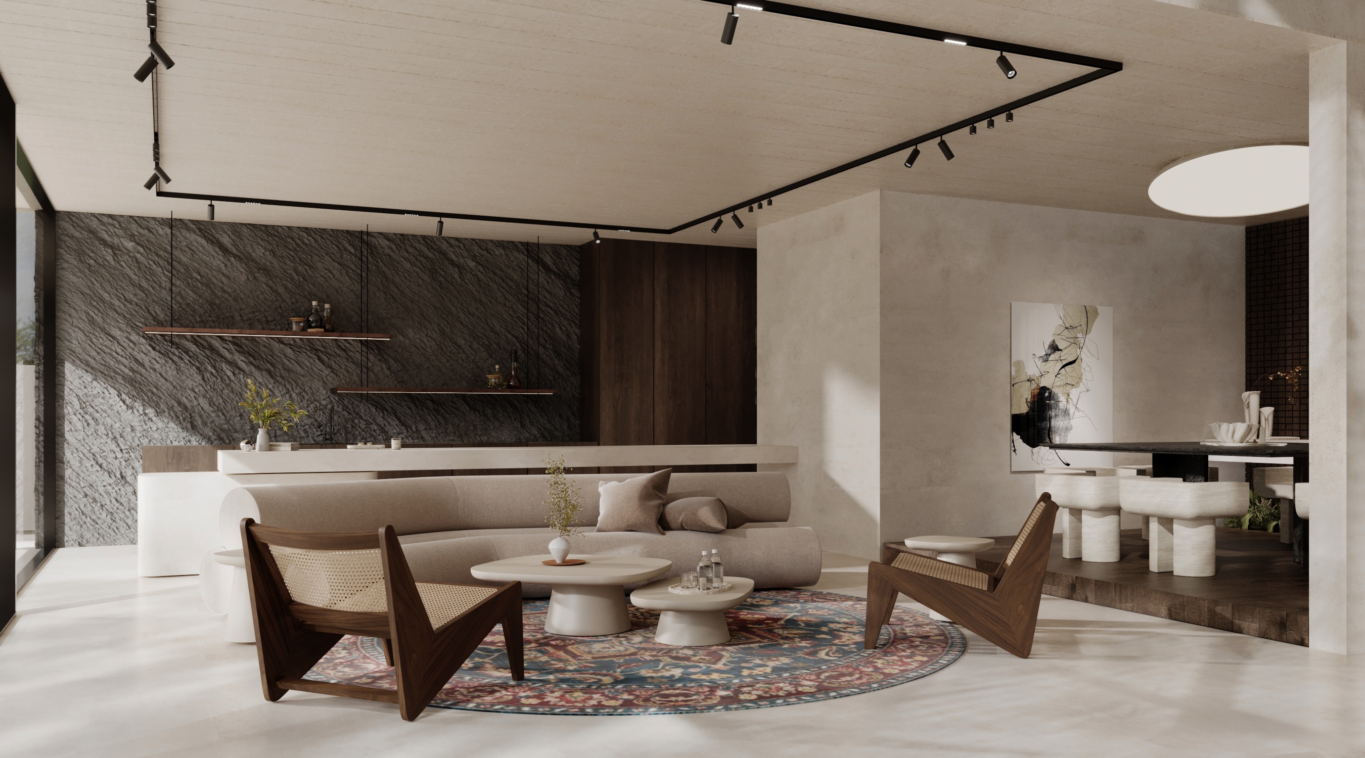 Located in Jabal Ali First–591, Dubai, UAE, this private villa explores the dialogue between rustic materiality and contemporary architectural expression. With a total built-up area of 500 square meters, the residence is conceived as a layered composition of textures, light, and spatial transitions that enhance both visual richness and everyday livability.