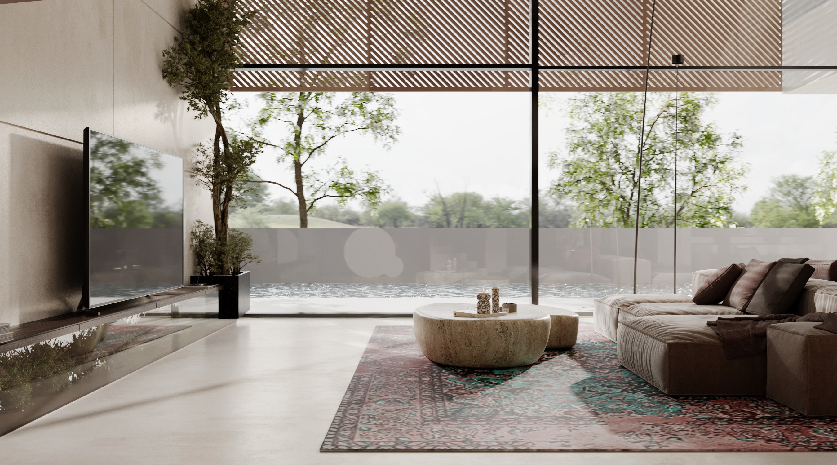 Modern detailing is integrated with handcrafted warmth to form a balanced architectural language. An outdoor pool anchors the exterior as a reflective focal point, amplifying the interplay of water, light, and material. Thoughtful massing and material transitions generate a cohesive visual narrative, offering a contemporary residential retreat that is both expressive and enduring